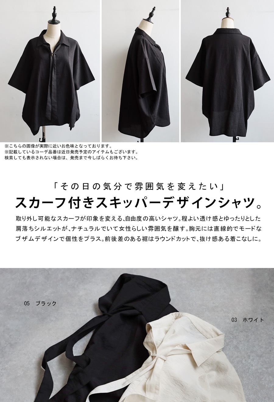 雰囲気まで纏うような、洗練された印象に導いてくれるスカーフ付きスキッパーシャツが登場しました。