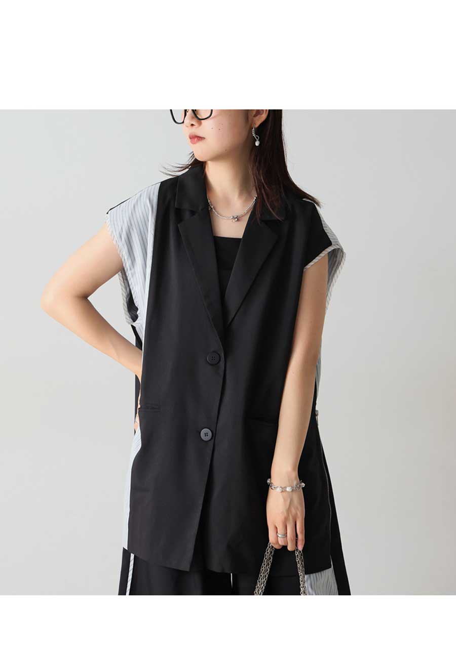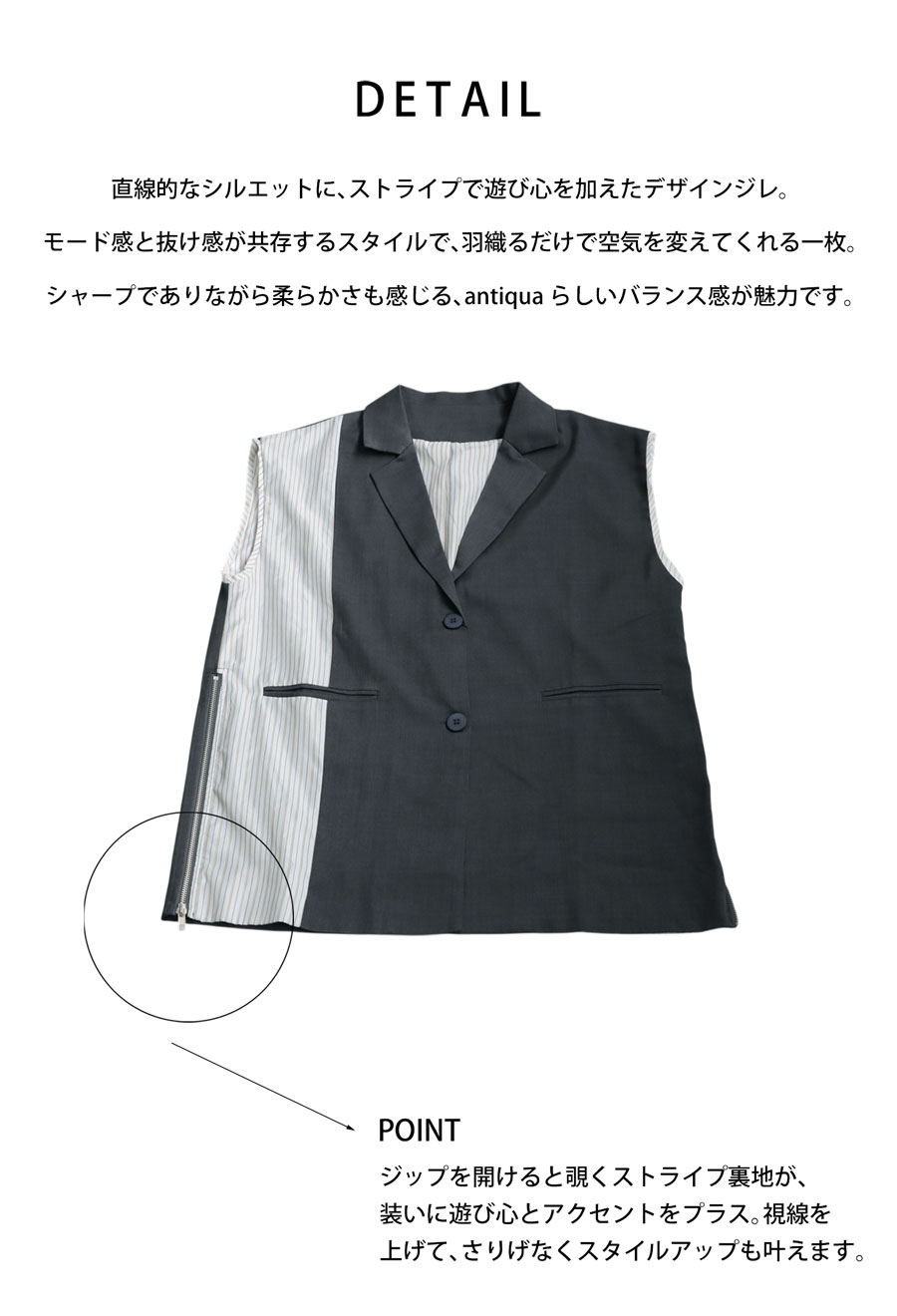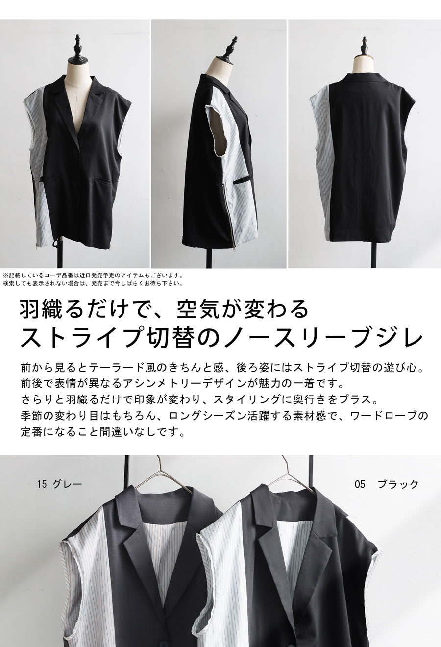 羽織るだけで着こなしに洗練されたモード感を添える、ストライプ切替ノースリーブジレが登場しました。