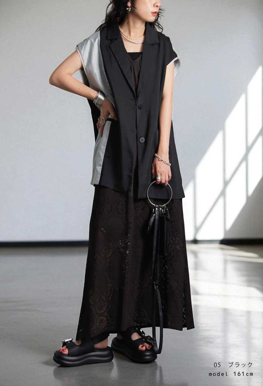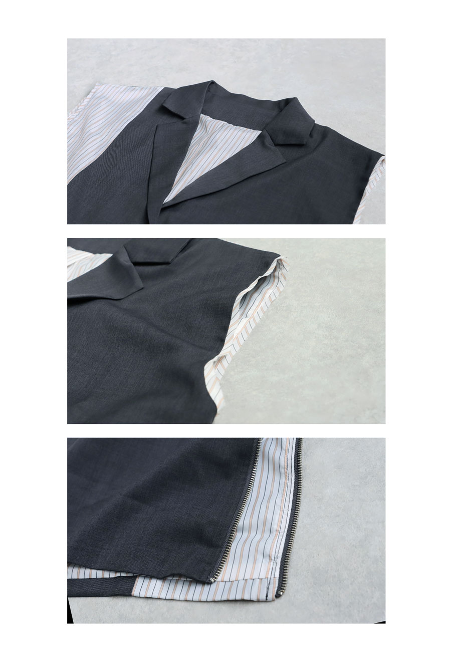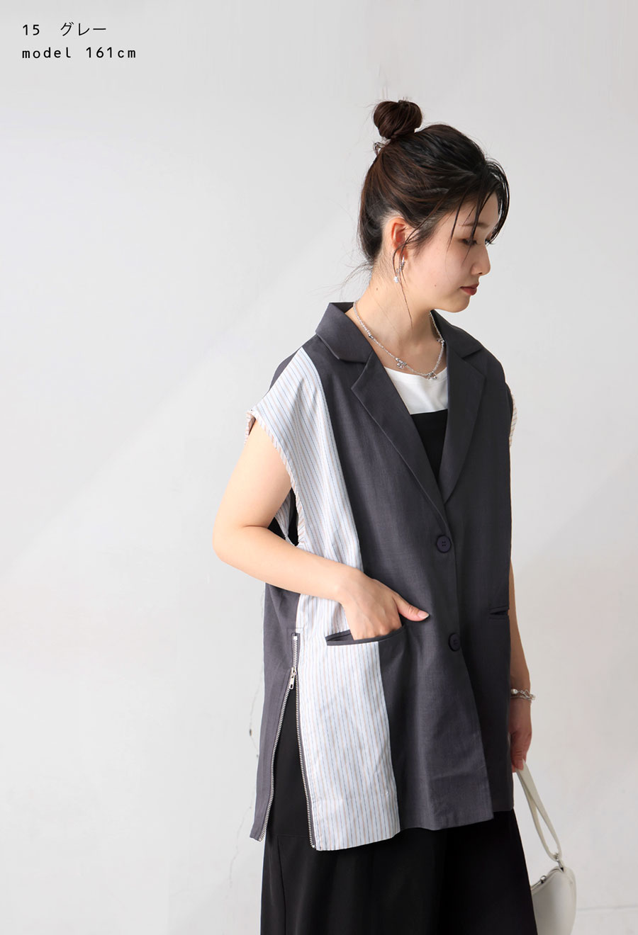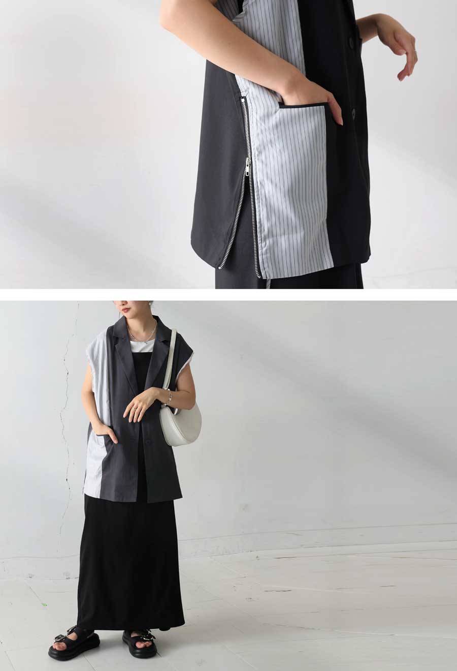 羽織るだけで着こなしに洗練されたモード感を添える、ストライプ切替ノースリーブジレが登場しました。