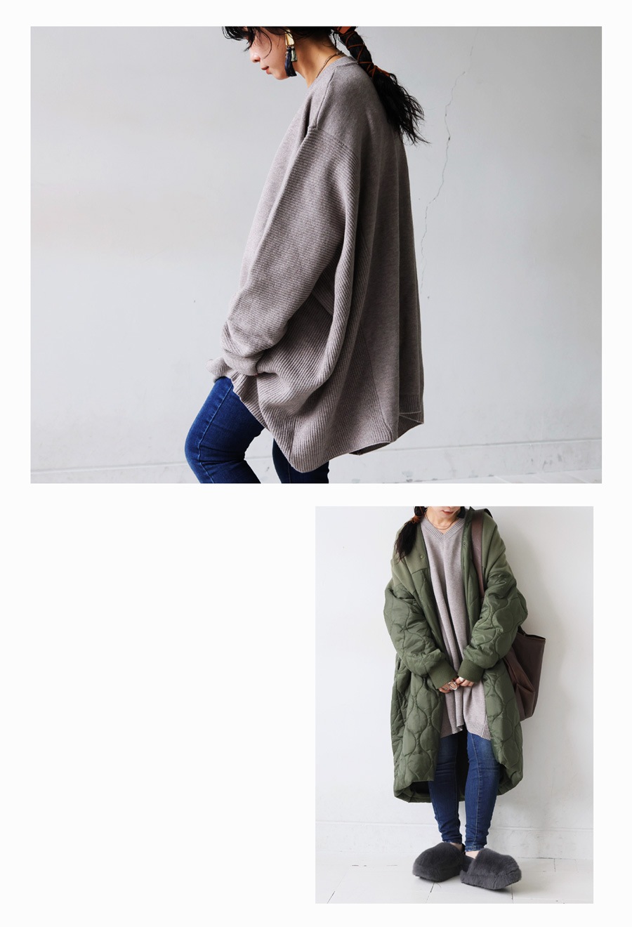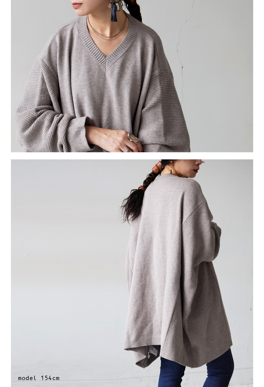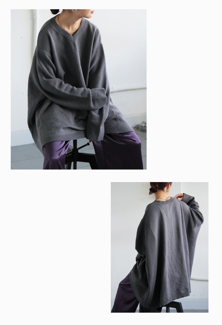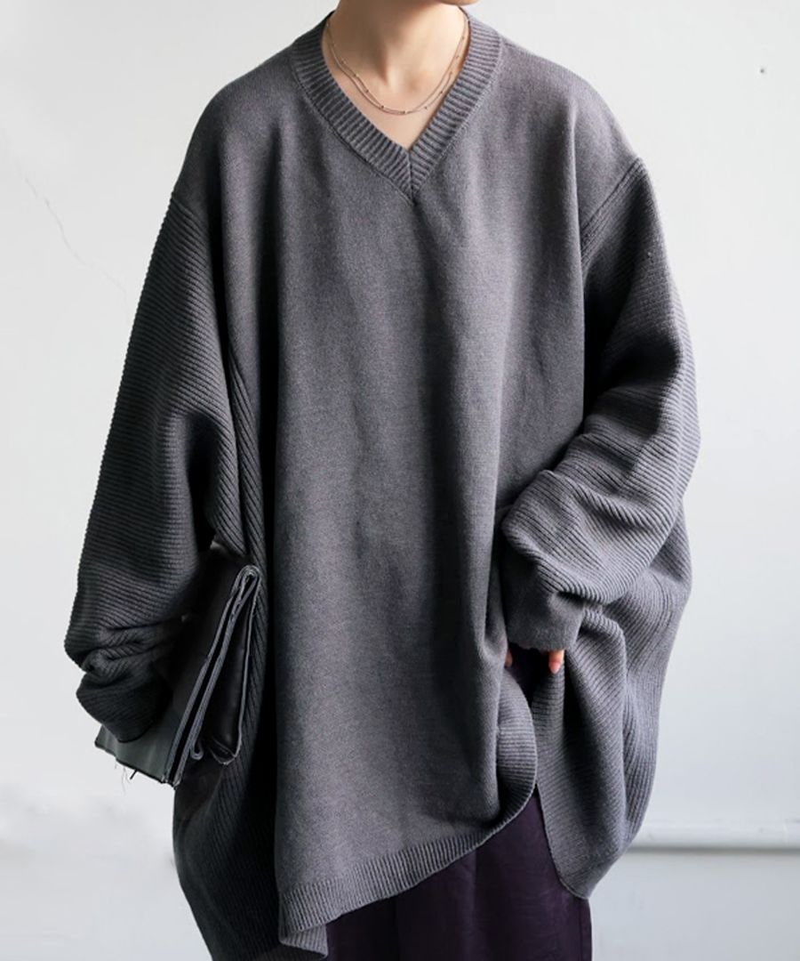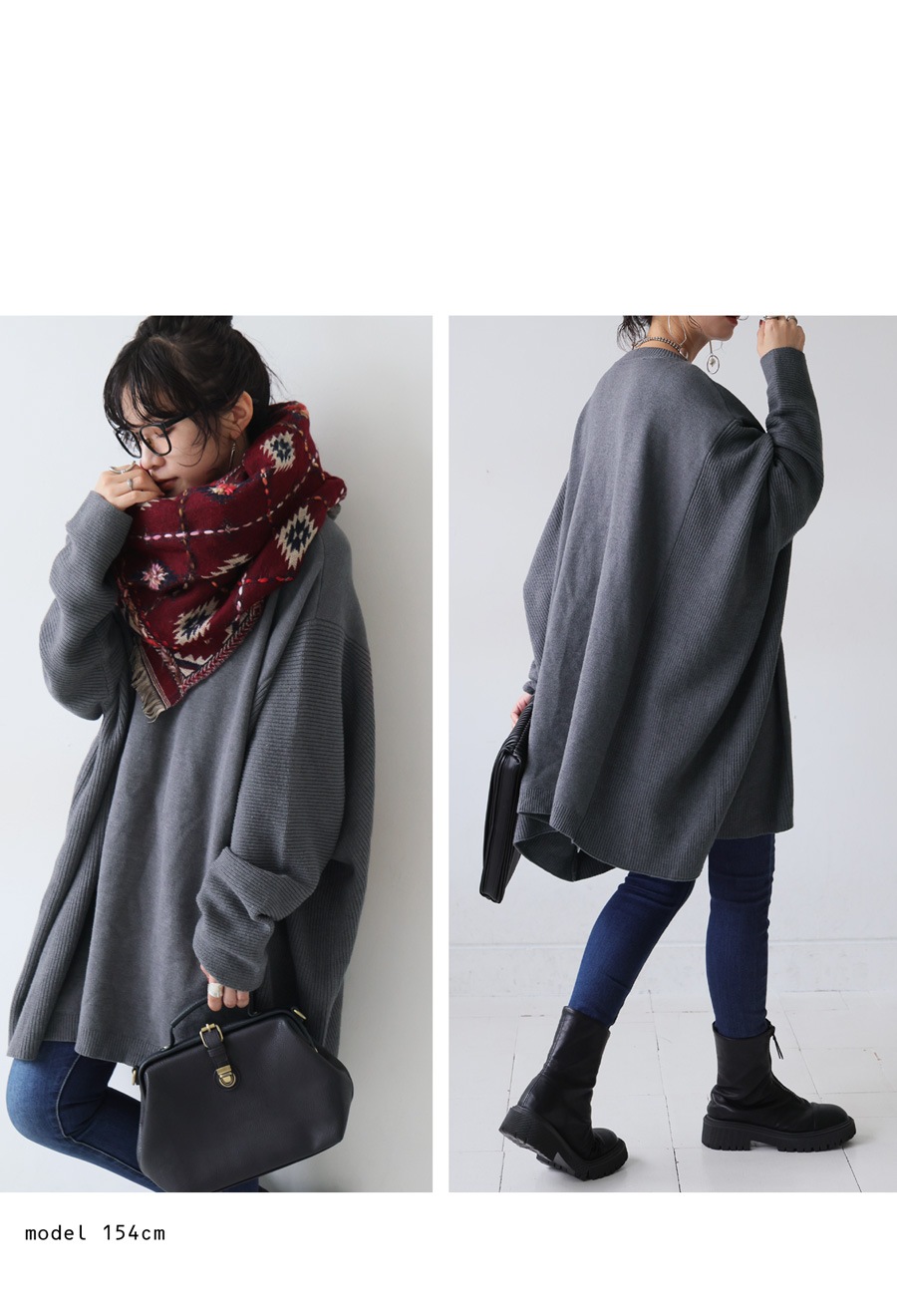 肩の力を抜いて着られるドロップショルダーと、袖から裾にかけてのリブ編み切替が立体感と動きを与えます。