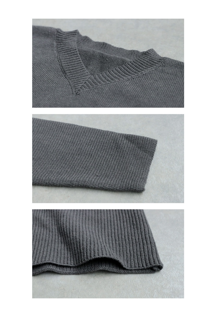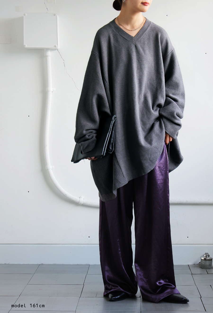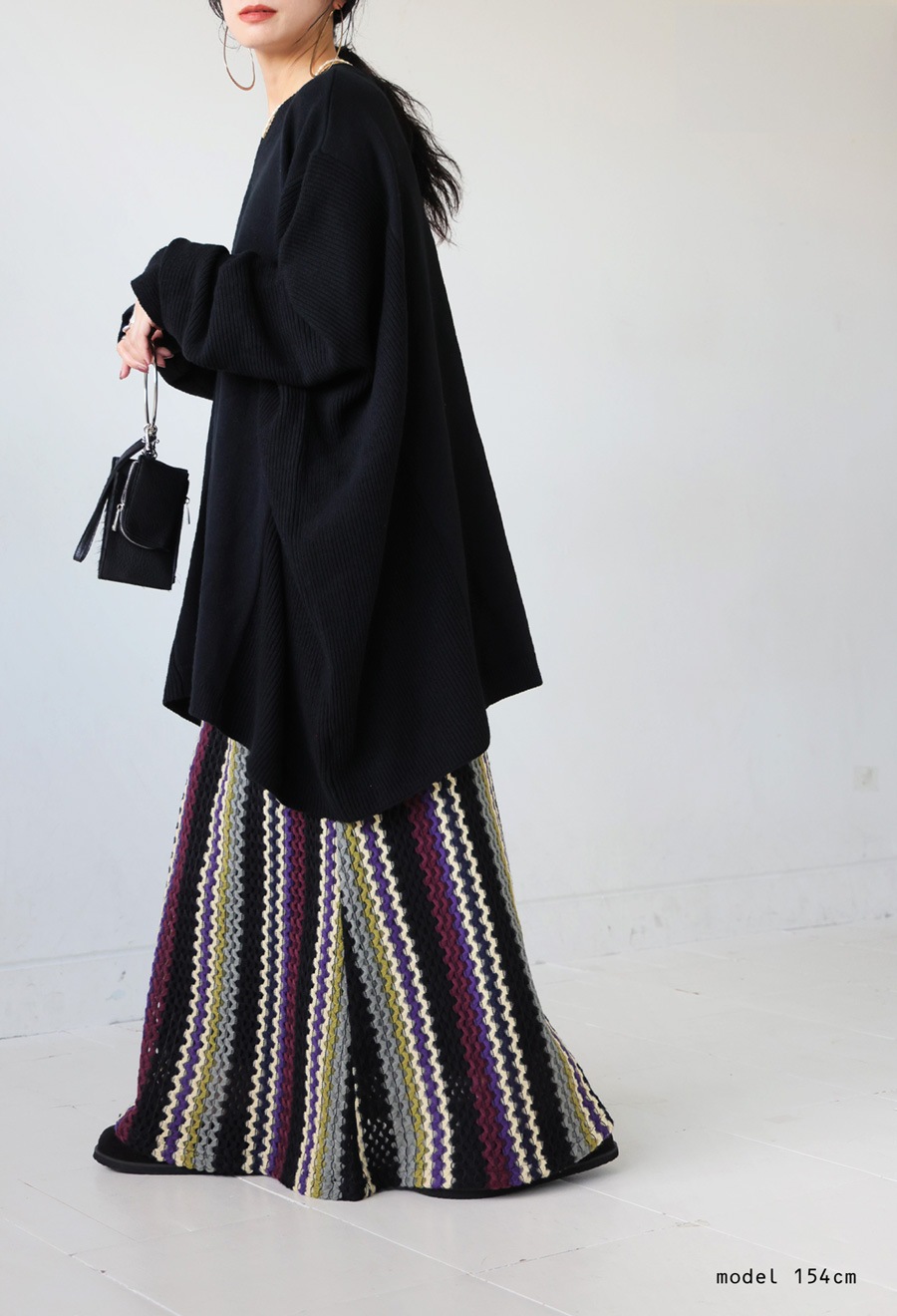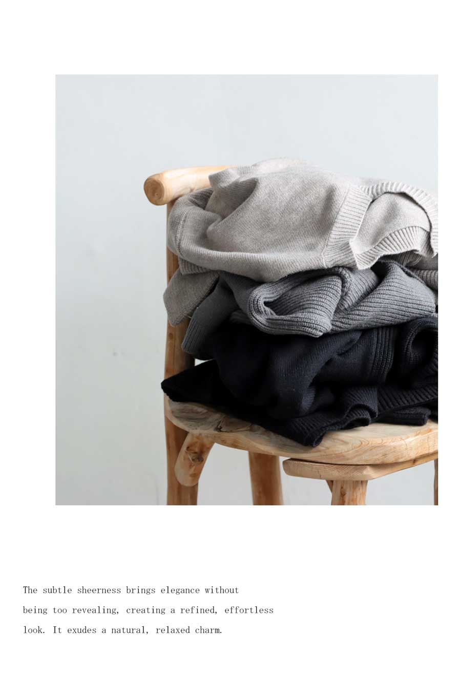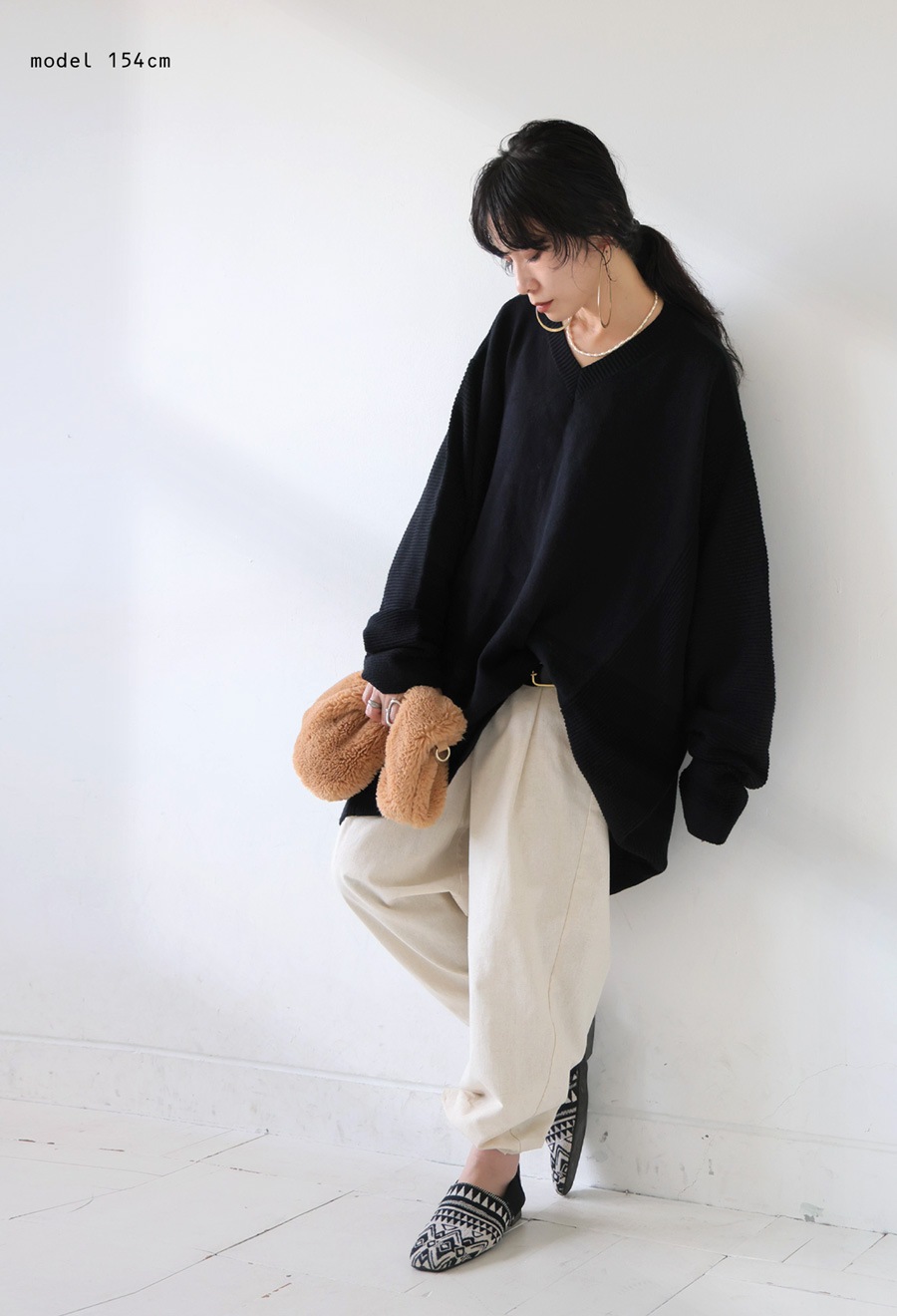 肩の力を抜いて着られるドロップショルダーと、袖から裾にかけてのリブ編み切替が立体感と動きを与えます。
