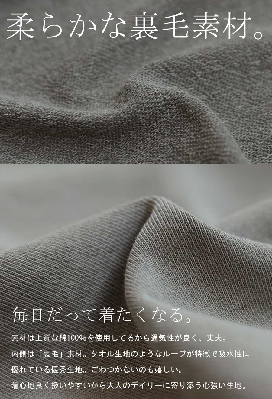 素材は綿100%で裏毛のループが特徴的な生地感。通気性が良く、吸水性にも優れた快適な着心地です。