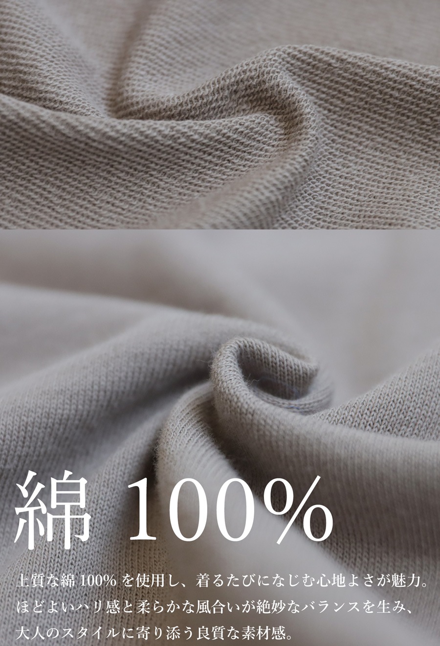 素材には綿100%の裏毛素材を使用。やわらかな肌ざわりとほどよい厚みで、デイリー使いにもぴったりです。