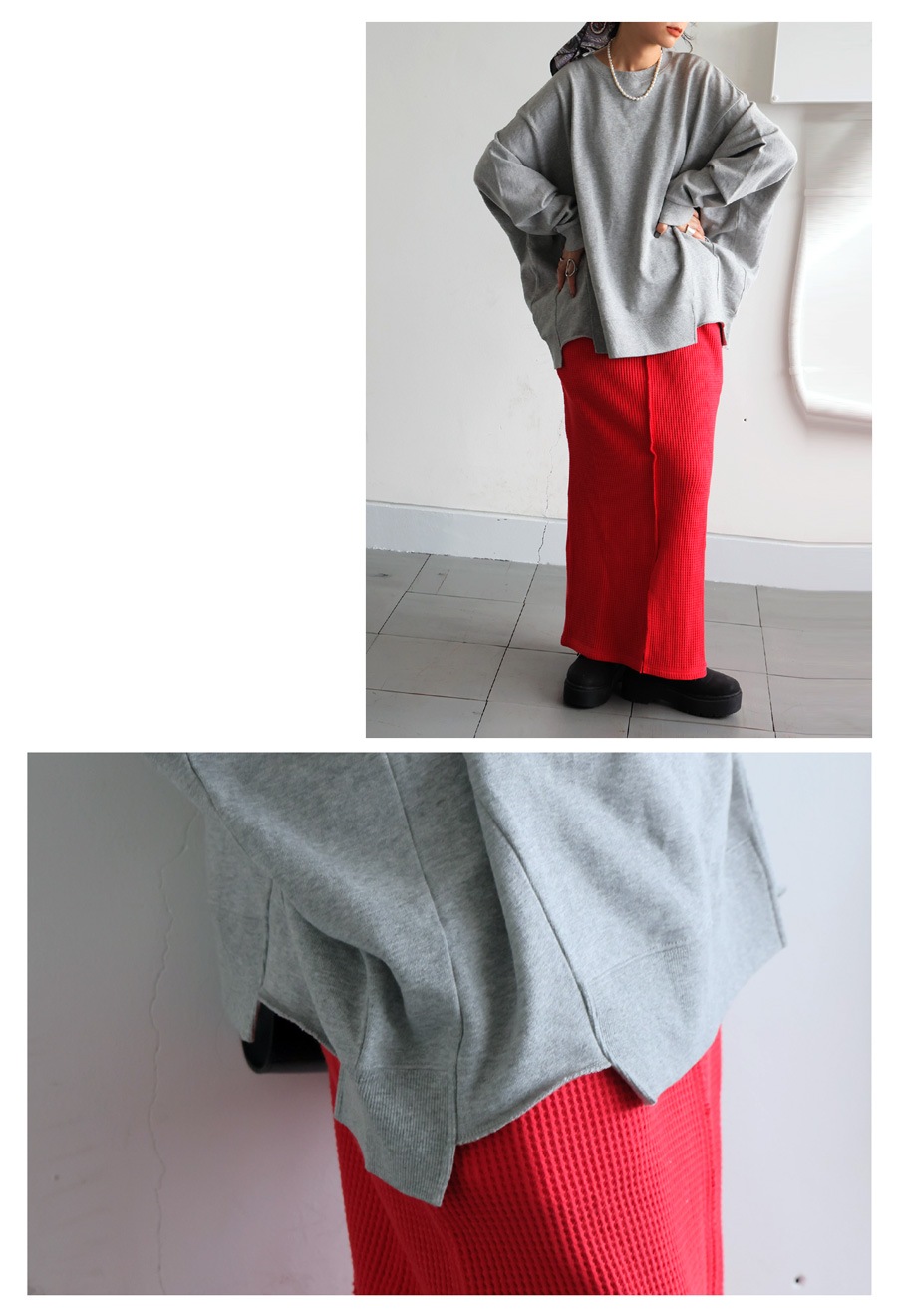 袖丈は長袖で、袖口と裾にリブを施すことで全体を引き締め、だらしなくならない印象に仕上げています。