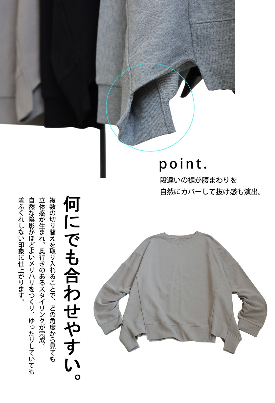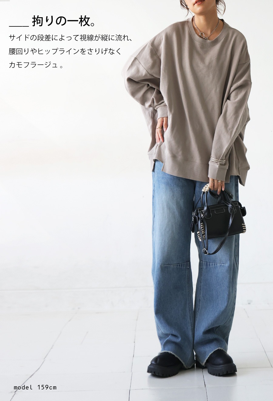 サイドに段差をつけた裾デザインが腰まわりをさりげなくカバーし、立体感のある着こなしを演出します。