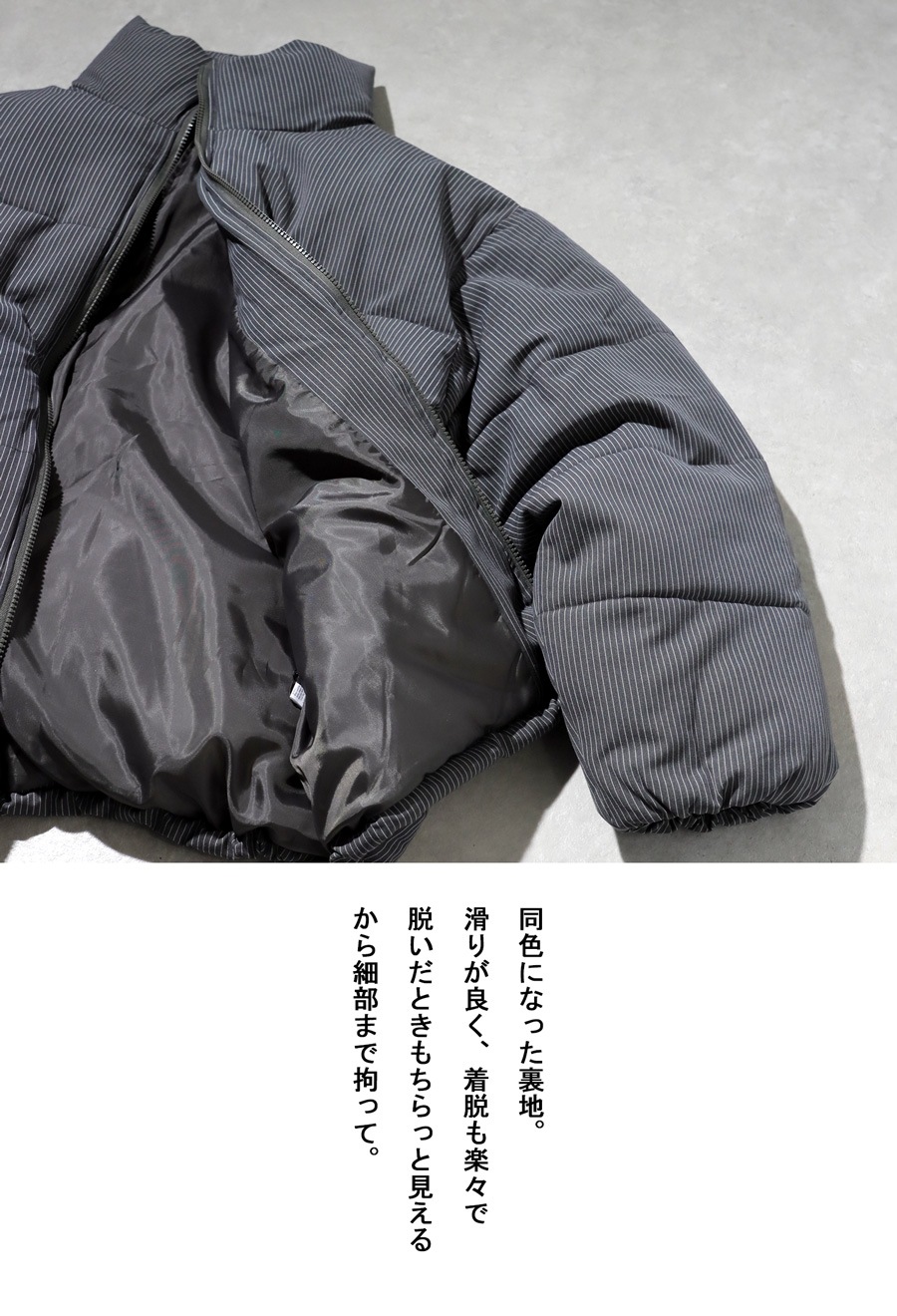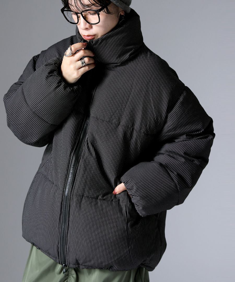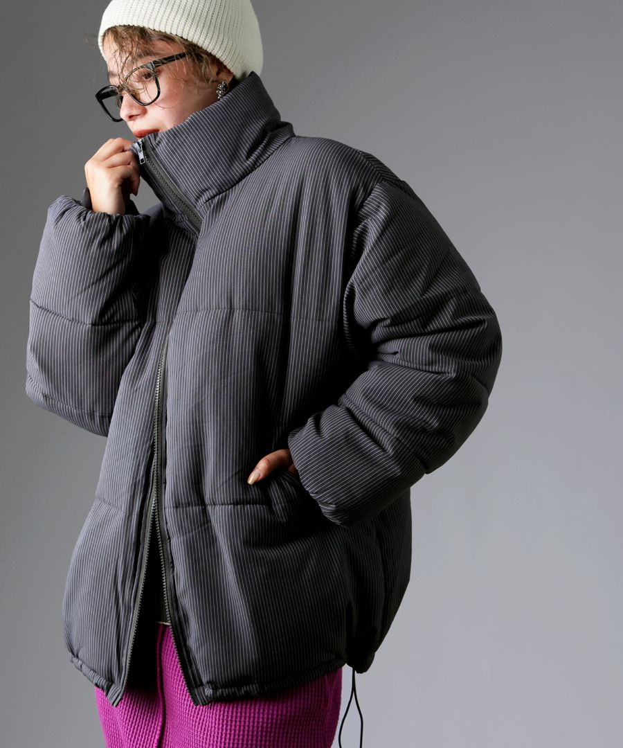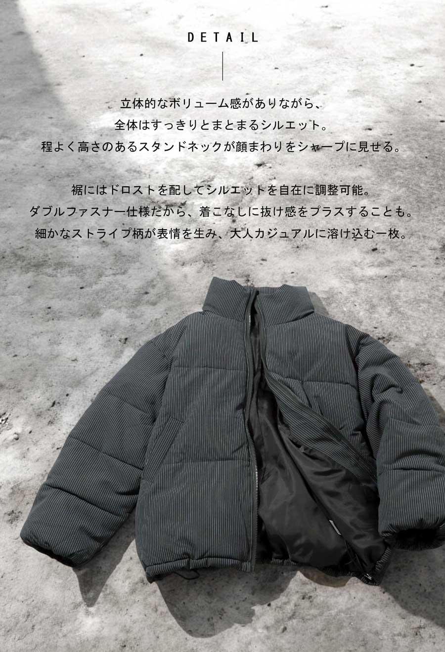 ストライプ柄が大人の雰囲気を引き立てる中綿ジャケットです。