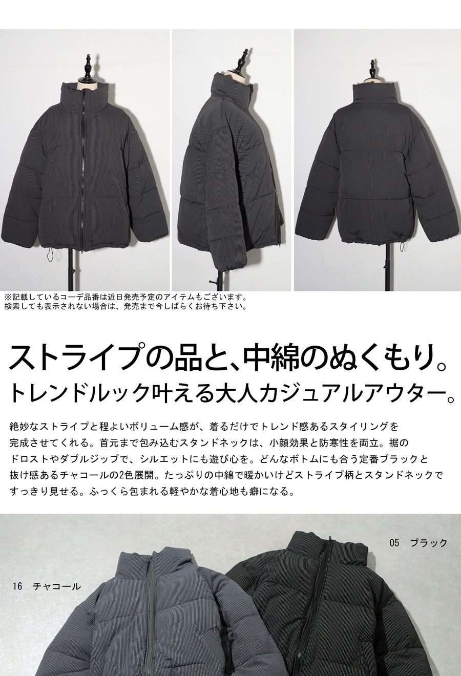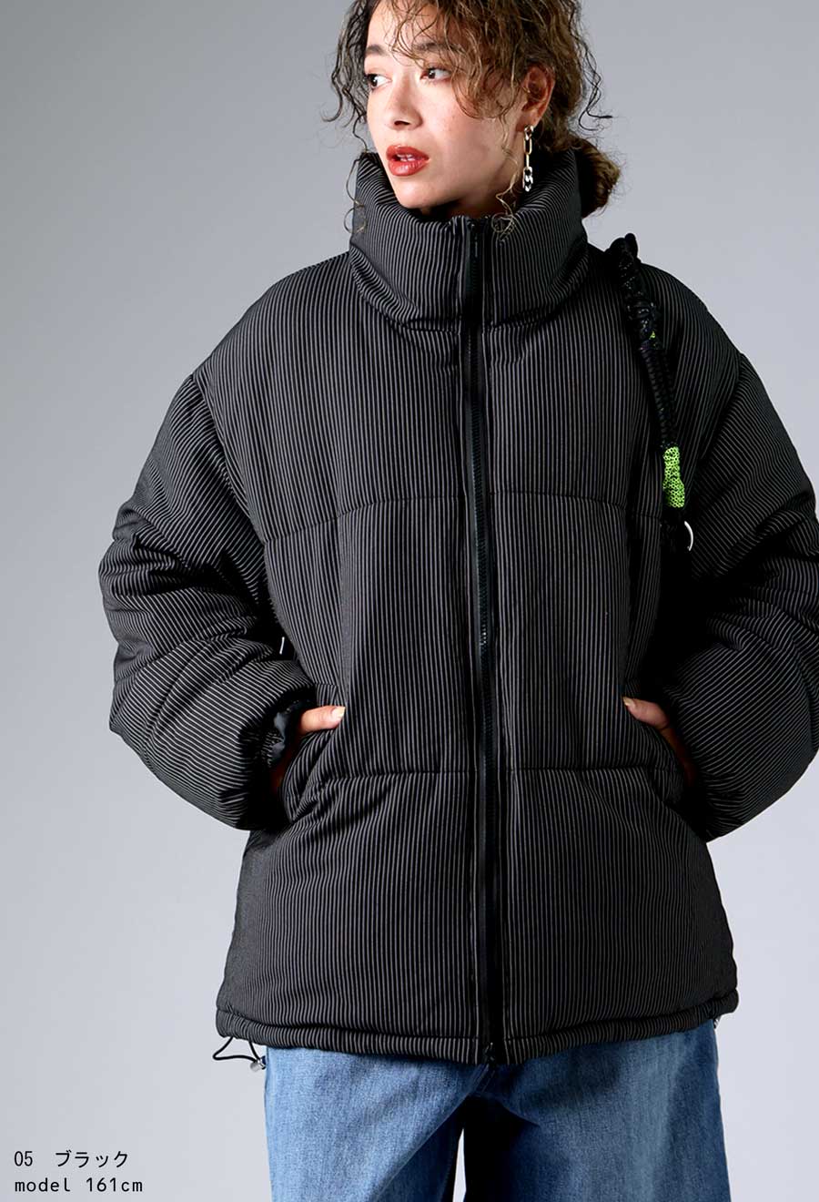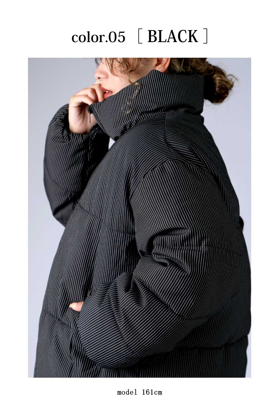 ストライプ柄が大人の雰囲気を引き立てる中綿ジャケットです。