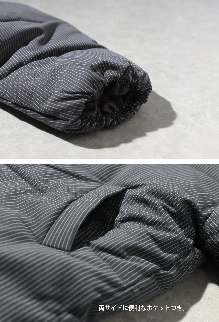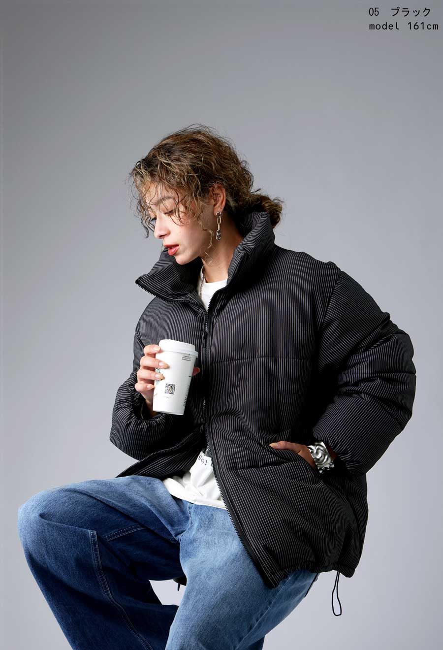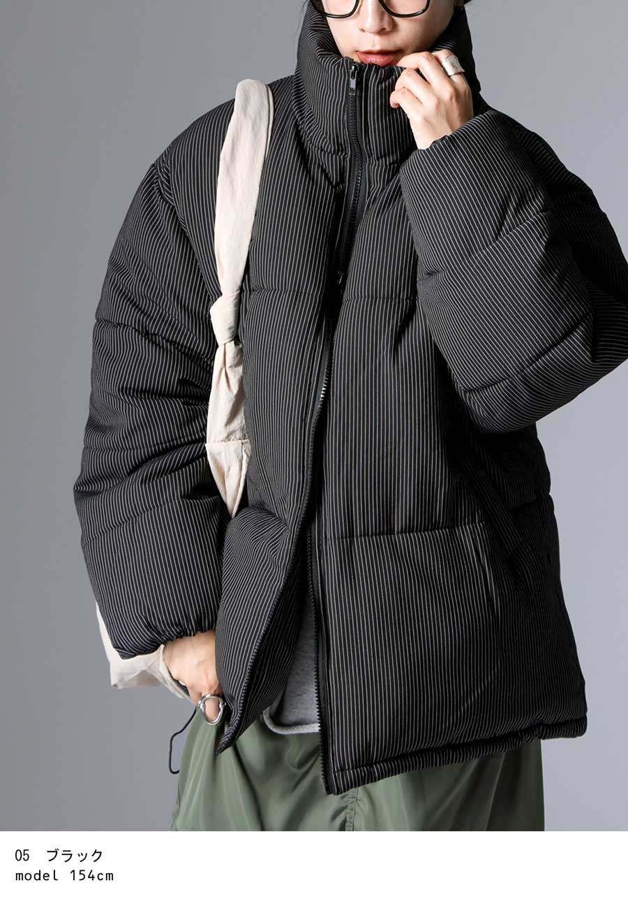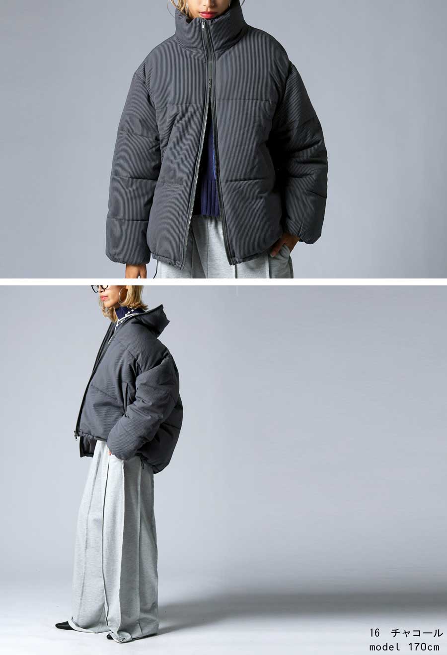 ストライプ柄が大人の雰囲気を引き立てる中綿ジャケットです。