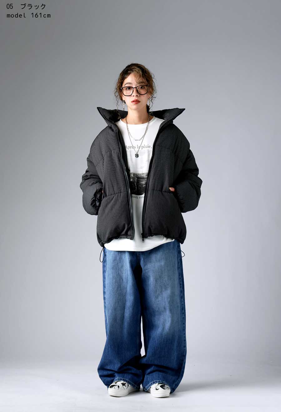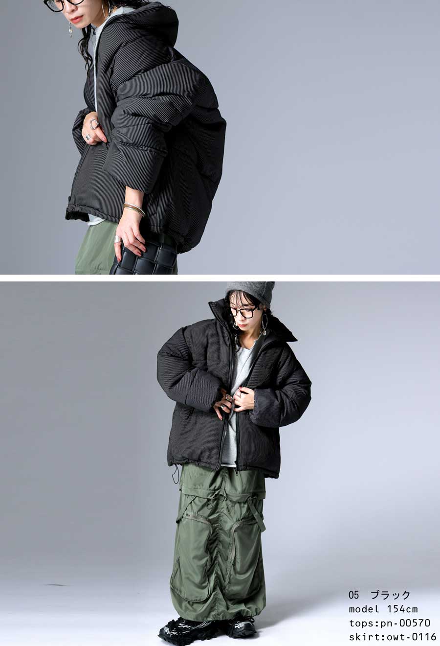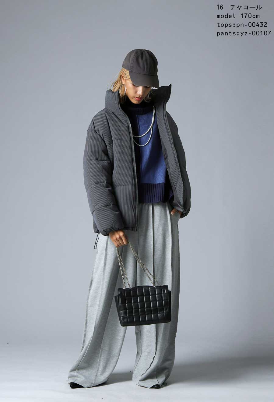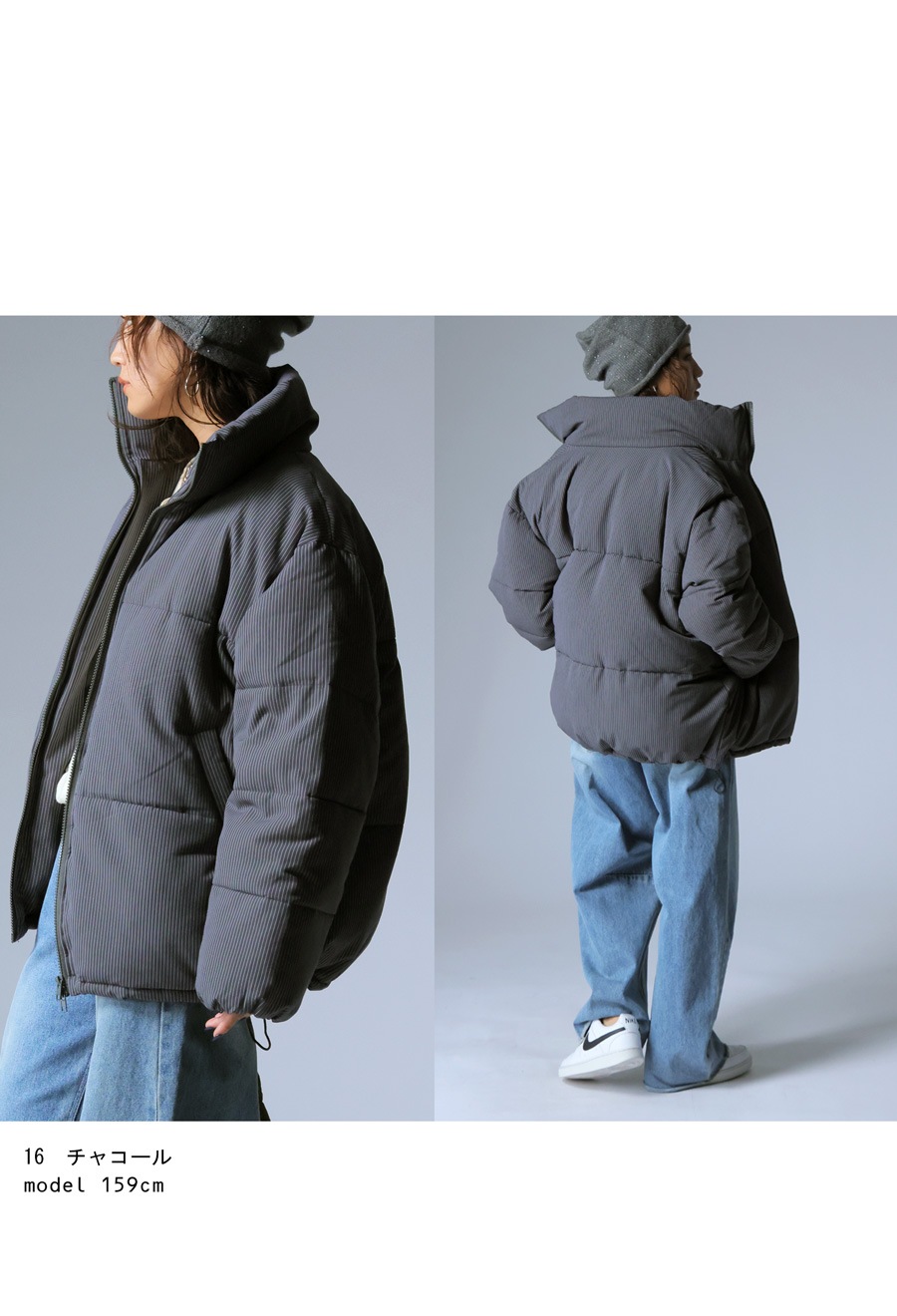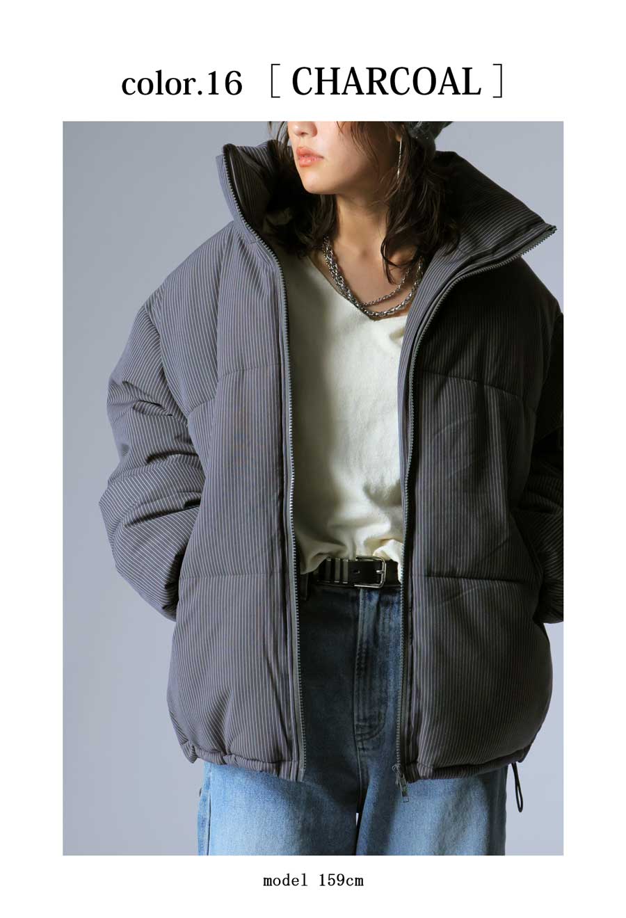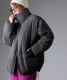 スタンドネック(ハイネック)のネックラインが首元をすっきりと包み込み、防寒性と小顔効果を叶えます。