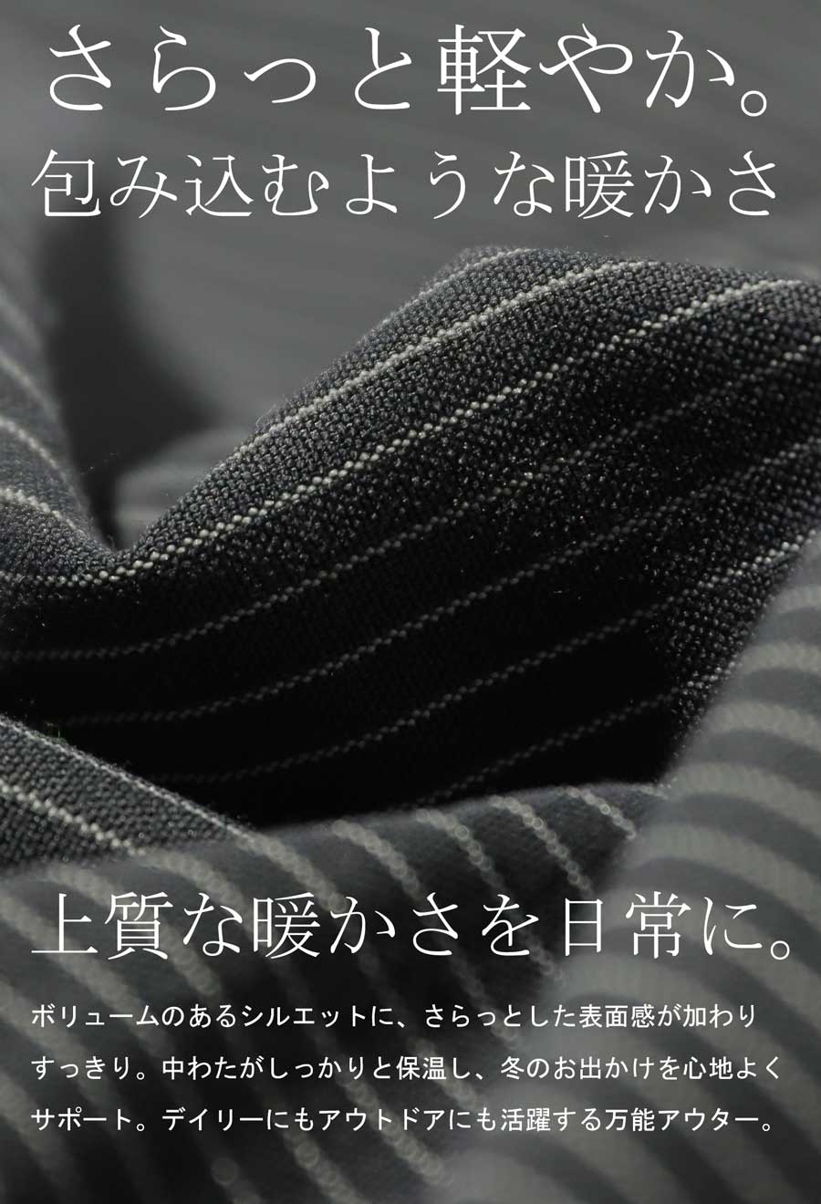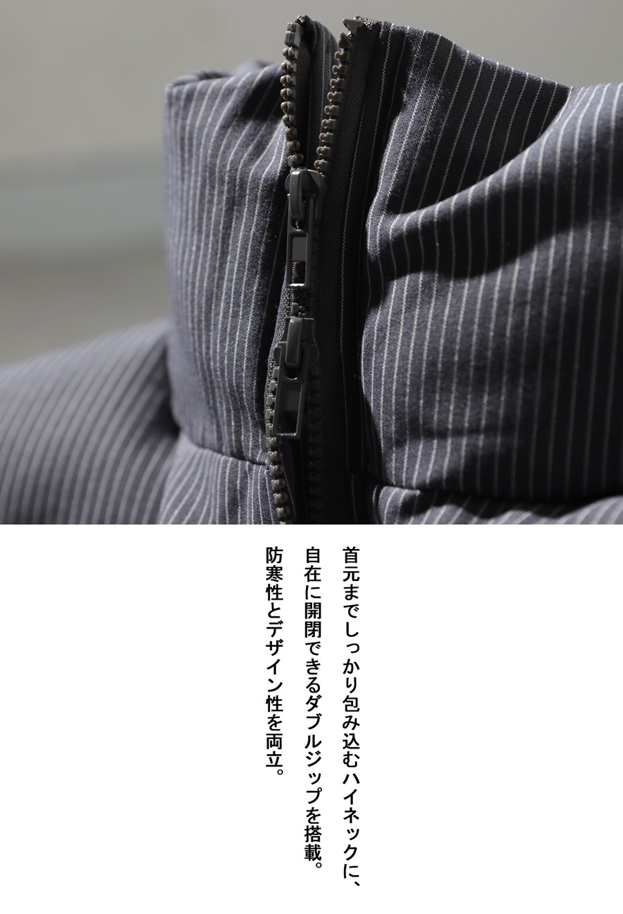 ダブルジップで着こなしにアレンジを加えられ、ストライプ柄が洗練された印象をプラス。