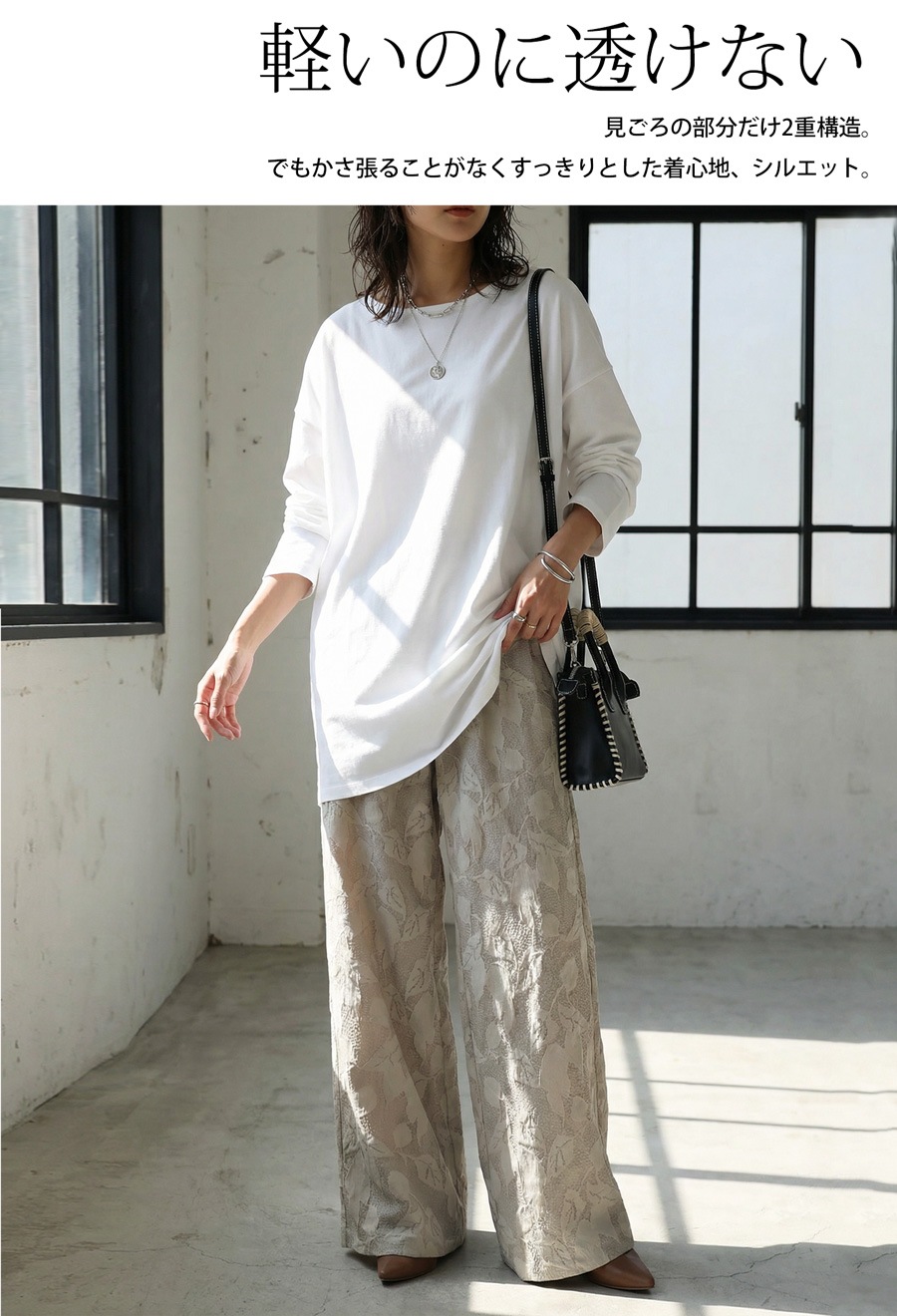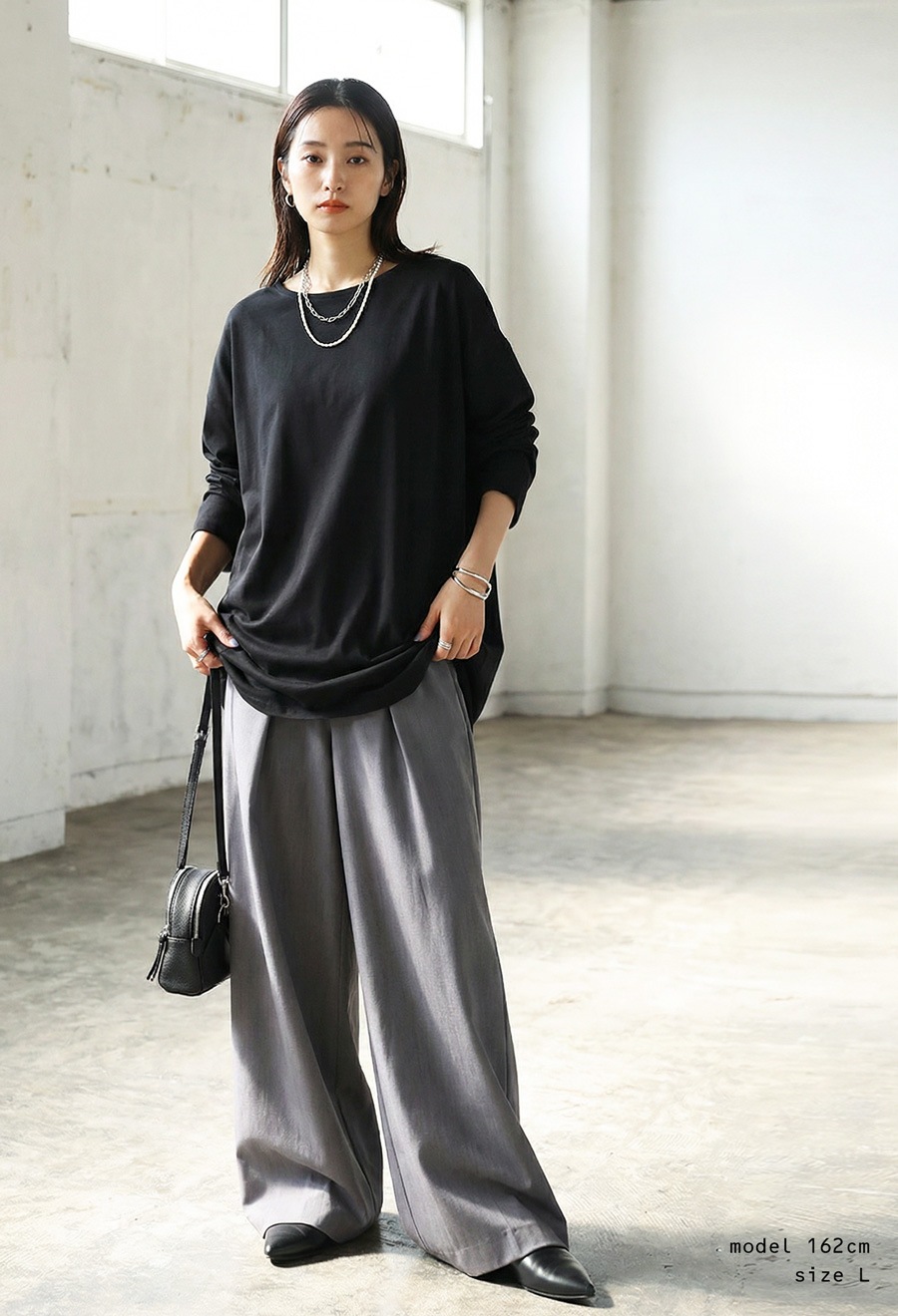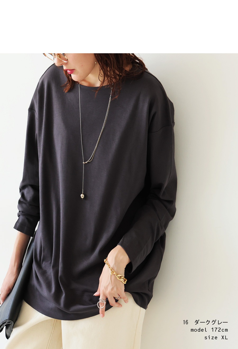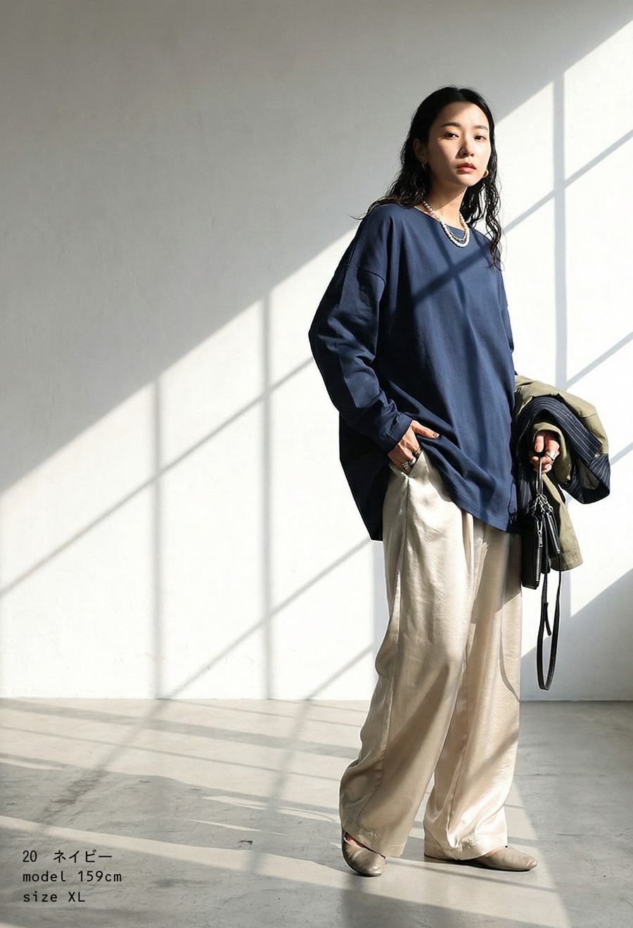形状はドロップショルダーで、リラックス感がありながらもだらしなく見えず、きれいめにもカジュアルにも対応。