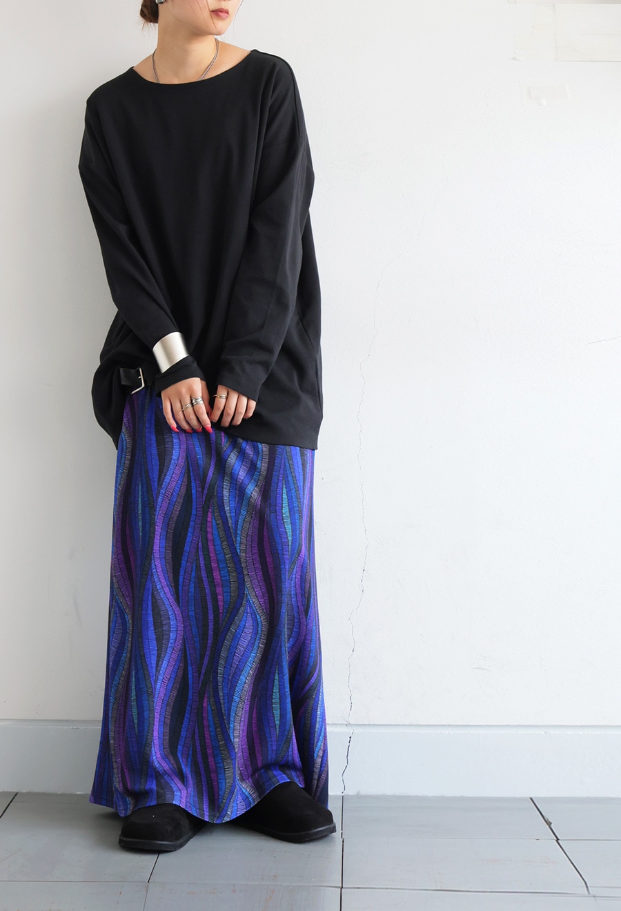 袖丈は手首まで届くロングスリーブで、適度にゆとりがあるため、クシュっとたるませたラフな着こなしも可能。