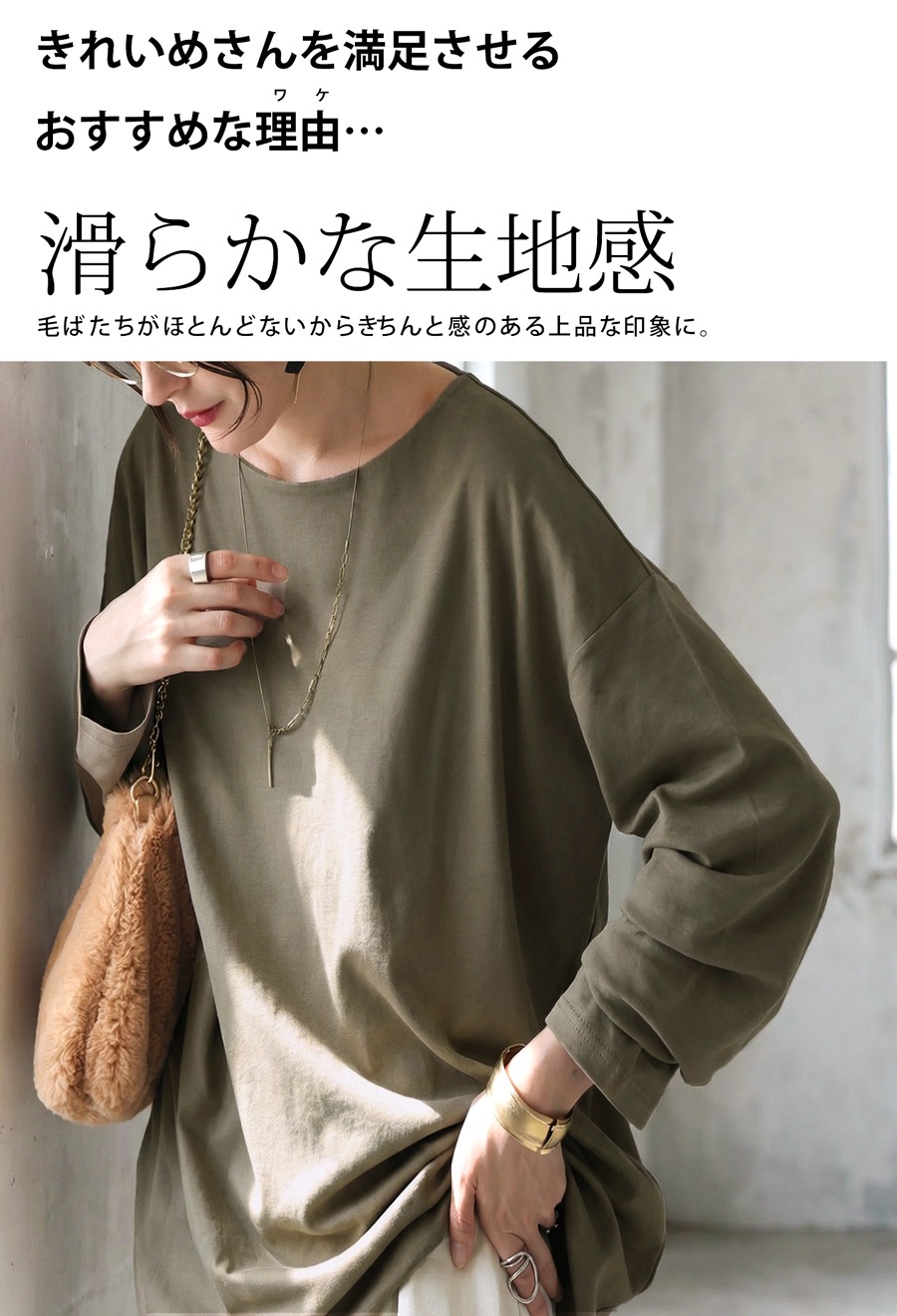 毛羽立ちや毛玉にもなりにくく、毎日の着回しに頼れる一枚です。