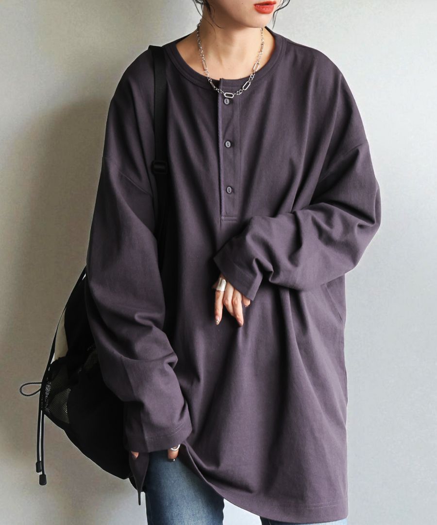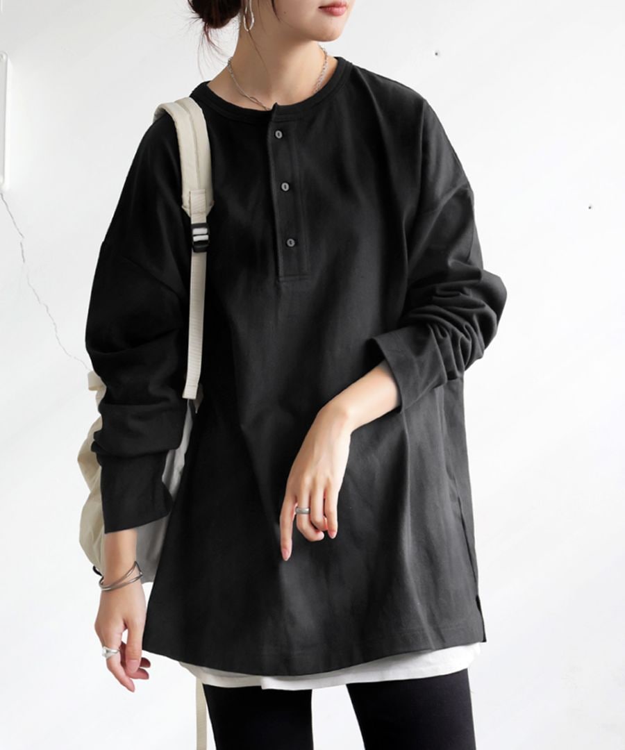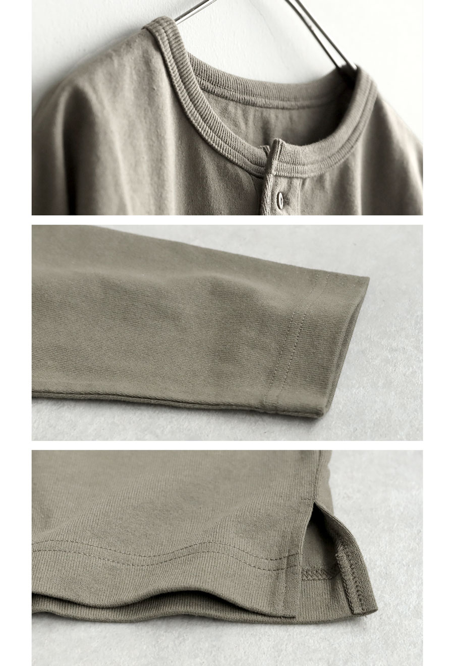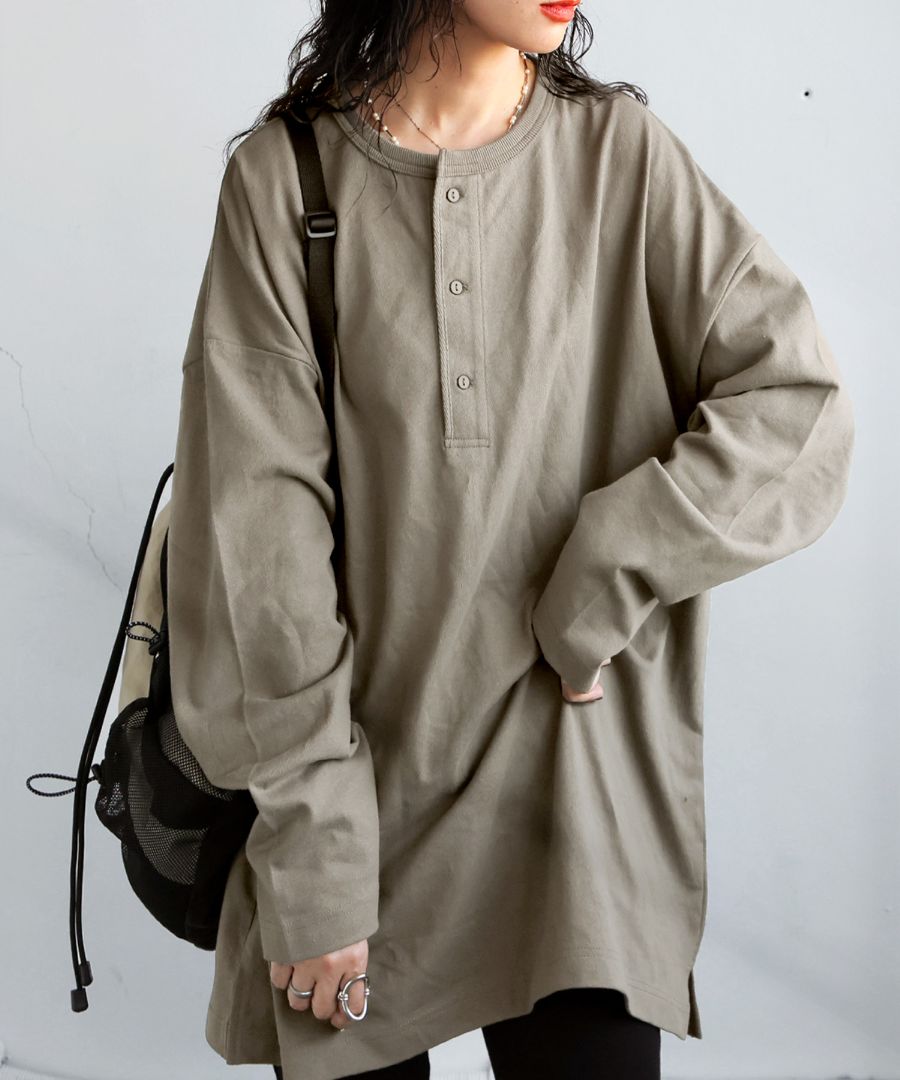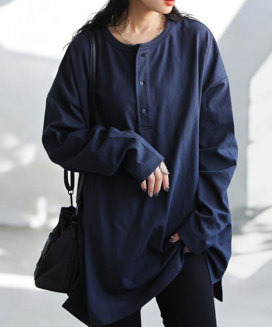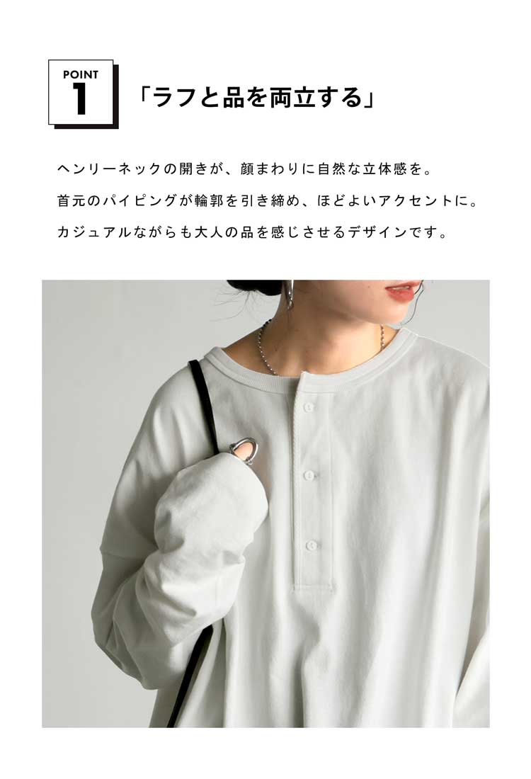 ネックラインは程よい抜け感を演出するヘンリーネックで、パイピング仕立てが上品な印象を添えます。