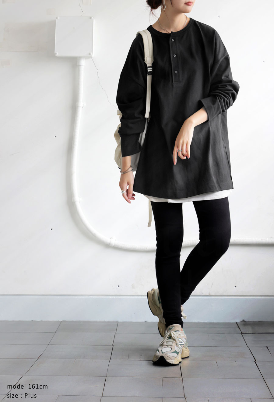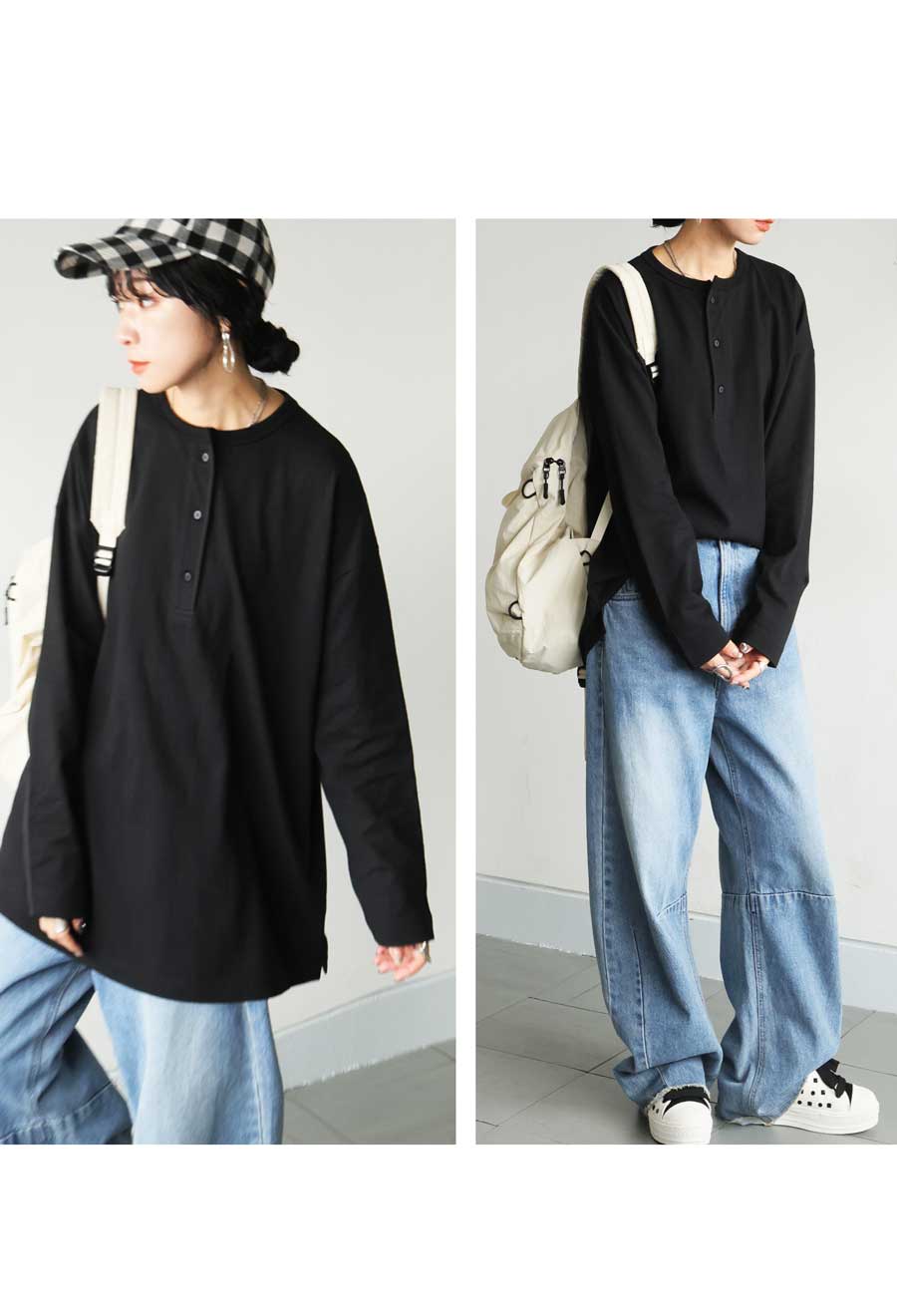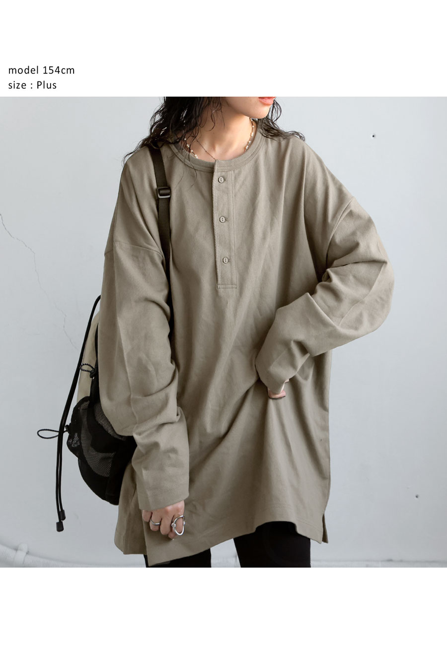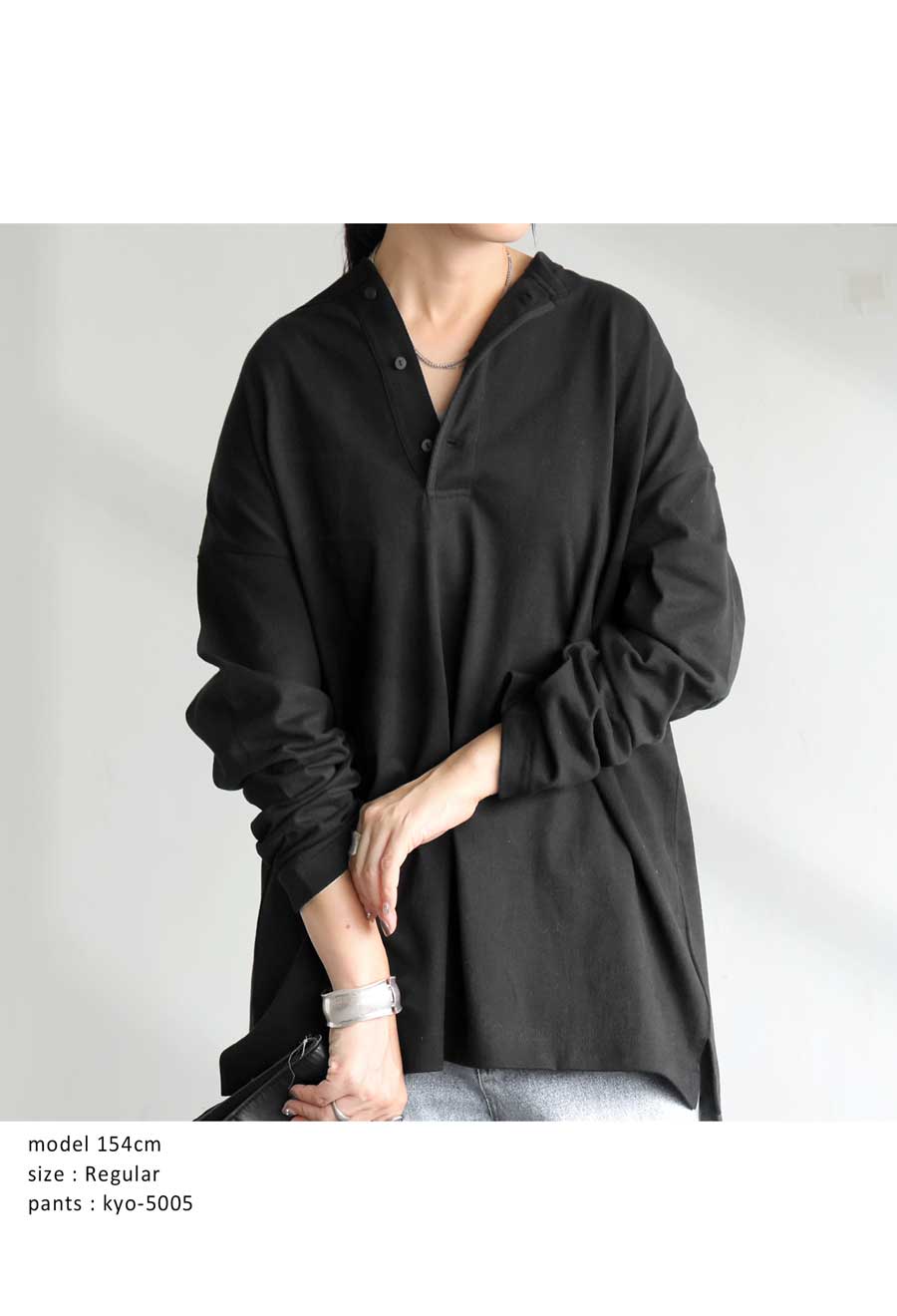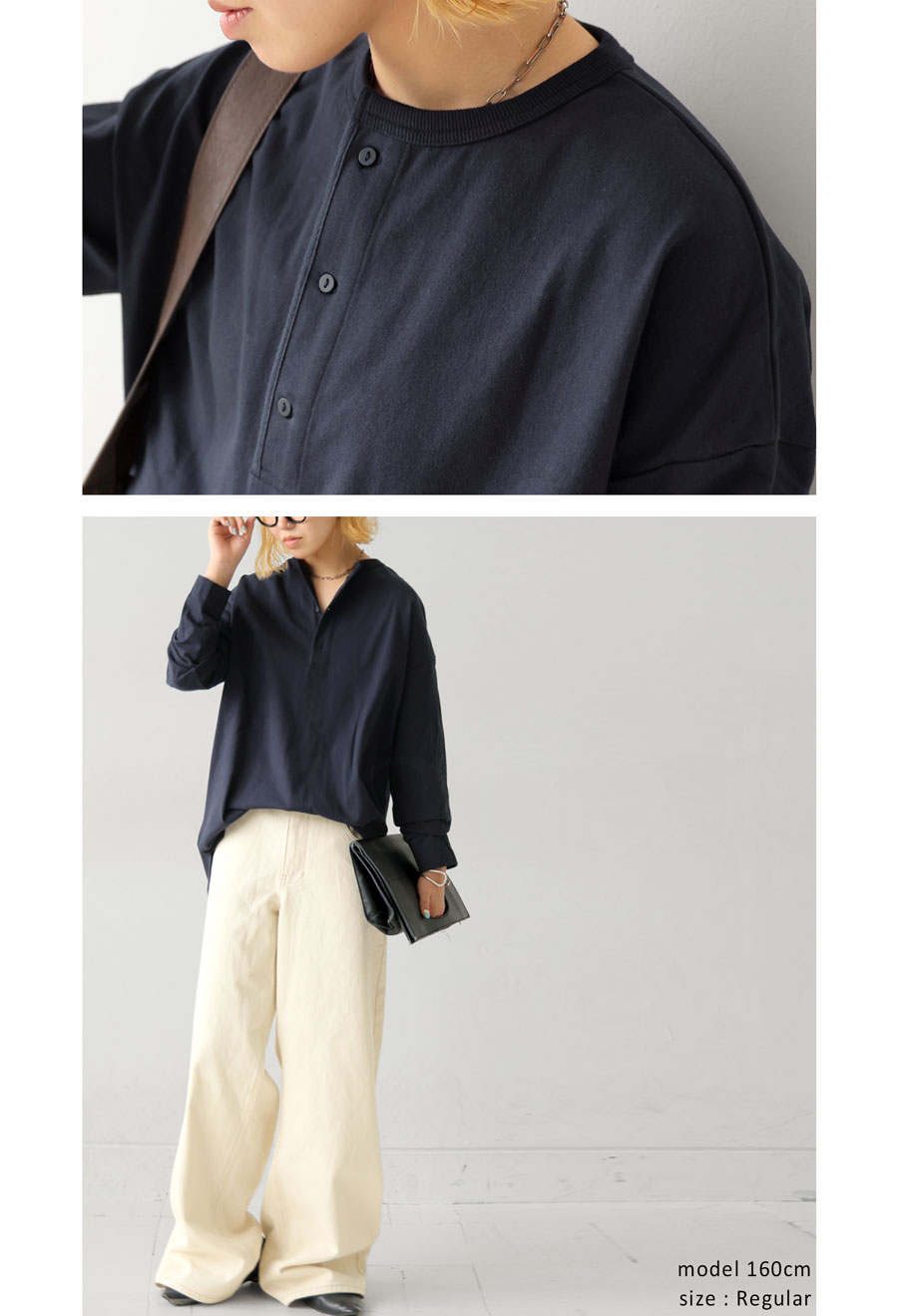 ネックラインは程よい抜け感を演出するヘンリーネックで、パイピング仕立てが上品な印象を添えます。