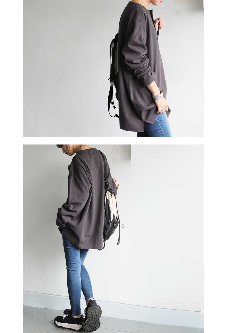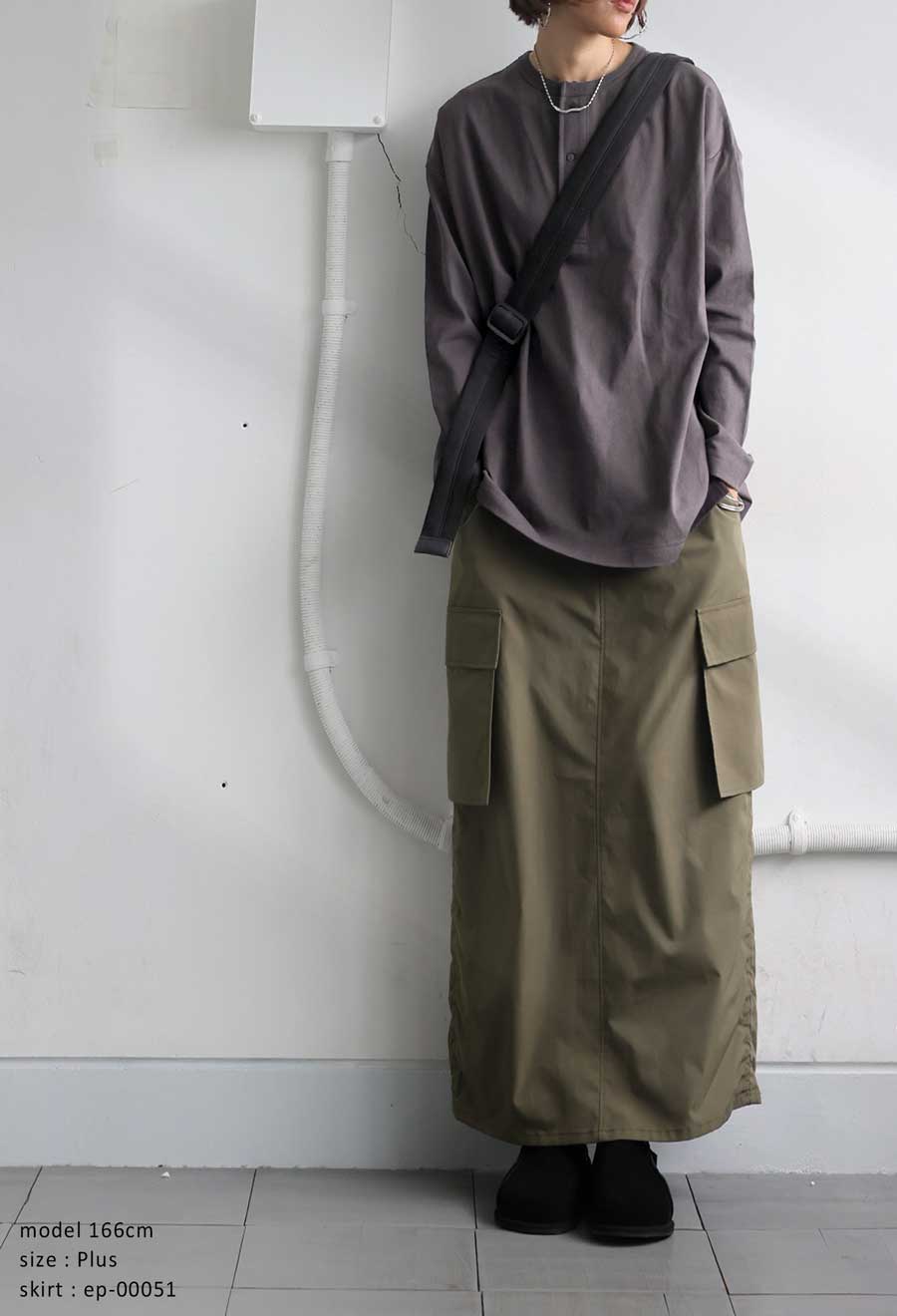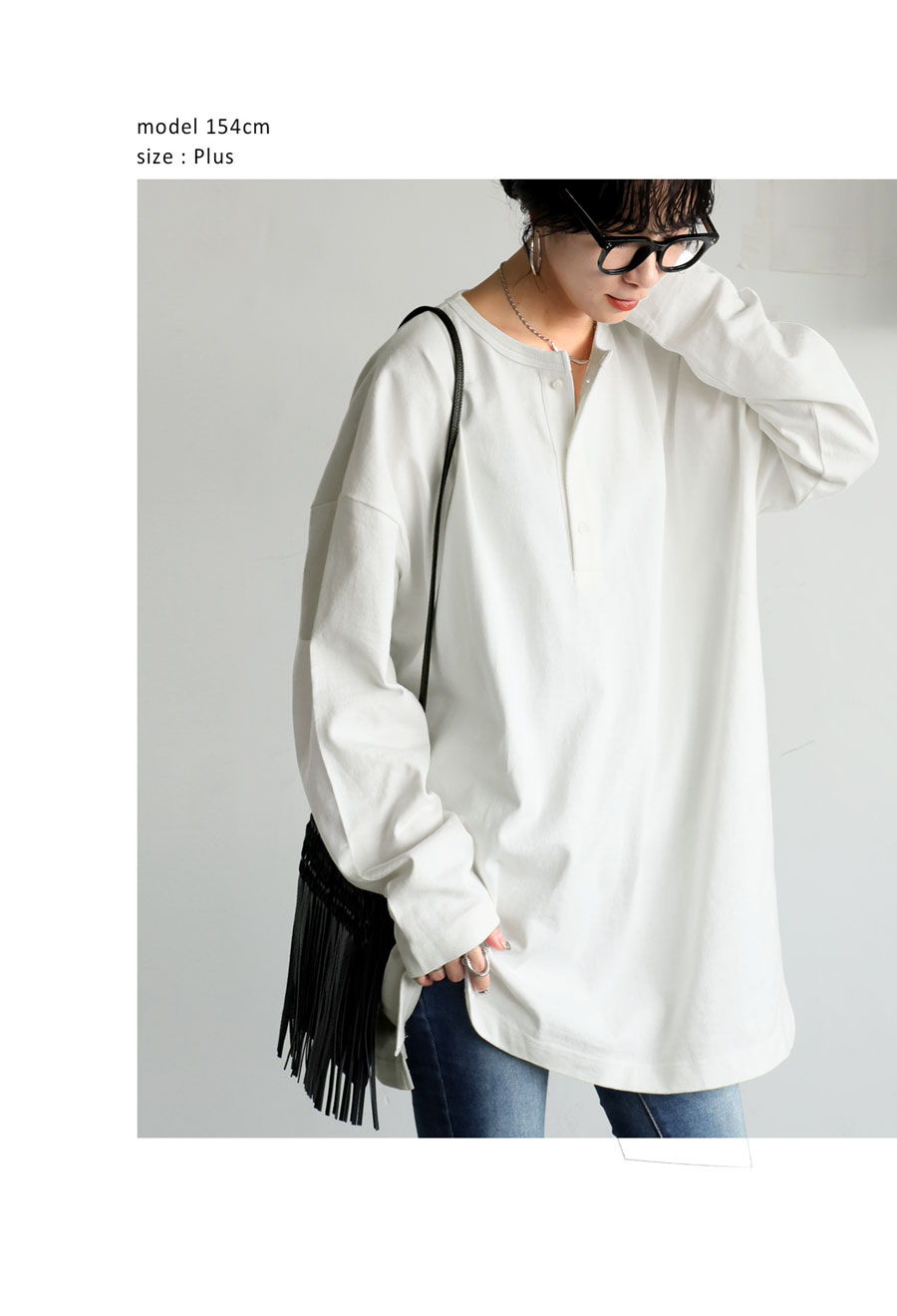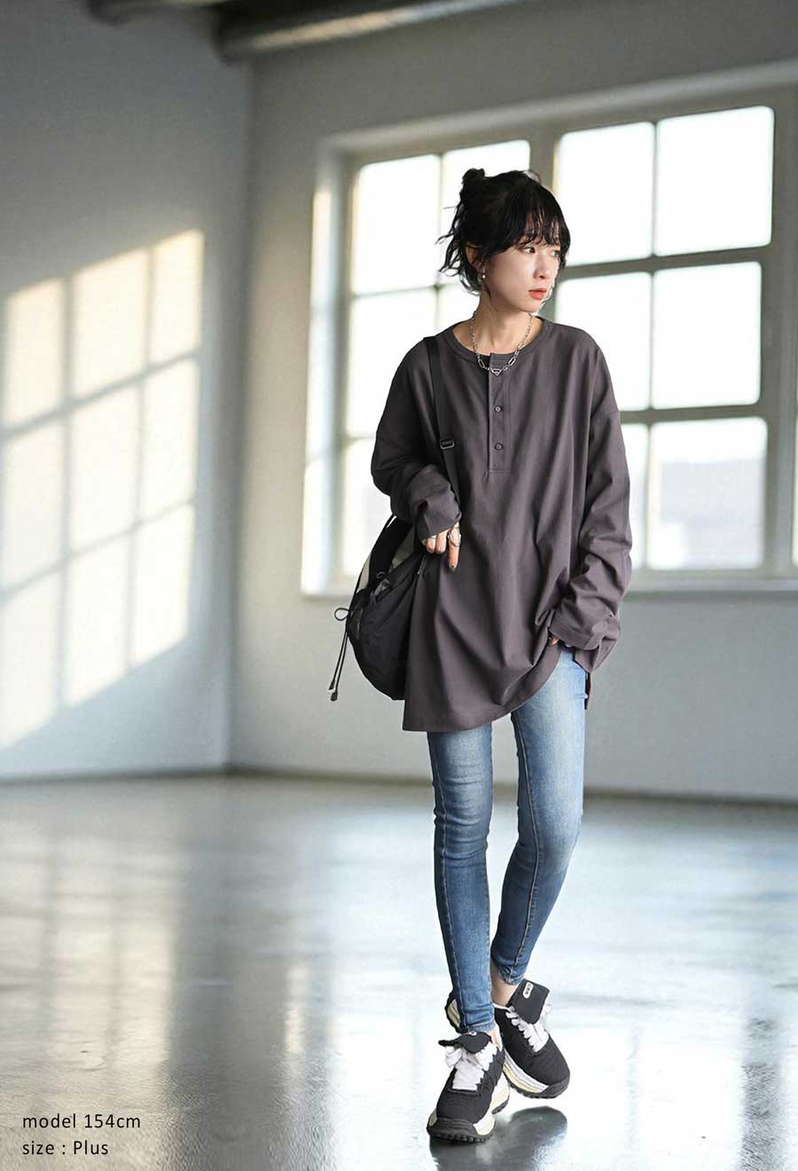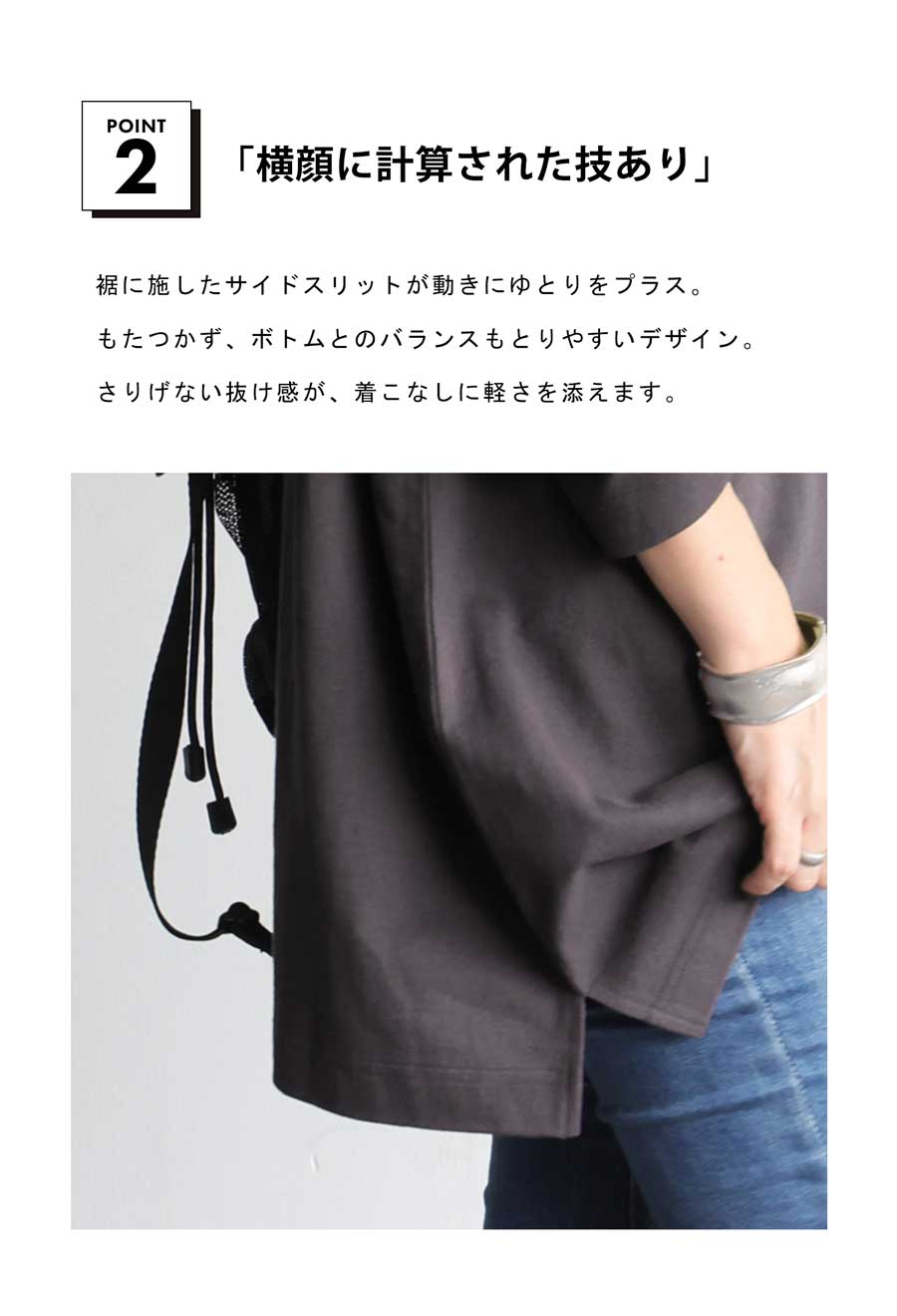 丈感はヒップラインをカバーする絶妙な長さで、前後差のある裾デザインがこなれ感を演出。