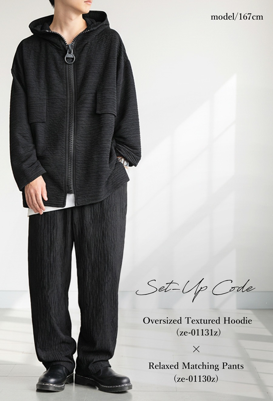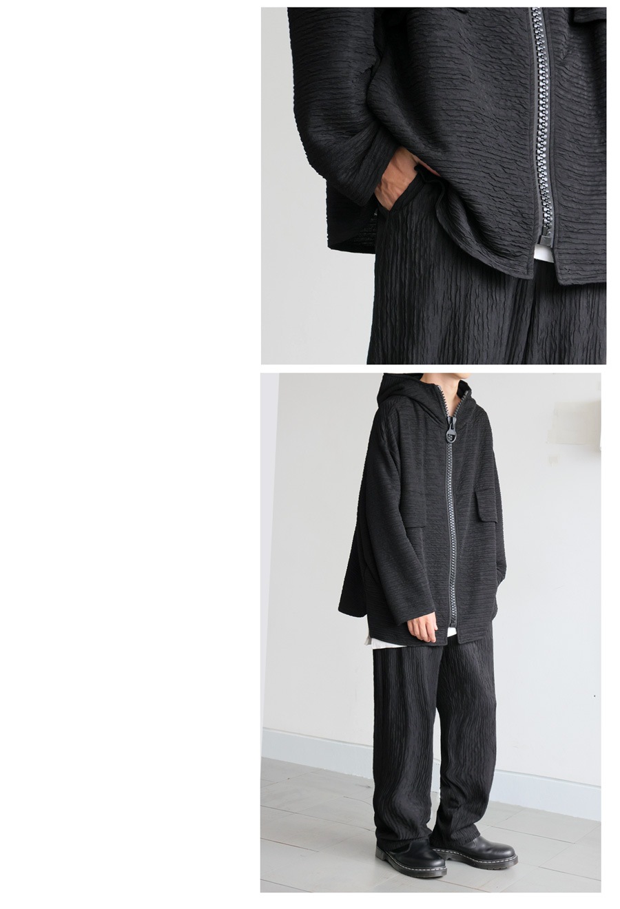 素材感の立体的な陰影が、無地のブラックに奥行きを加え、着こなしを引き締めてくれます。