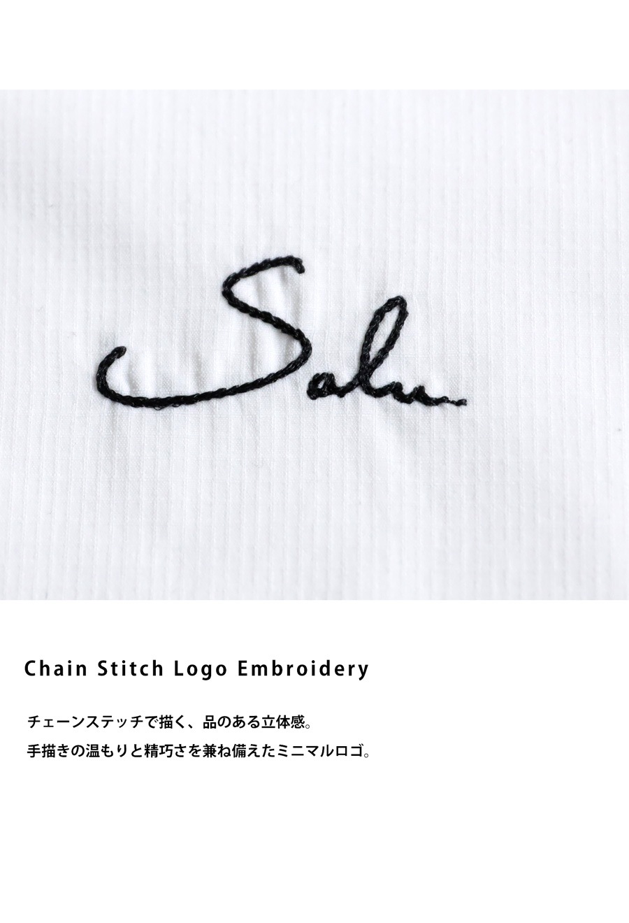 胸元には手描きのような風合いを感じさせるチェーンステッチのブランドロゴ刺繍を添え、さりげない存在感をプラス。