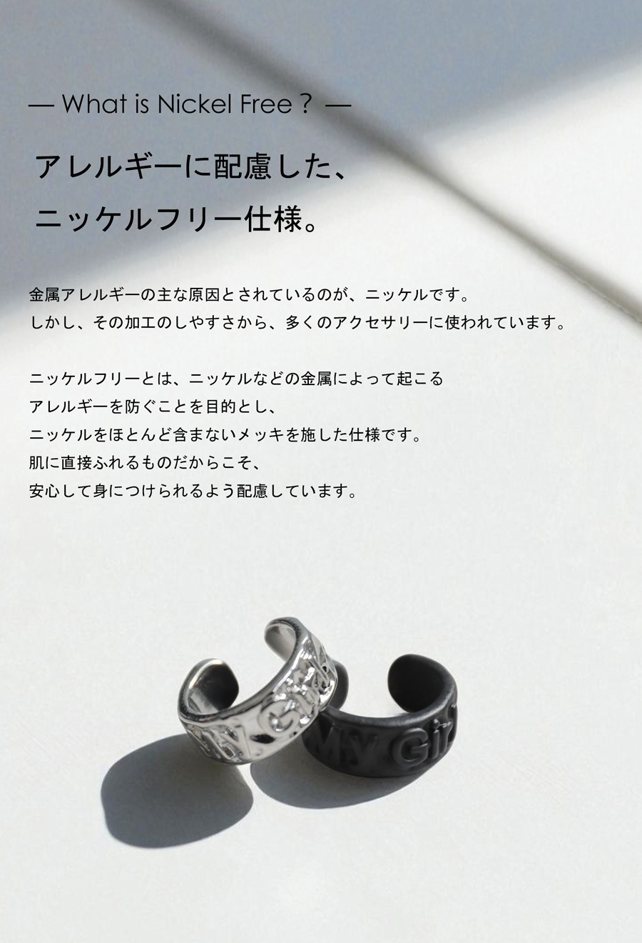 ニッケルフリー仕様で、金属アレルギーが気になる方にもやさしいつくりに。肌に触れるものだからこそ、安心できる素材選びにこだわりました。