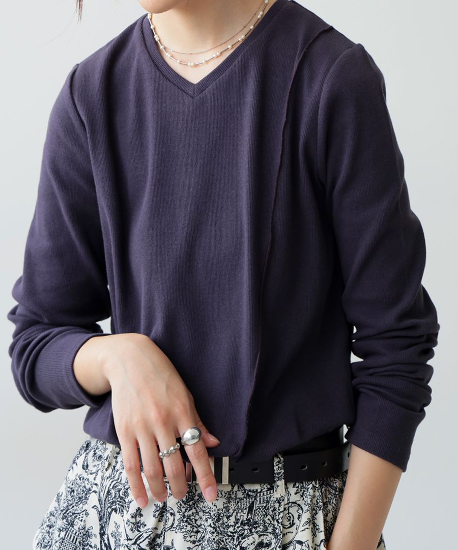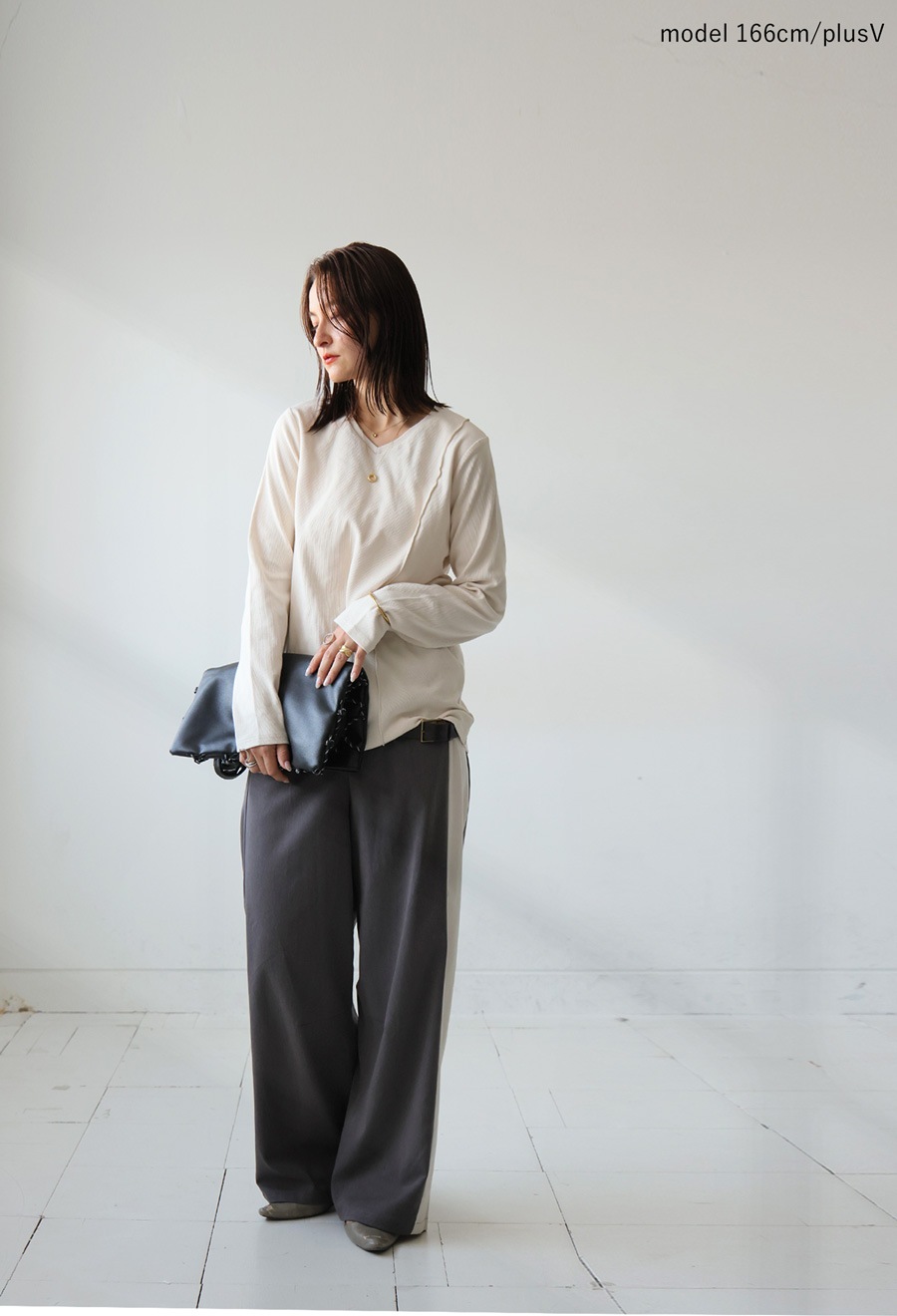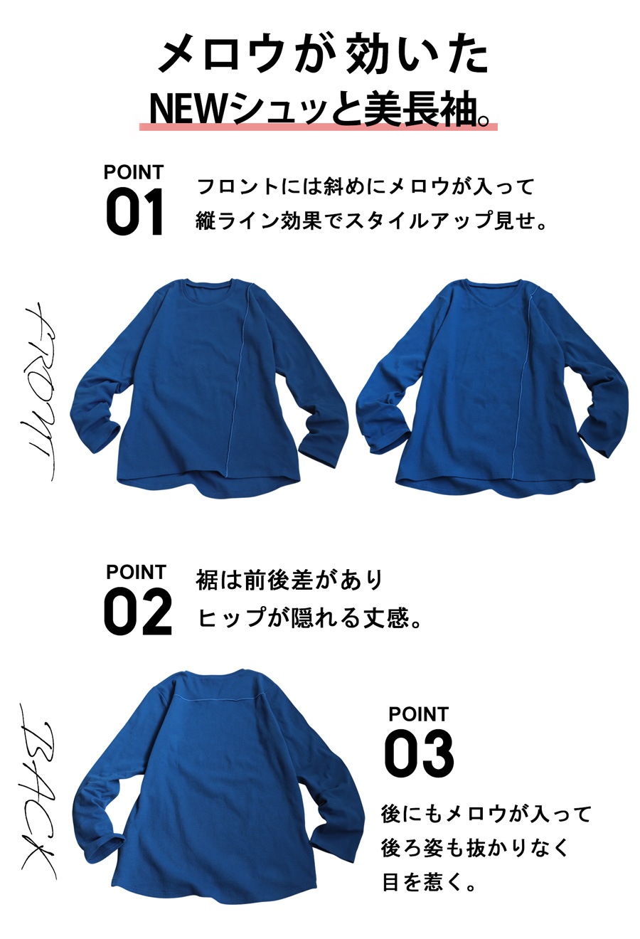 斜めに施されたメロウステッチが縦ラインを際立たせ、自然にスタイルアップが叶うレディーストップス。