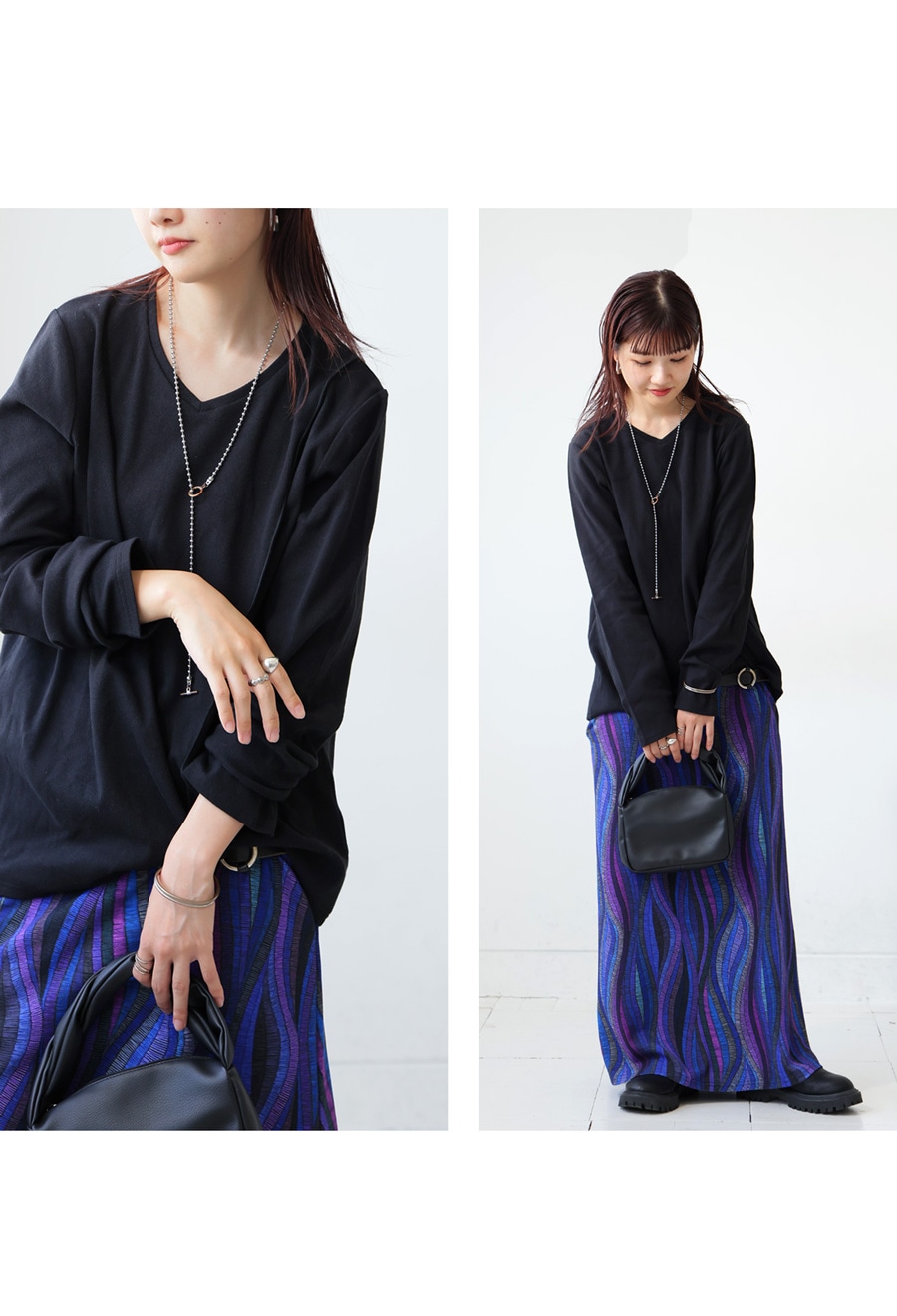 丈感はヒップにかかる長さで、気になるラインをカバーしつつ、すっきりと見せてくれます。