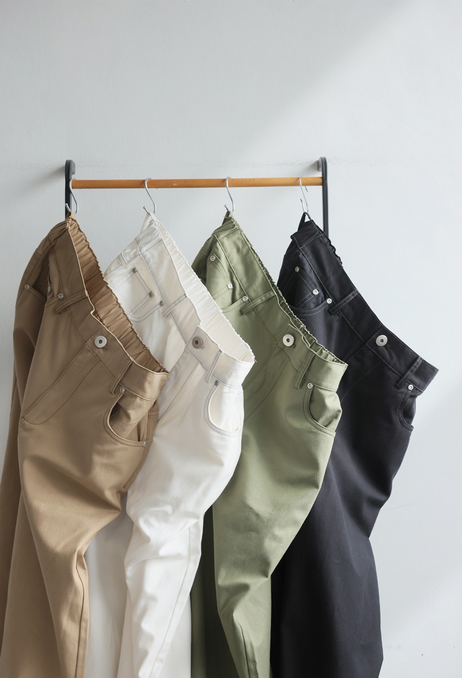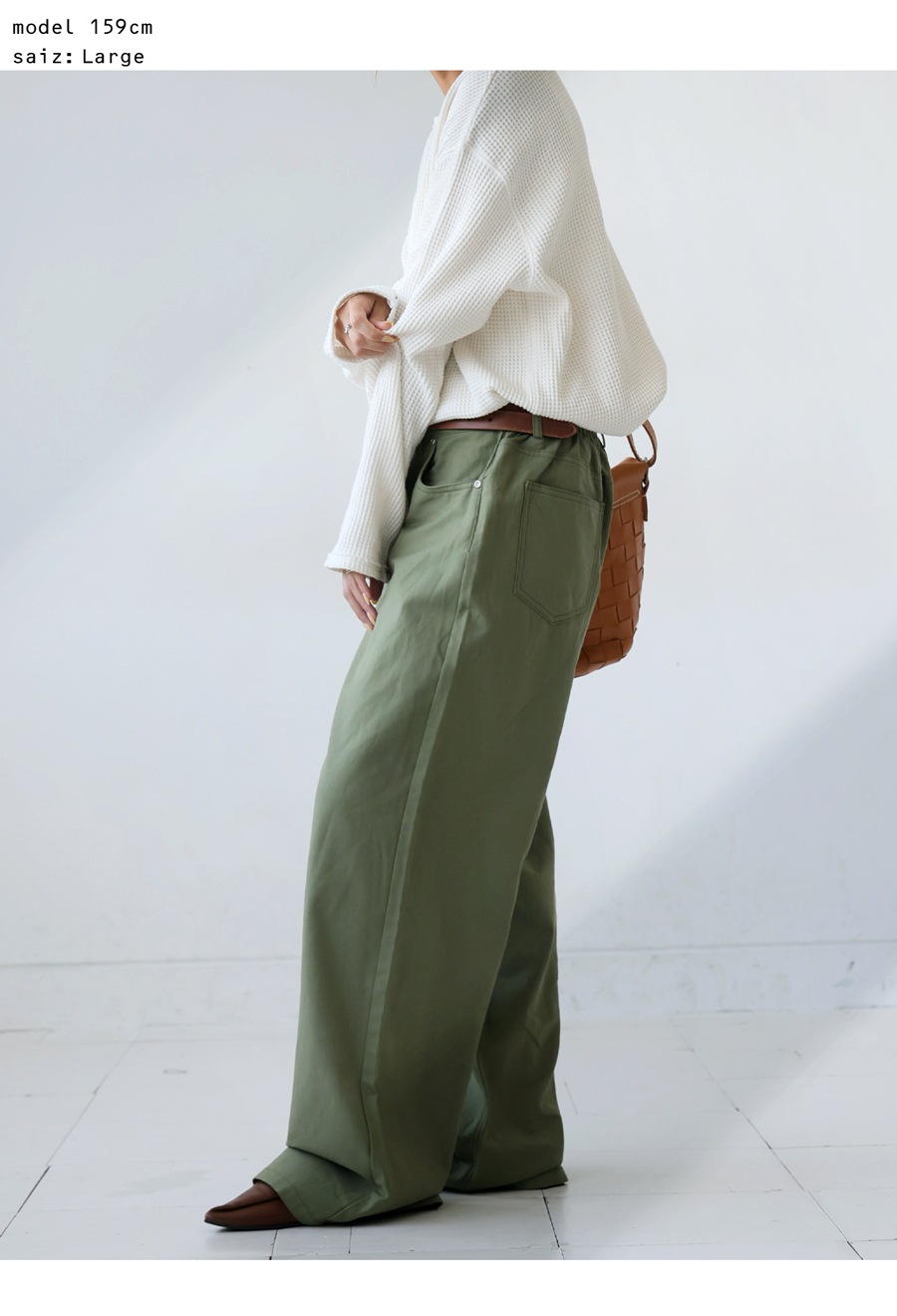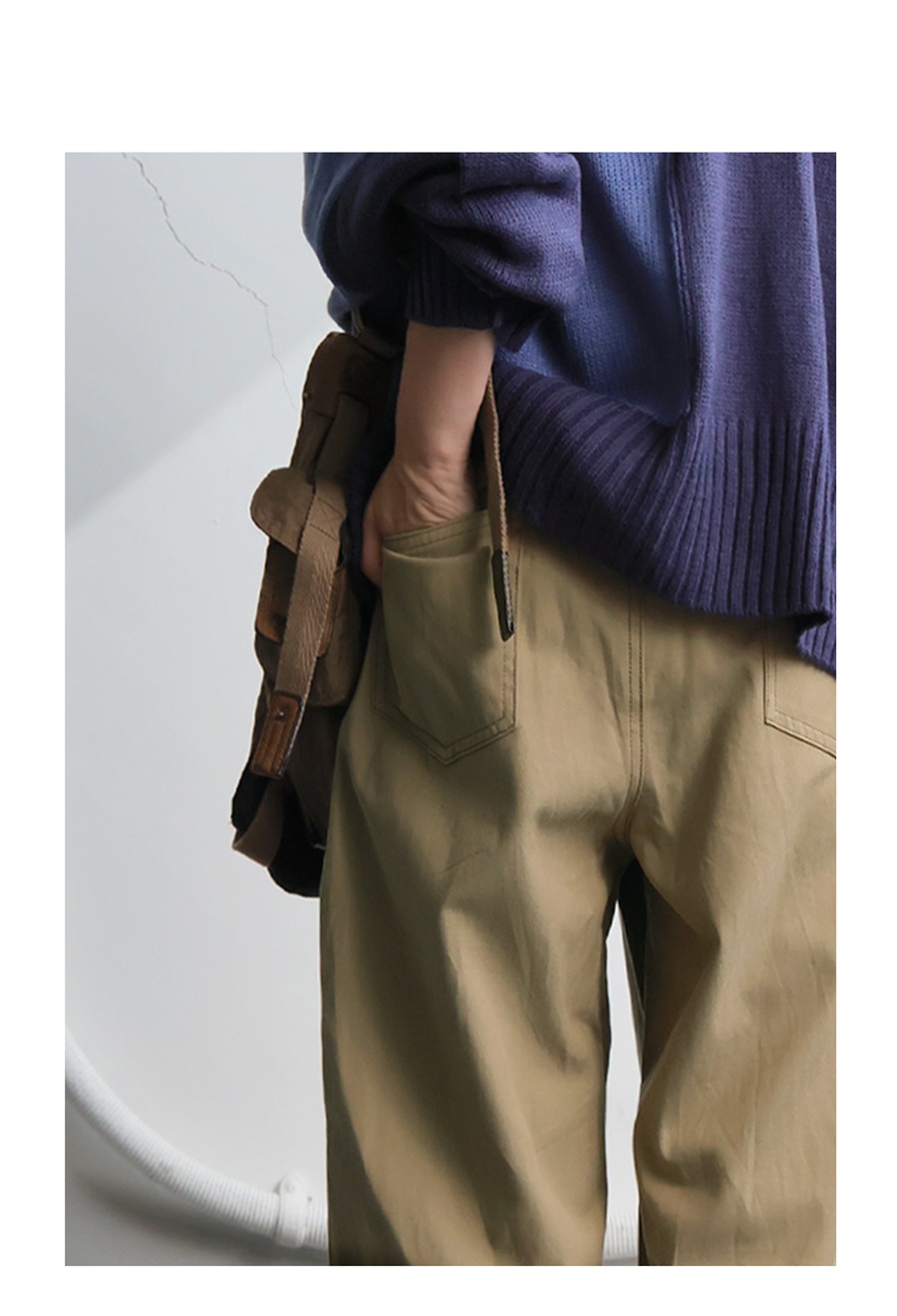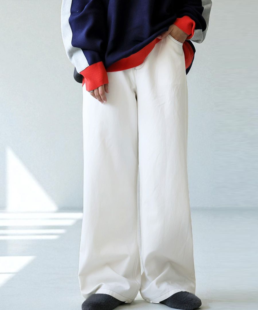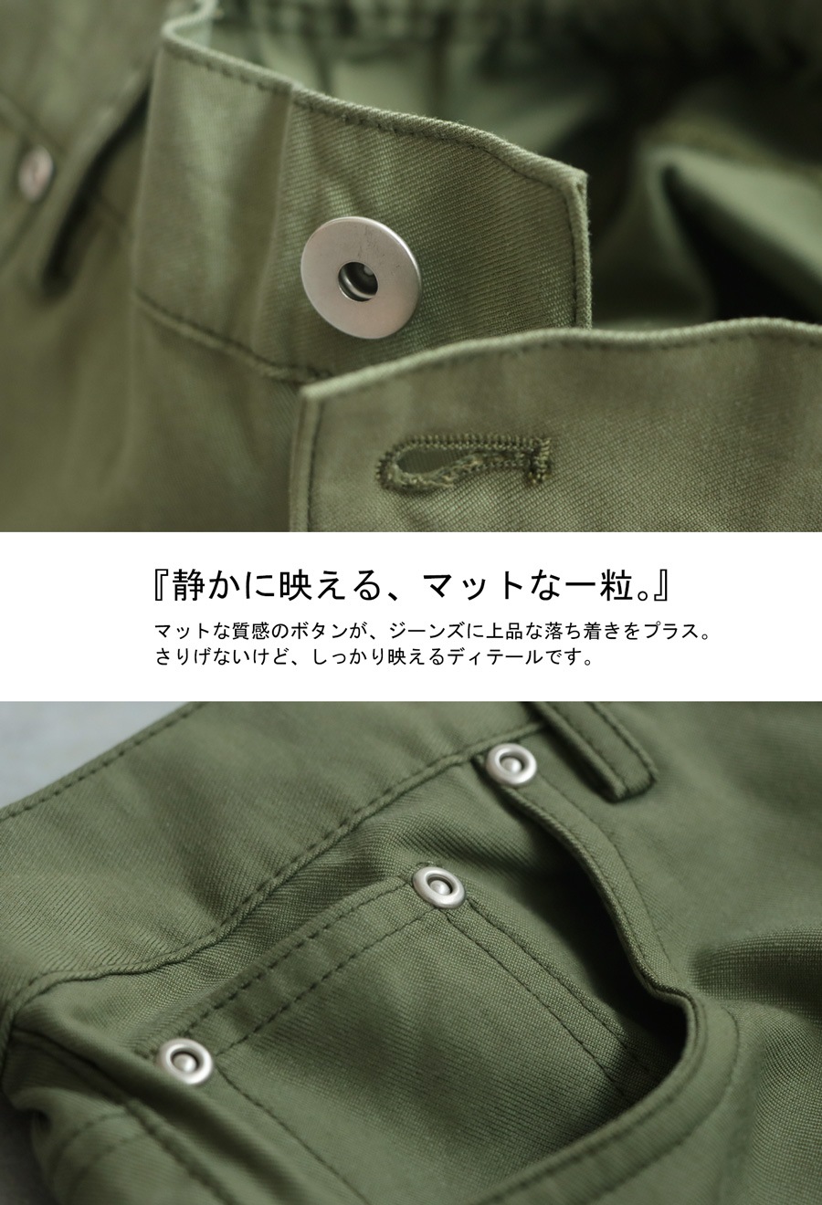 デニム風の5ポケットやステッチがアクセントとなり、ナチュラルで大人っぽい表情を演出します。
