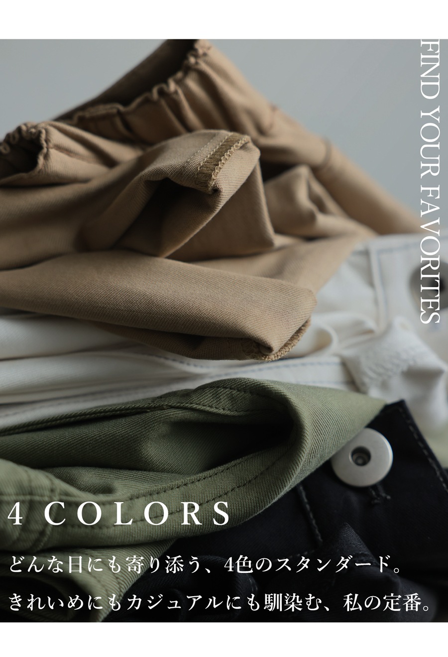 キャメル(茶色・ベージュ)、ホワイト(白・しろ・White)、カーキ(緑・みどり・オリーブ)、ブラック(黒・くろ・Black)の4色展開。