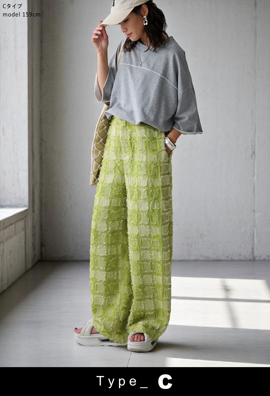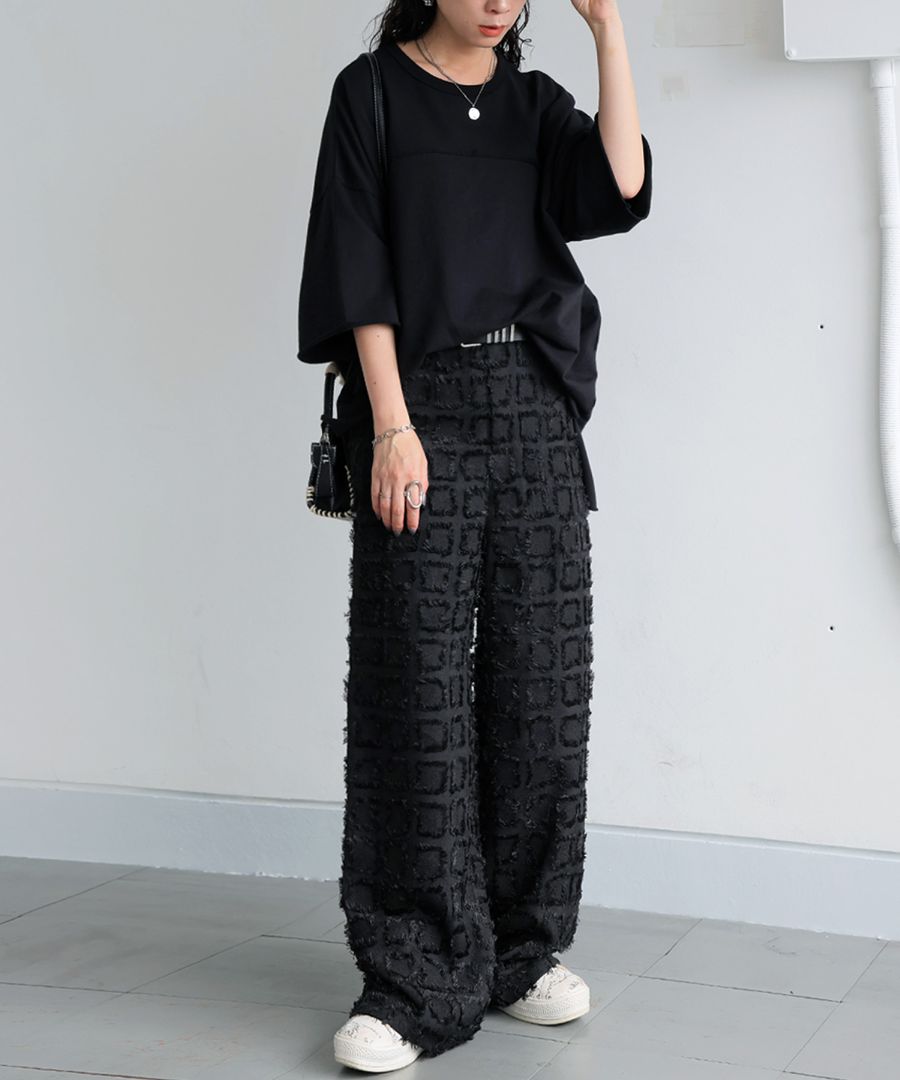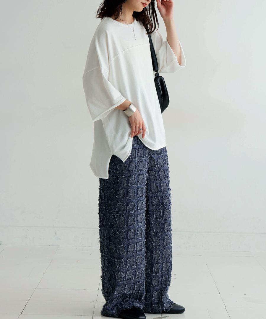 パンツは、フリンジ入りジャガード織のストレートシルエット。