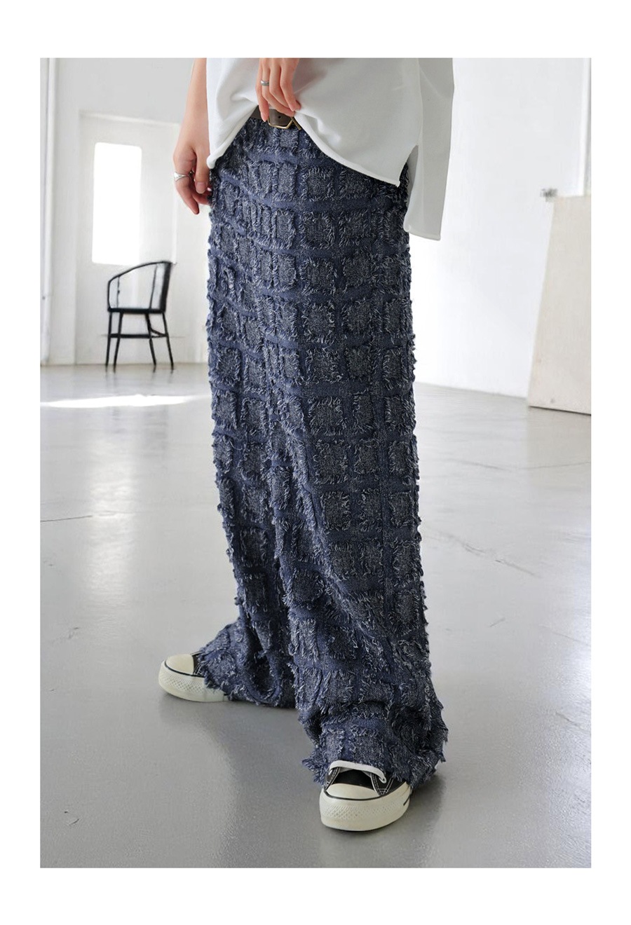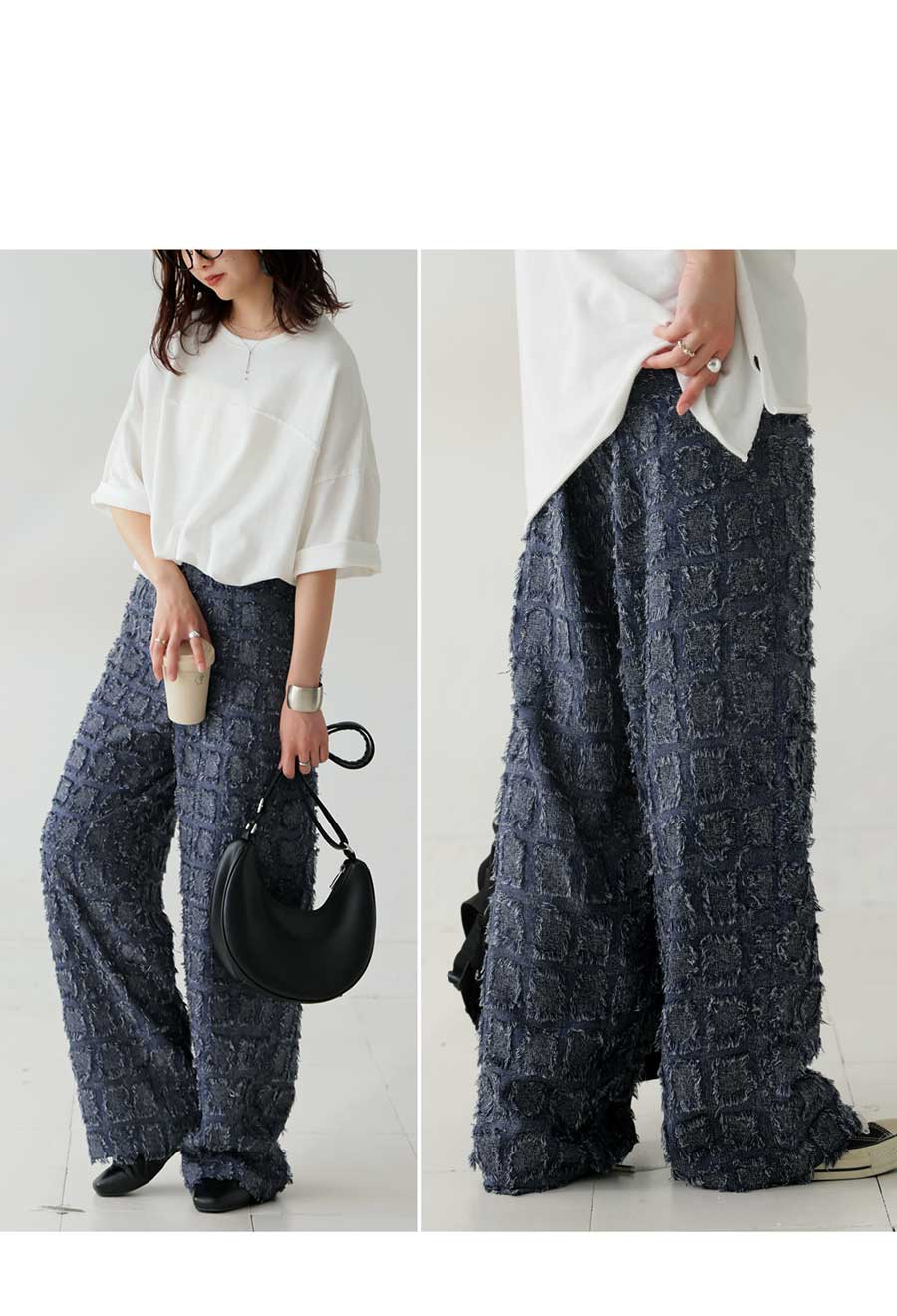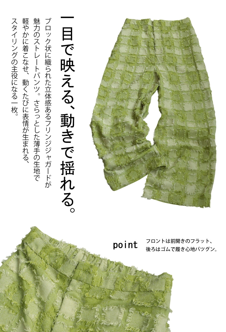 パンツは、フリンジ入りジャガード織のストレートシルエット。