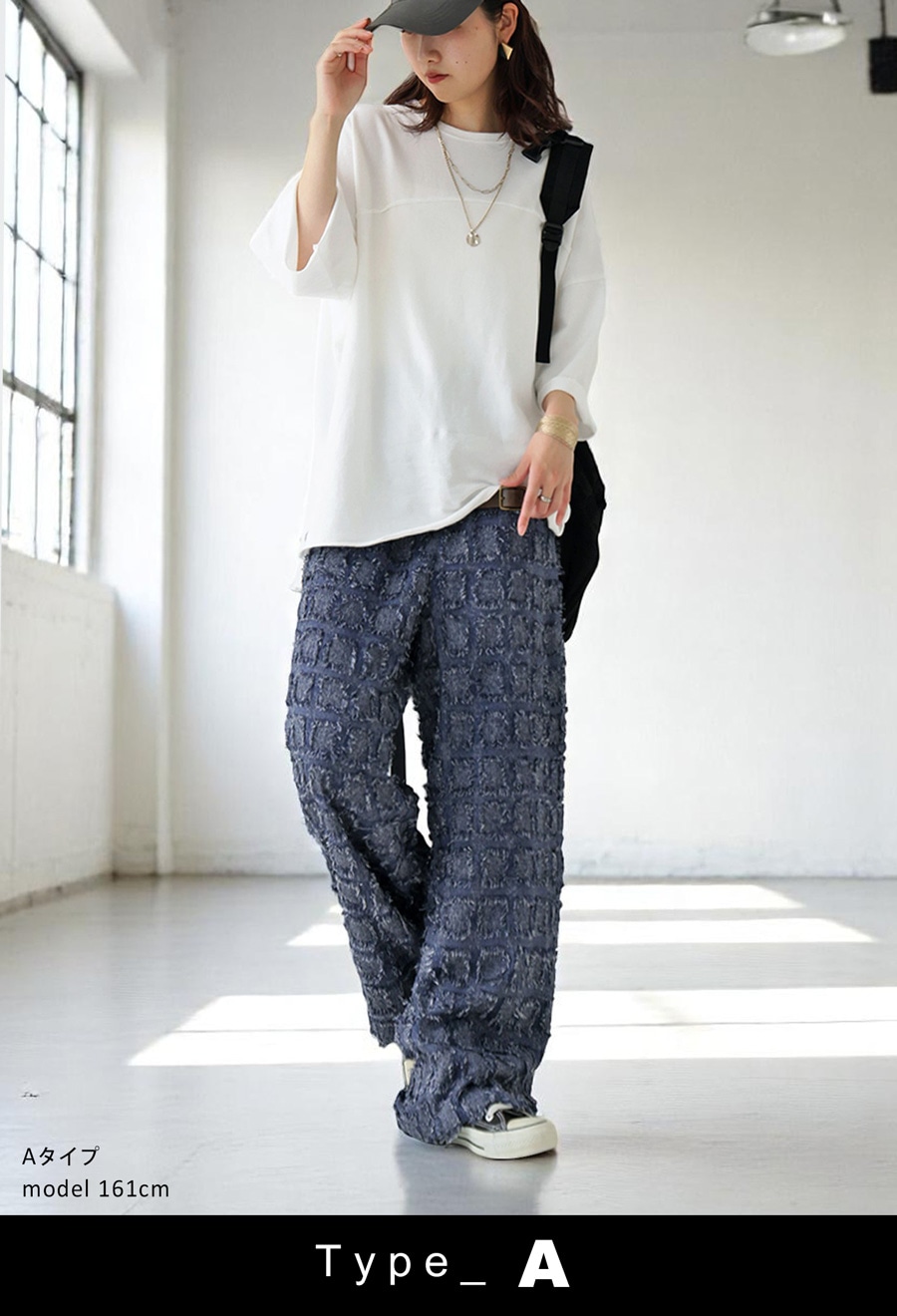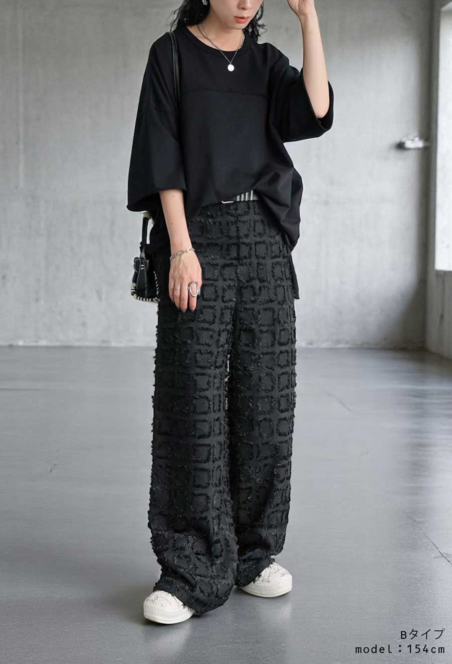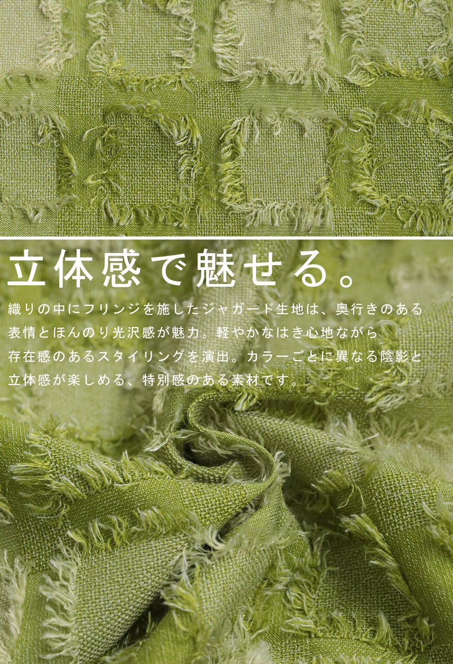 ブロック状に織り込まれた立体感ある生地が動くたびに揺れて、スタイリングに表情を与えます。