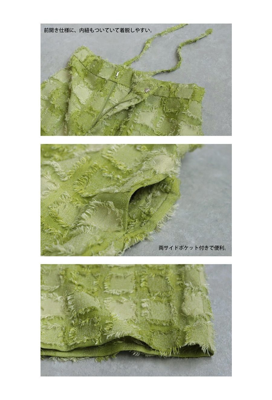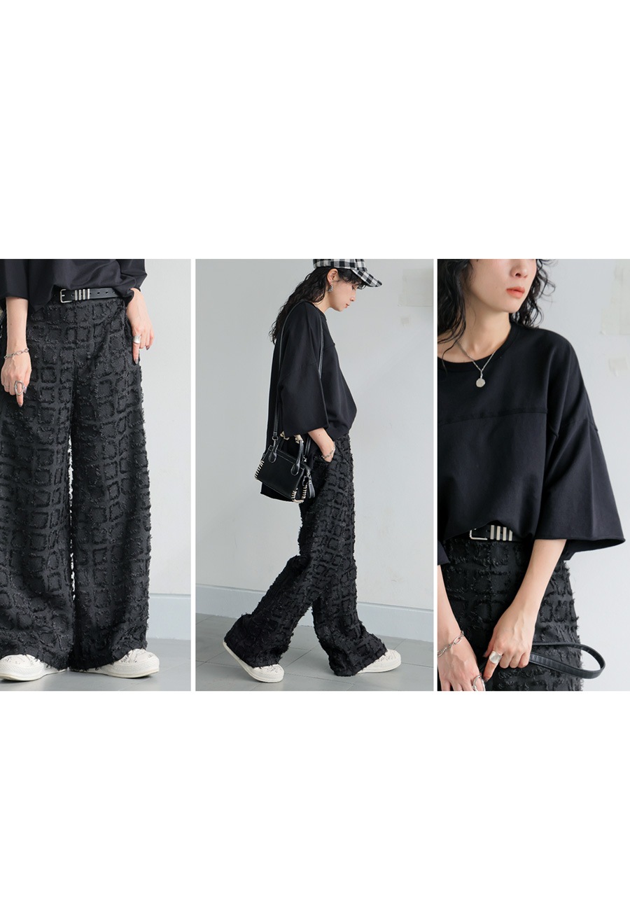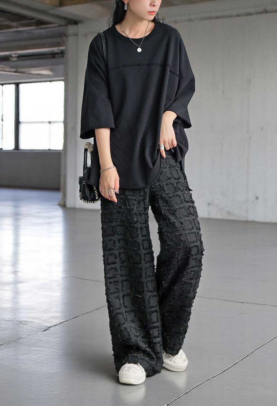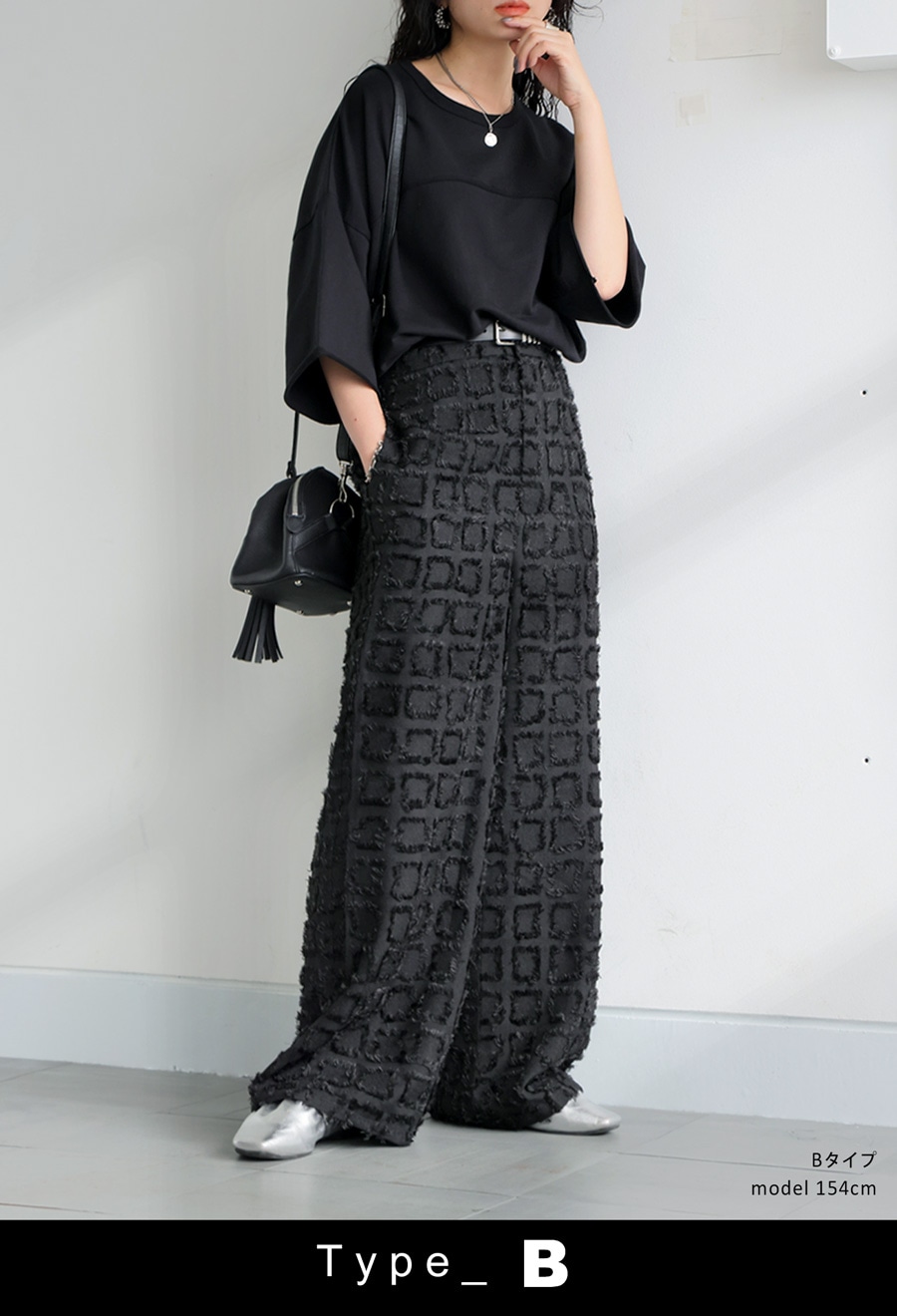 ブロック状に織り込まれた立体感ある生地が動くたびに揺れて、スタイリングに表情を与えます。