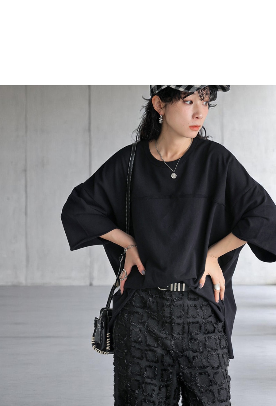 ヒップまで隠れる丈感とドロップショルダーのゆるシルエットで、体型カバーもお手のもの。