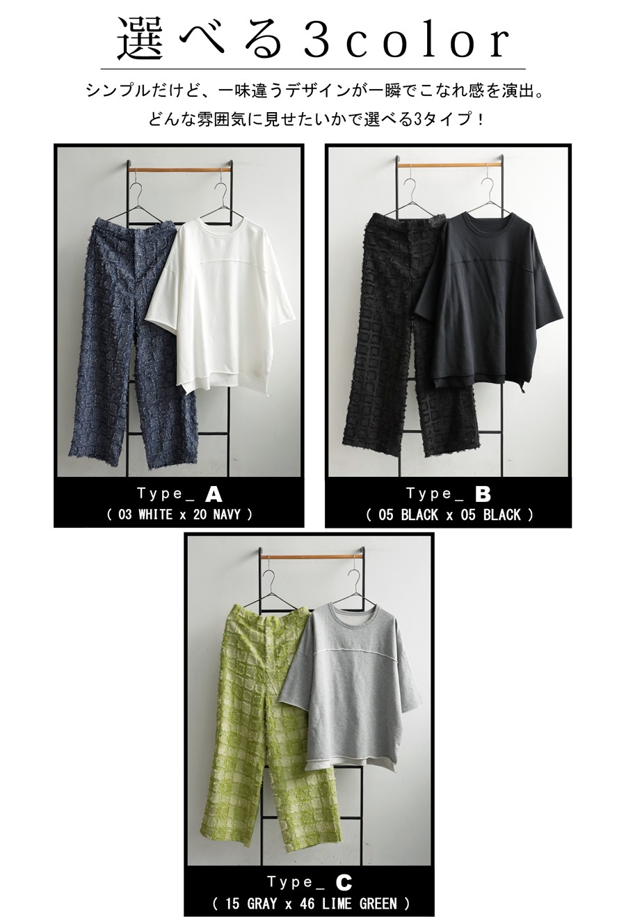 上下セットで着れば、忙しい朝にも迷わずコーデが完成。