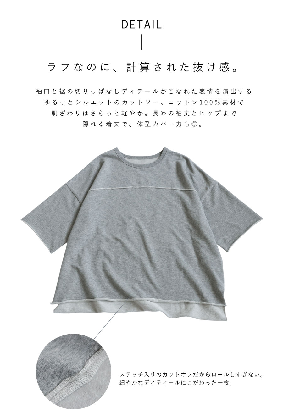 袖口と裾に切りっぱなしディテールを取り入れることで、シンプルながらも抜け感を演出します。