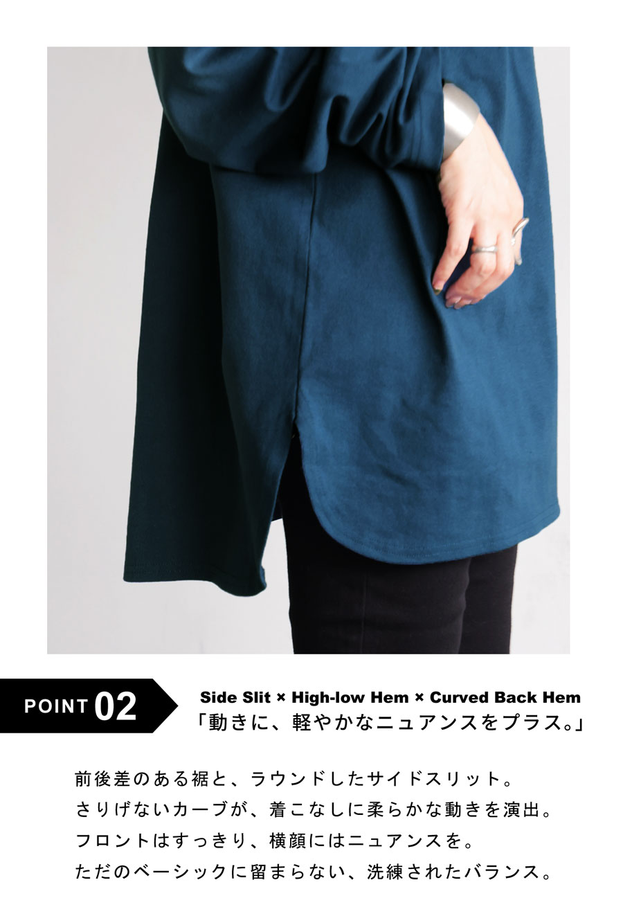 サイドに丸み(カーブ)のあるスリットを施すことで、重ね着やレイヤードスタイルにも取り入れやすくしています。