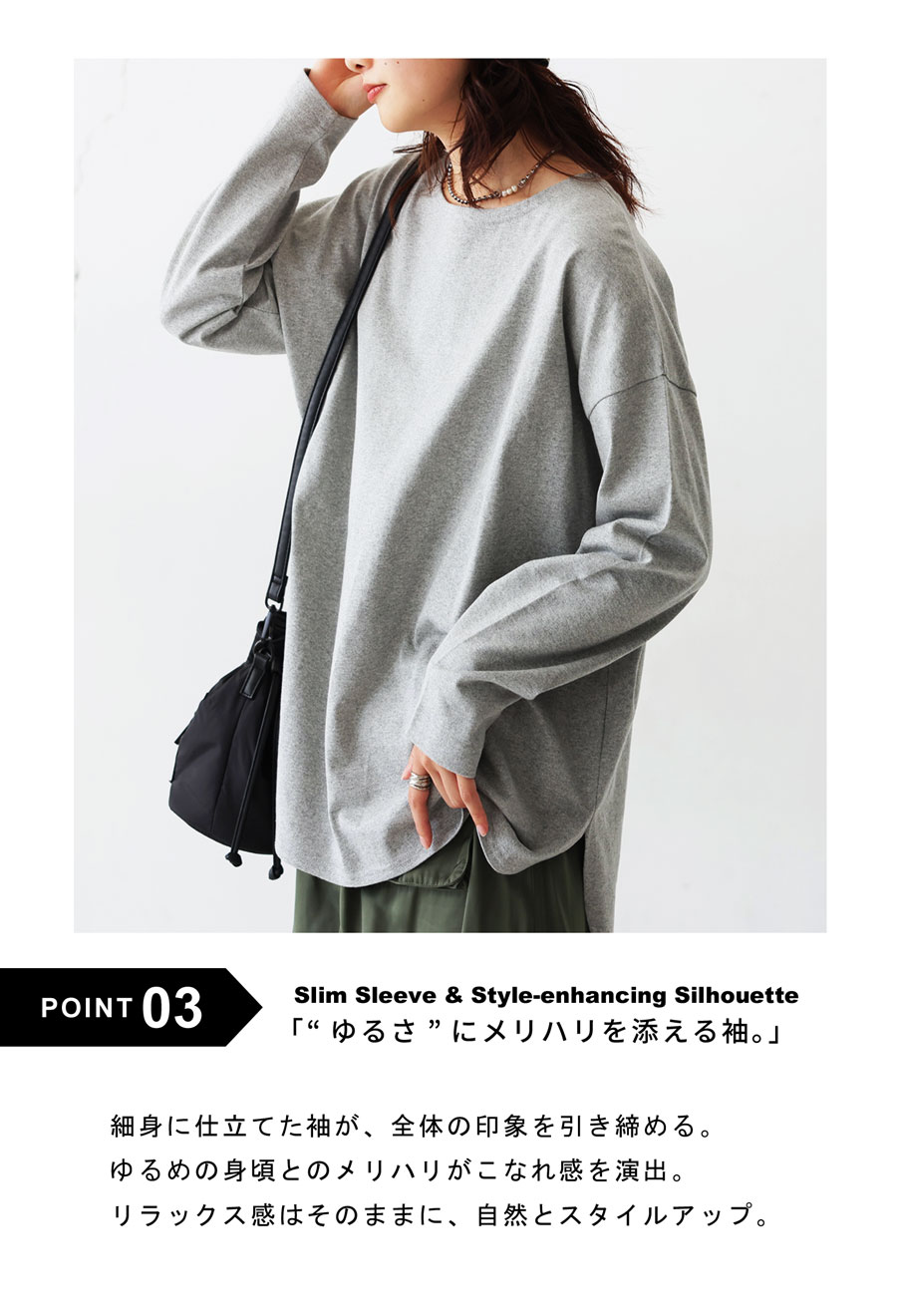 ほどよくゆったりとしたシルエットで体型カバーにも配慮し、大きめサイズ感でリラックスした着心地を叶えます。