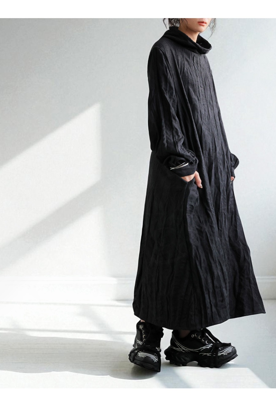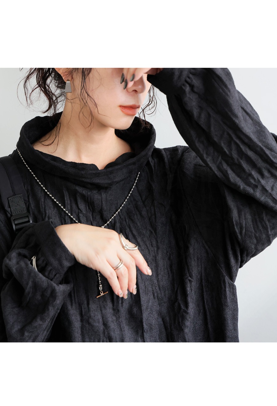 タートルネック風の首元は、モード感を演出しながら小顔効果も期待できる嬉しいポイント。