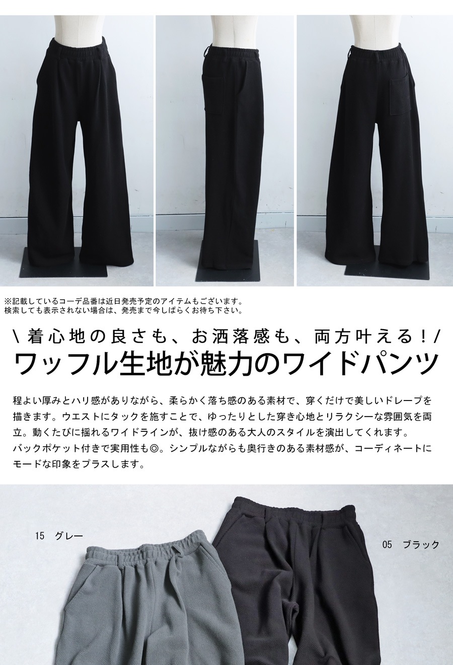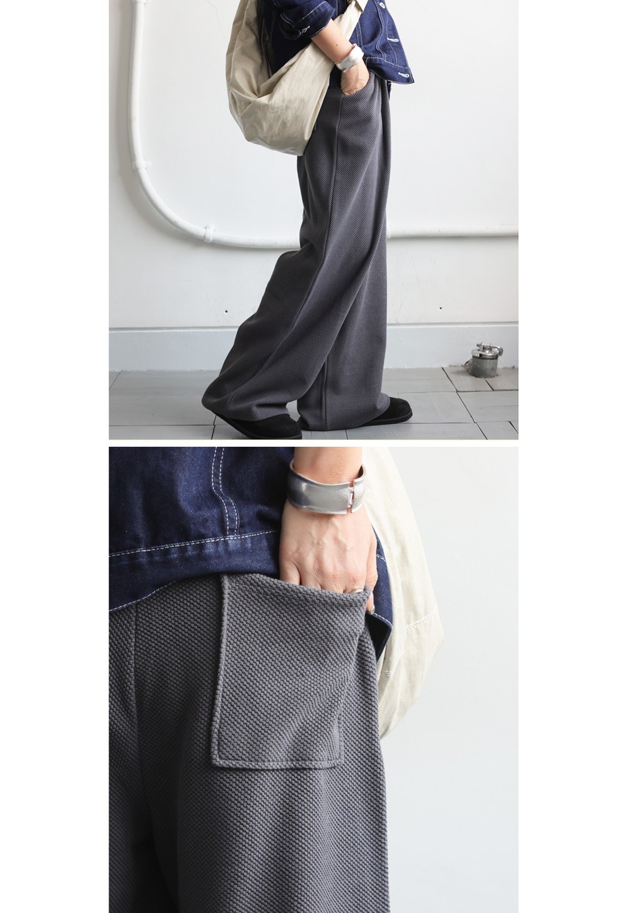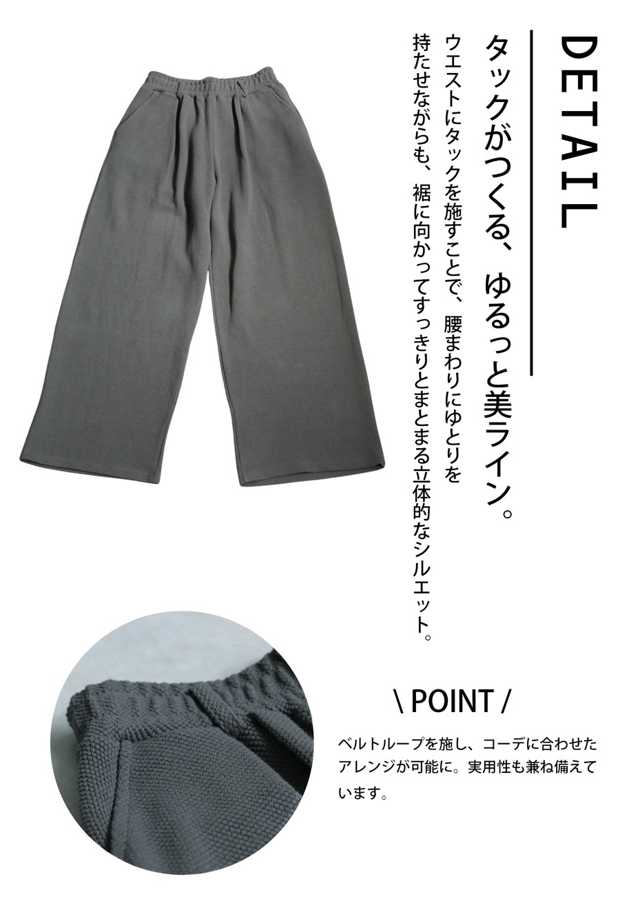 表情豊かなワッフル調素材が魅力の、落ち感のあるワイドパンツ。