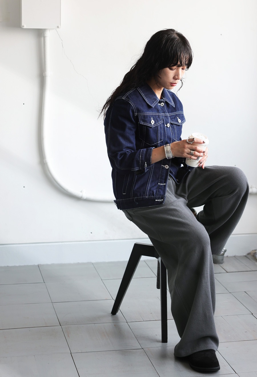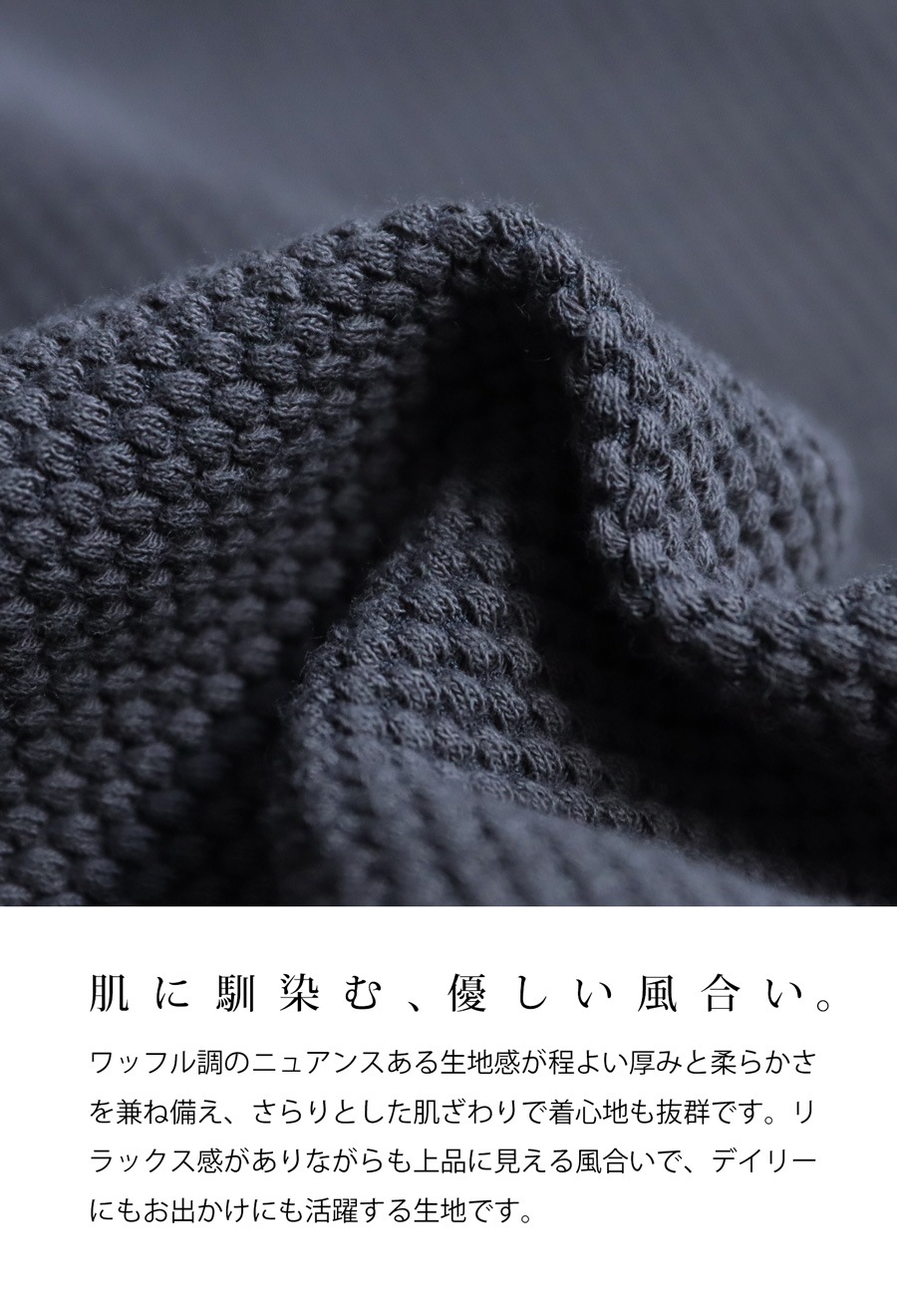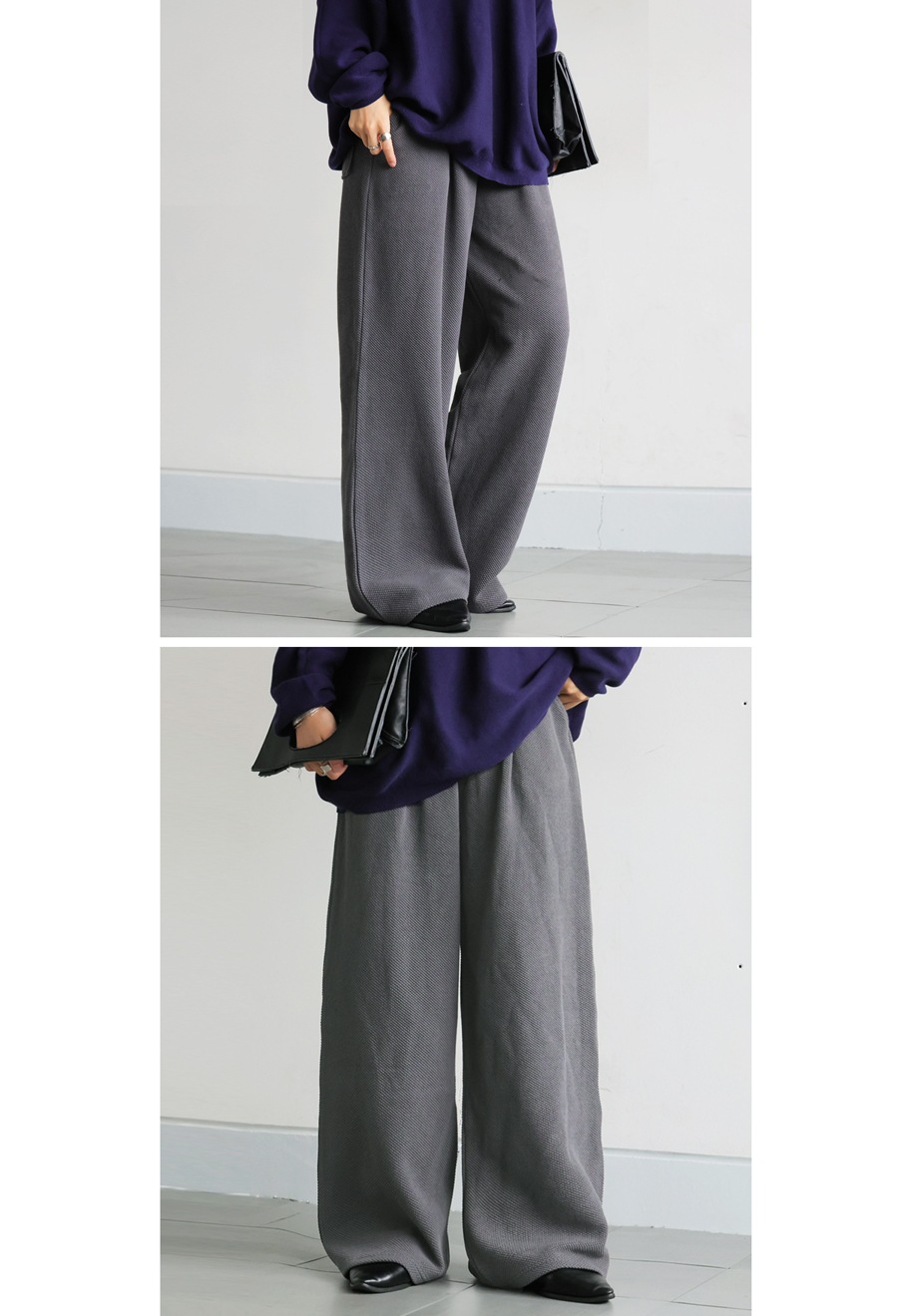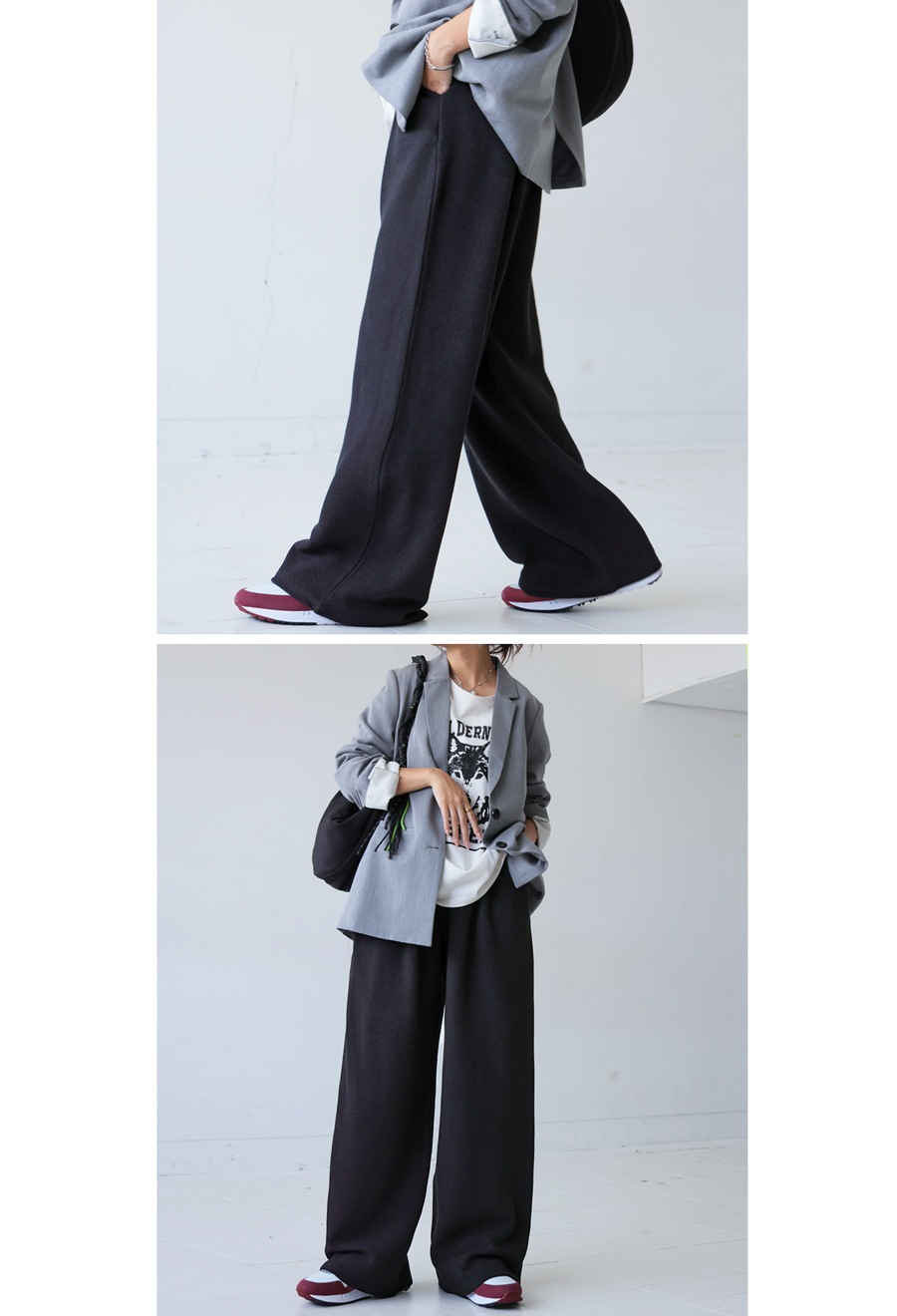 表情豊かなワッフル調素材が魅力の、落ち感のあるワイドパンツ。