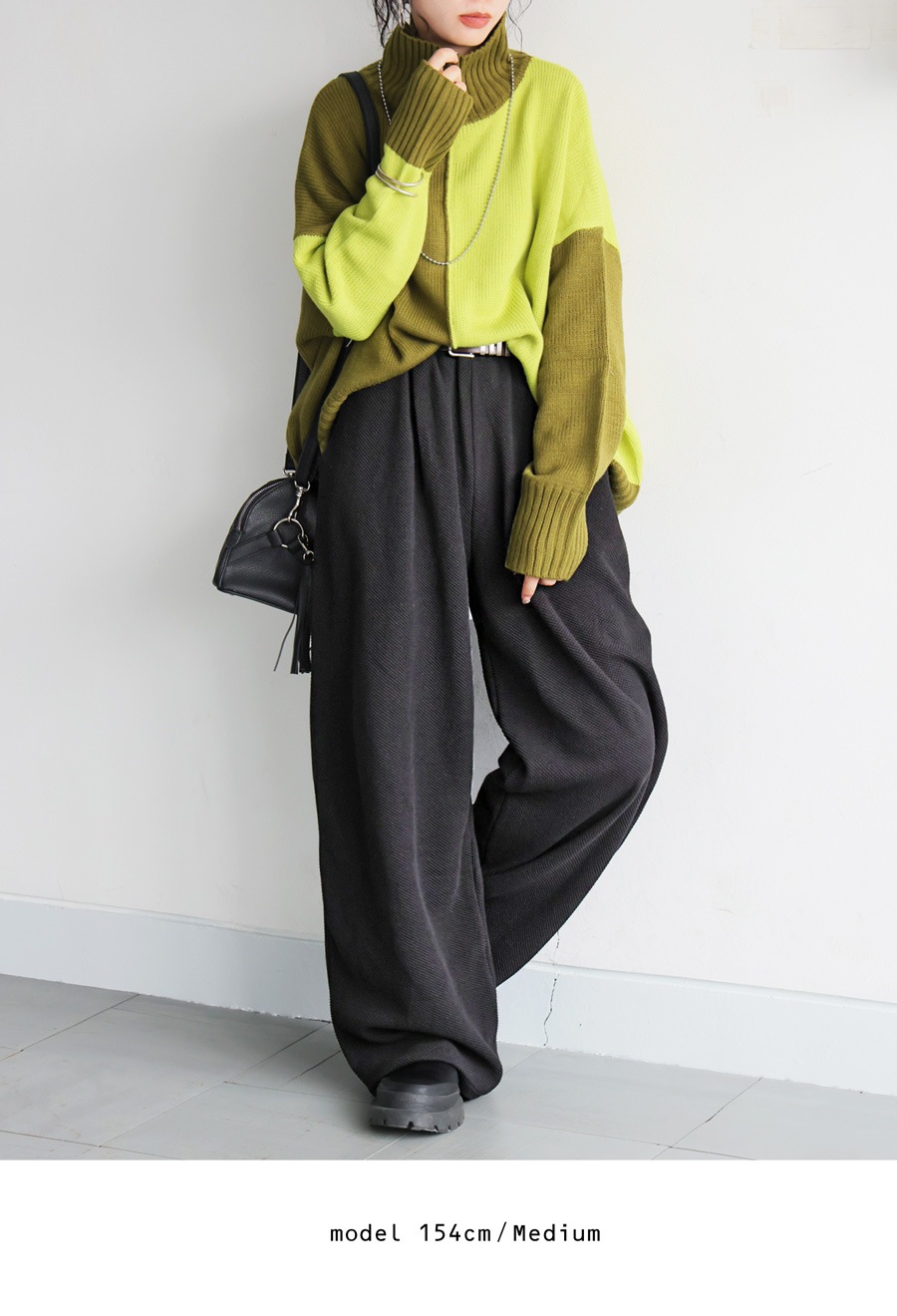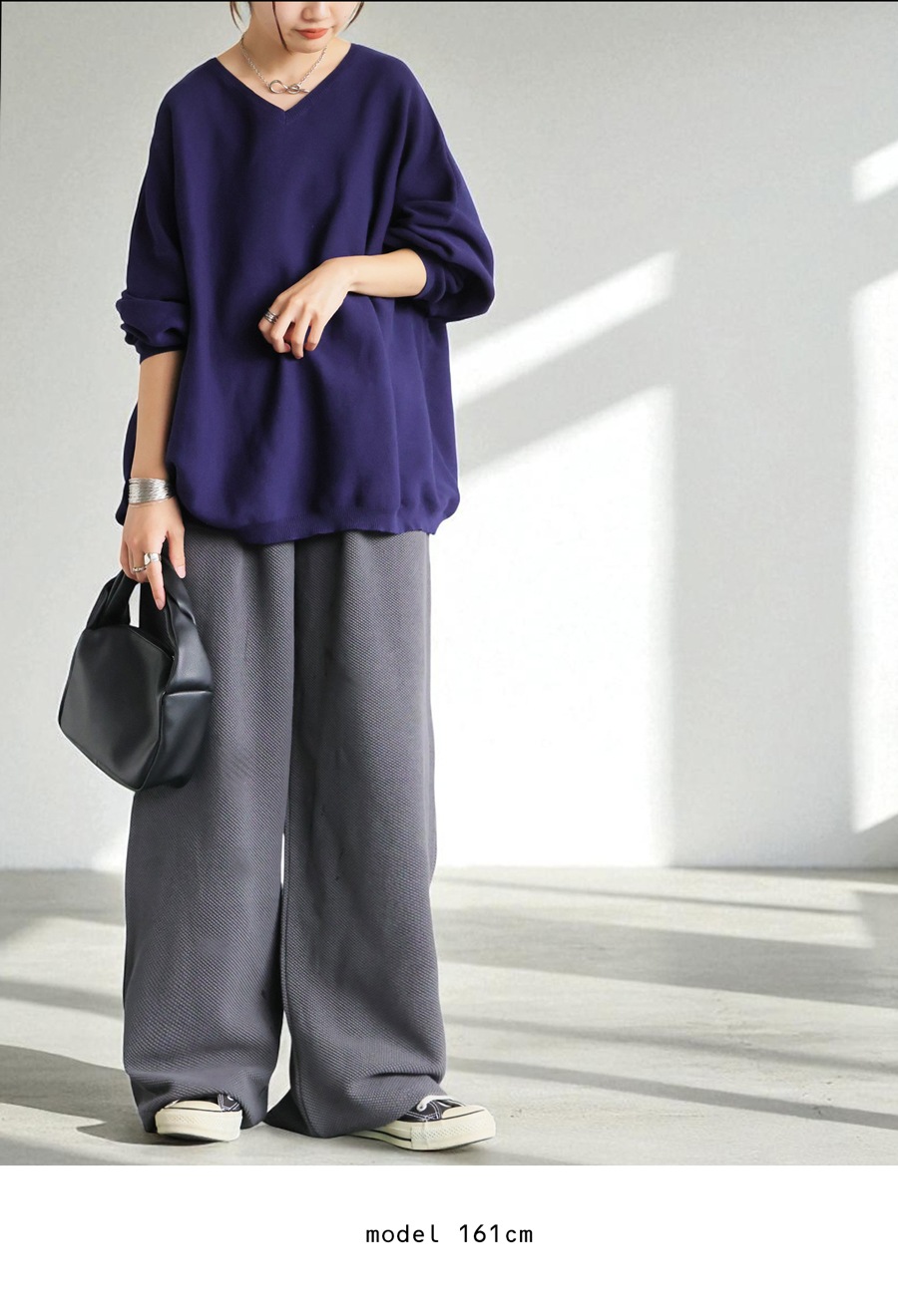 タック入りで腰まわりにゆとりを持たせ、裾に向かって美しく広がるワイドな形状がリラックス感と上品さを演出します。