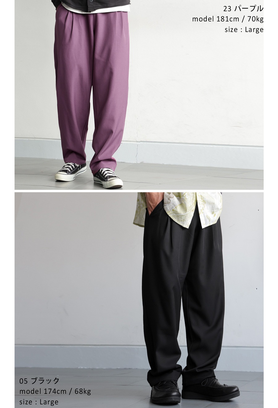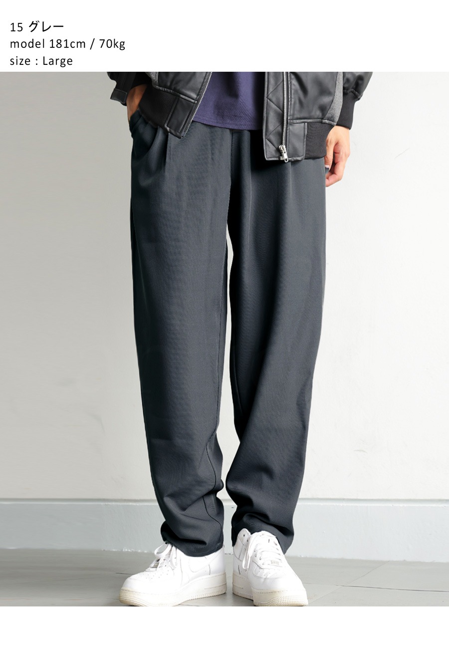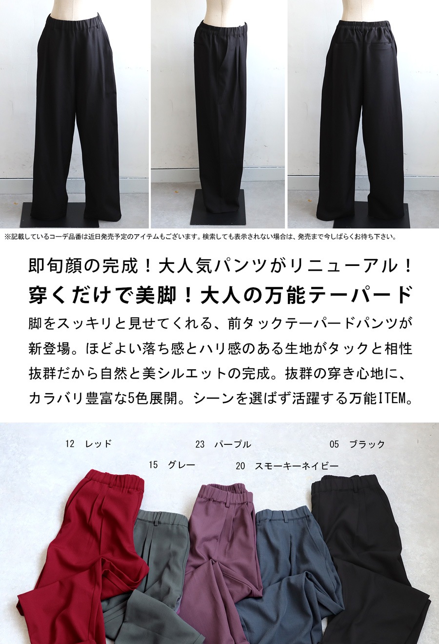 裾に向かって細くなるテーパードシルエットが脚元を引き締め、全体をスマートな印象にまとめてくれます。