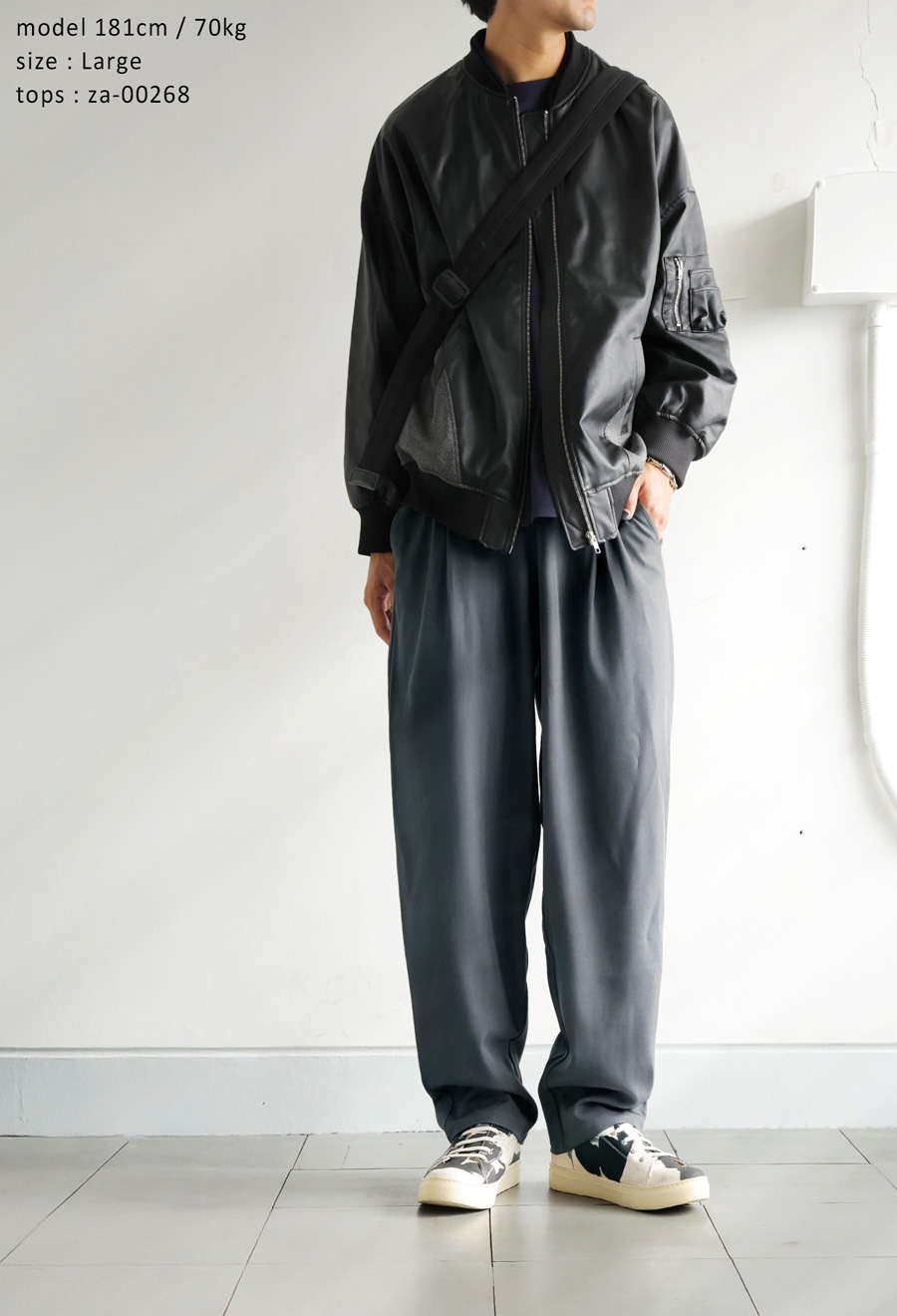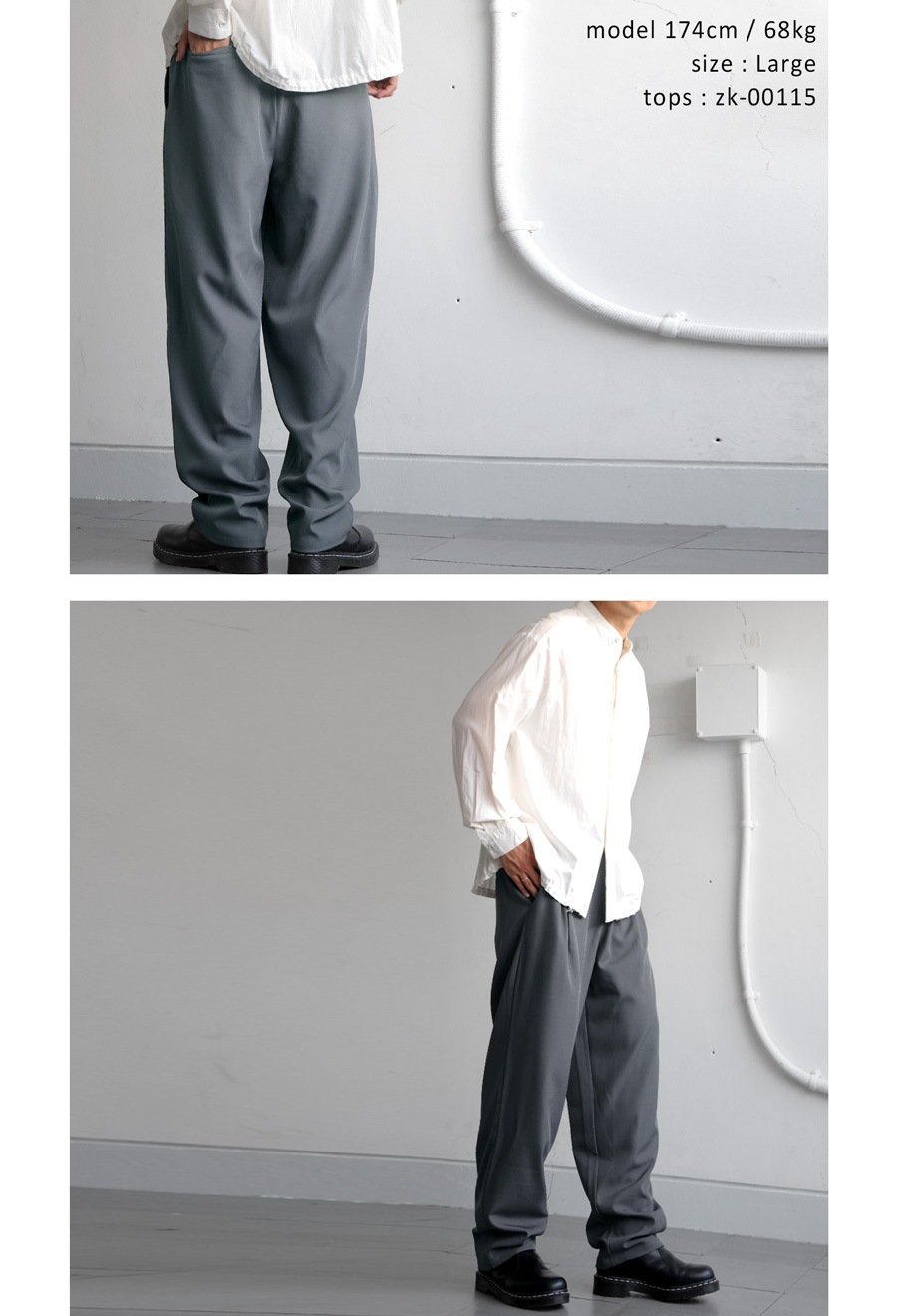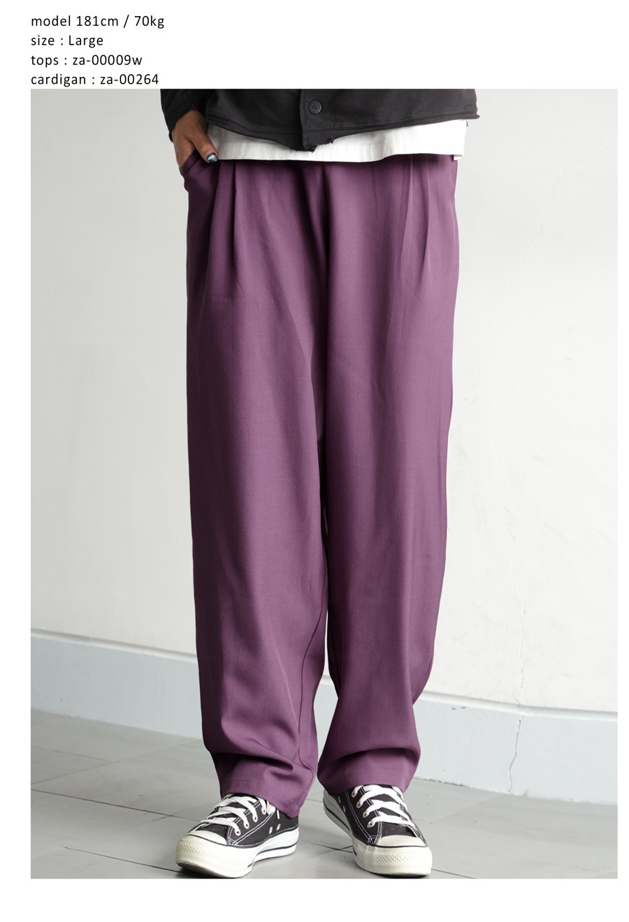 裾に向かって細くなるテーパードシルエットが脚元を引き締め、全体をスマートな印象にまとめてくれます。