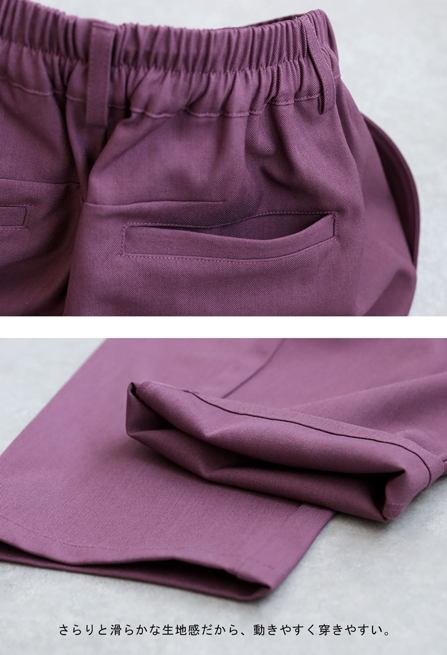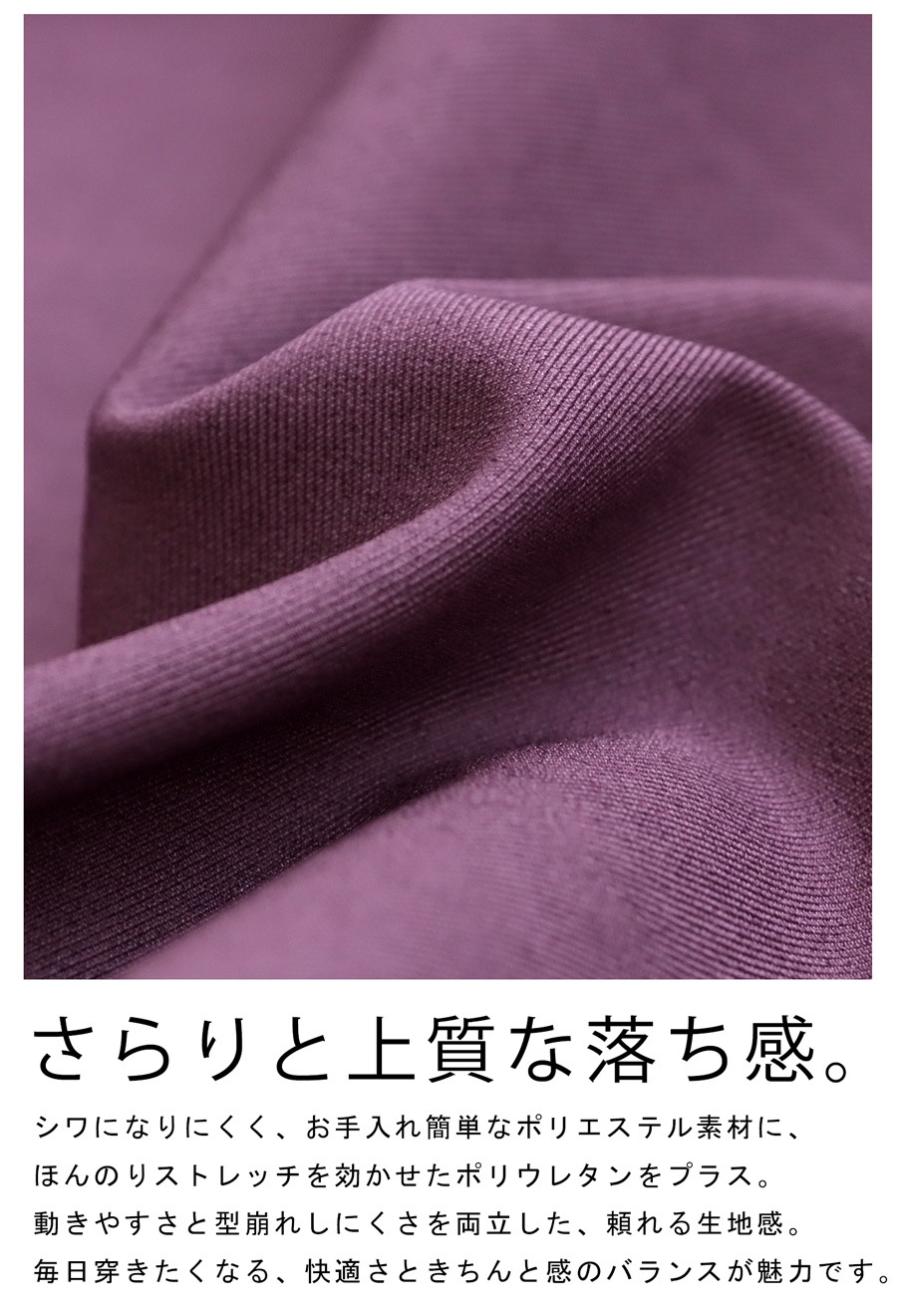 さらっとした手触りが心地よいポリエステル素材に、ほどよいストレッチ性を加えたポリウレタン混。