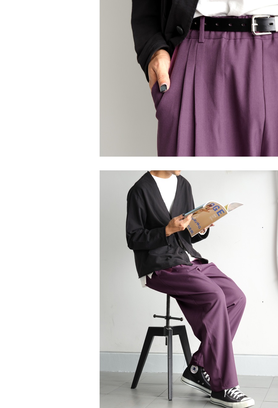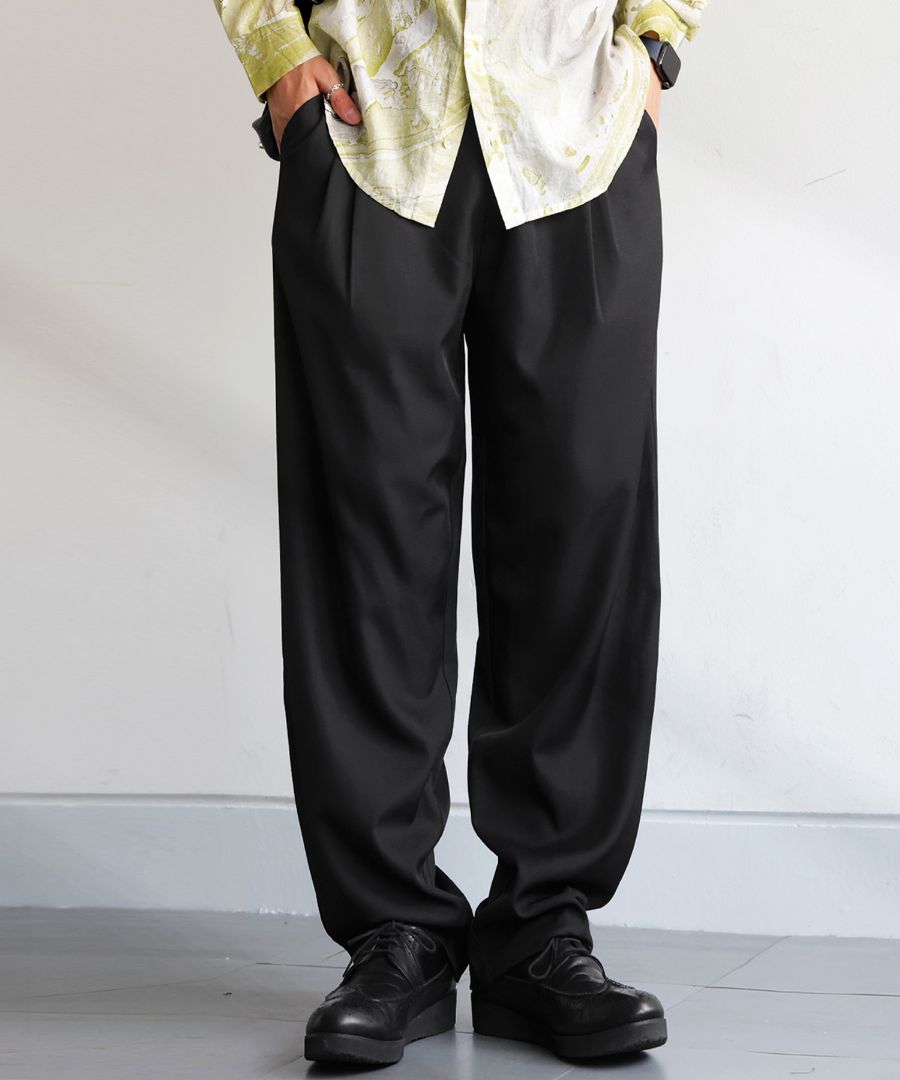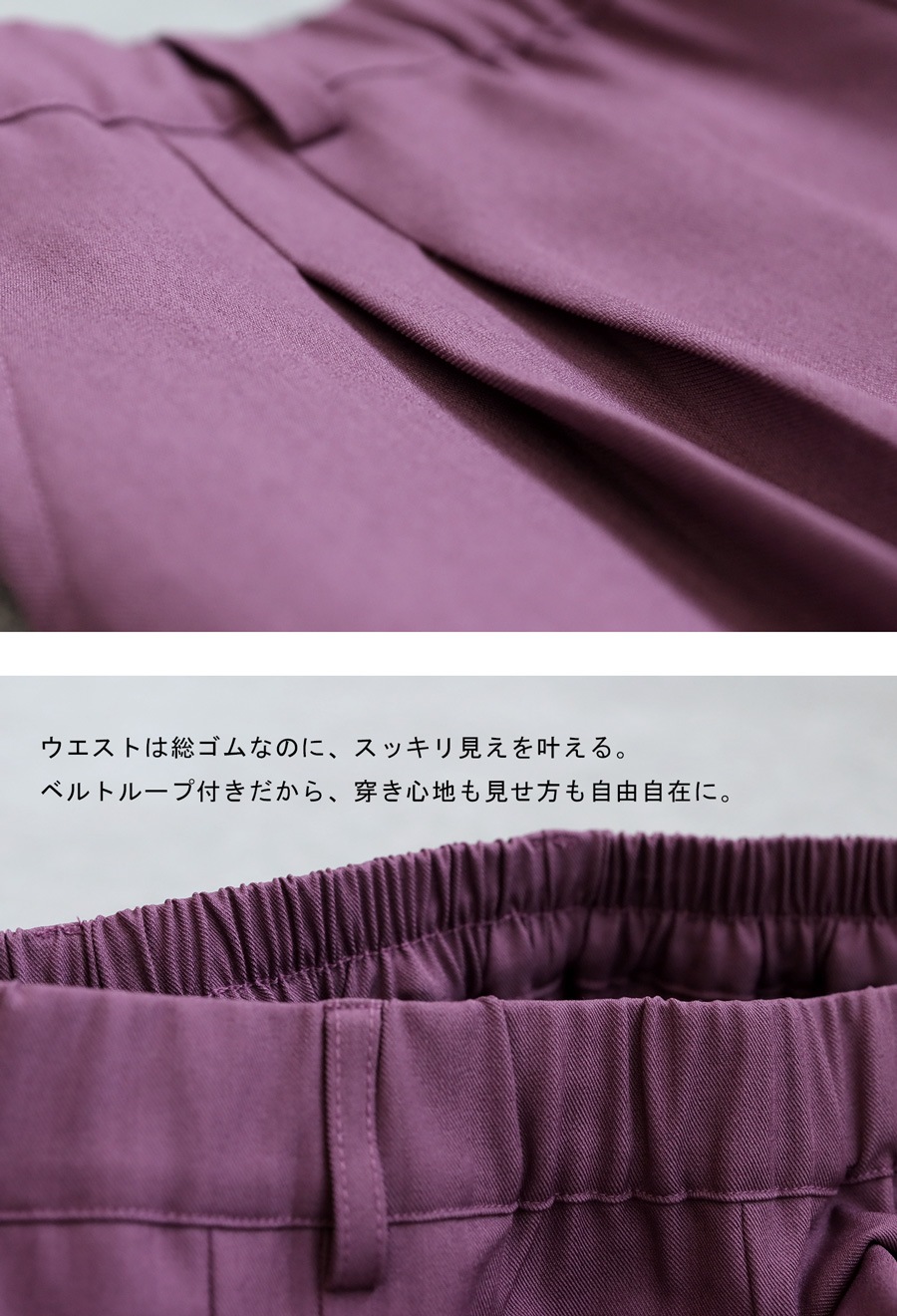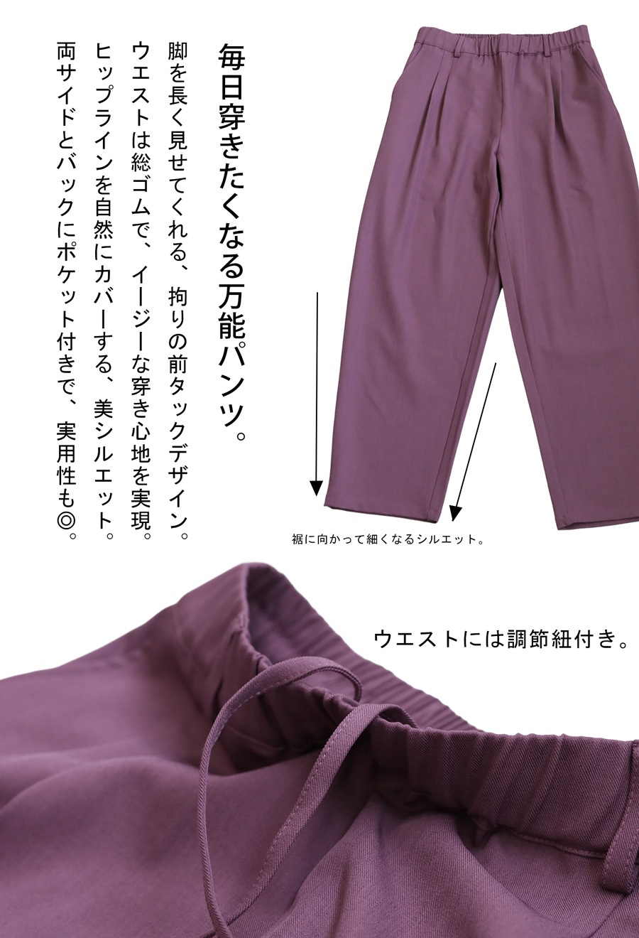 前面に入ったタックが縦のラインを生み出し、脚のラインを自然にカバーしながら美しく見せてくれます。