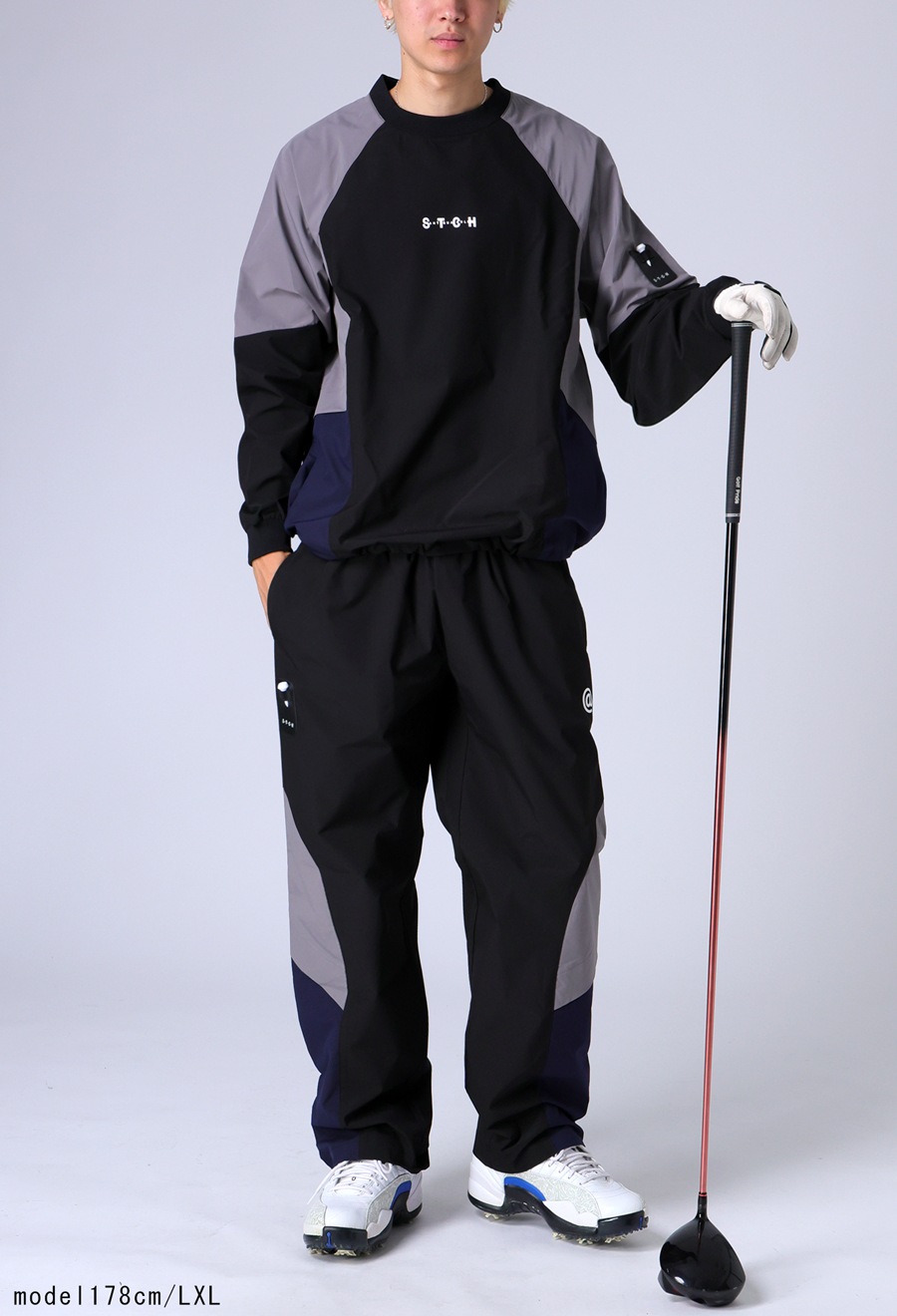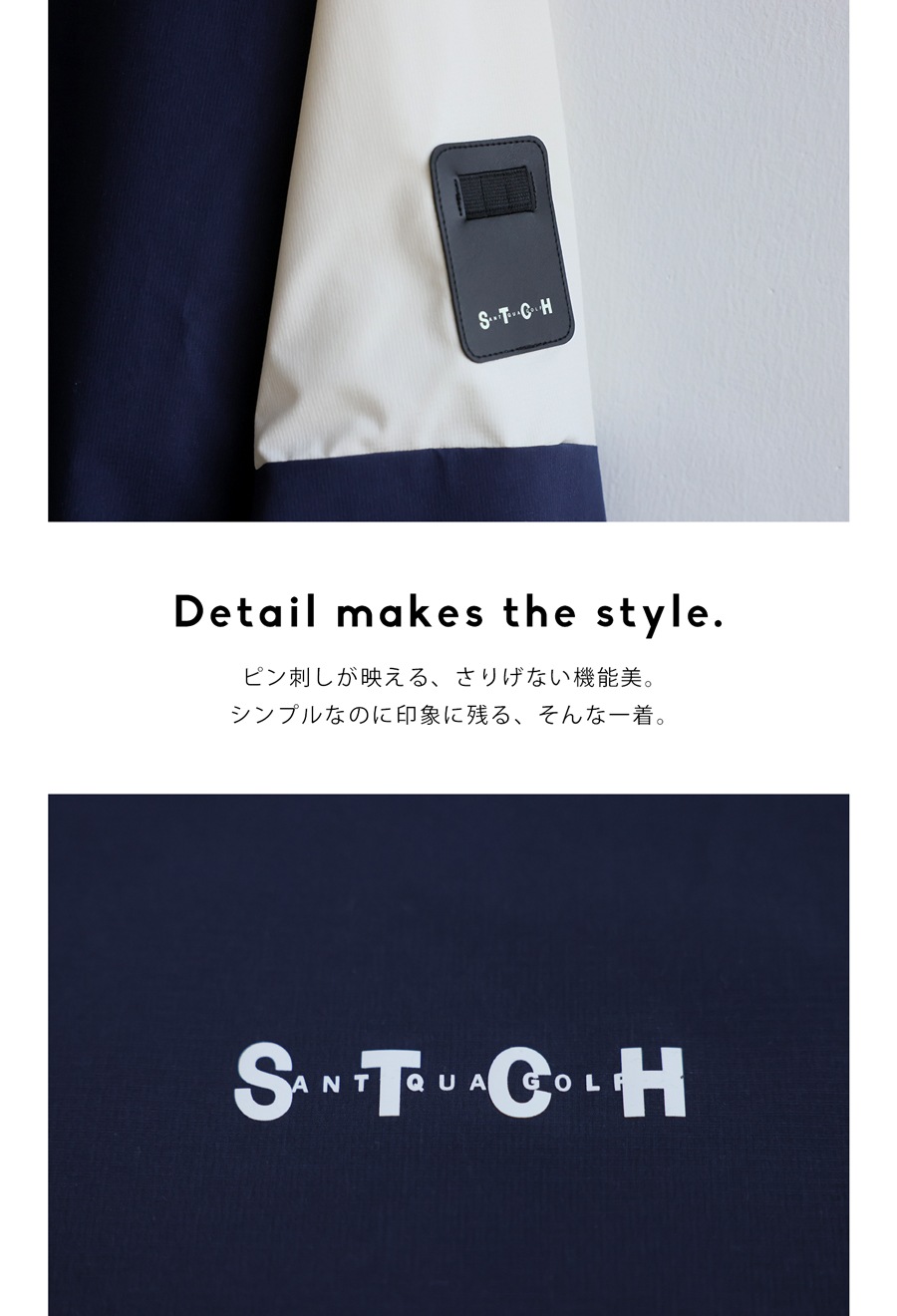 胸元にはSTCHロゴをさりげなくプリントし、袖にはレザーパッチとピンホルダーをあしらい、スポーティなムードを演出します。
