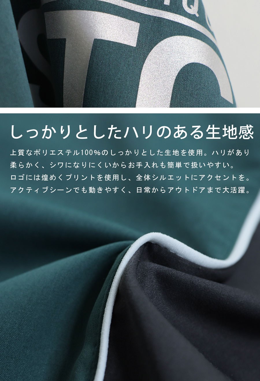 無地をベースにした配色デザインと、胸元のブランドロゴワンポイントがクールな印象を演出。