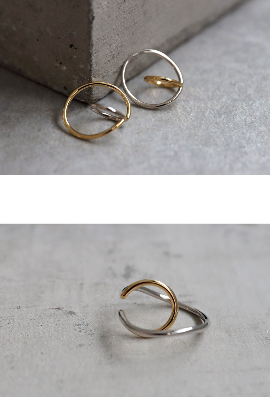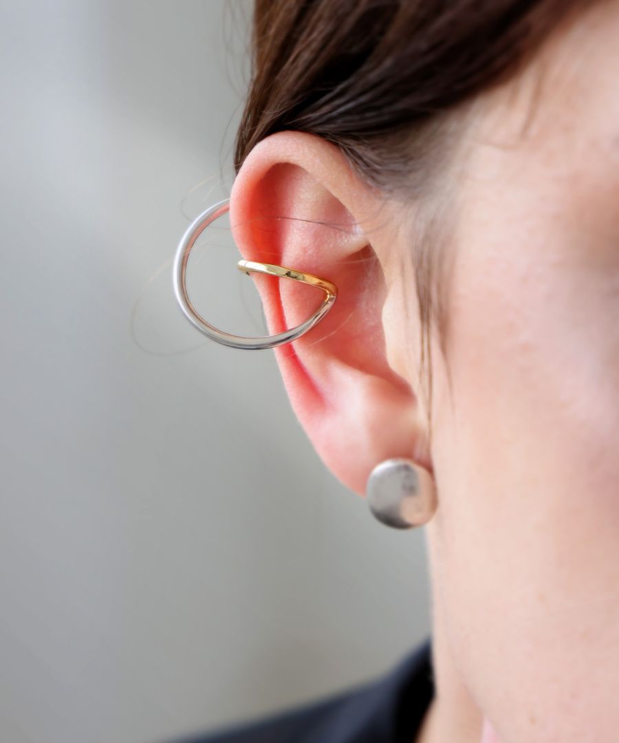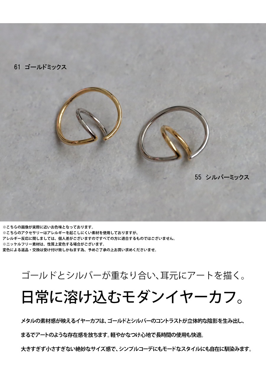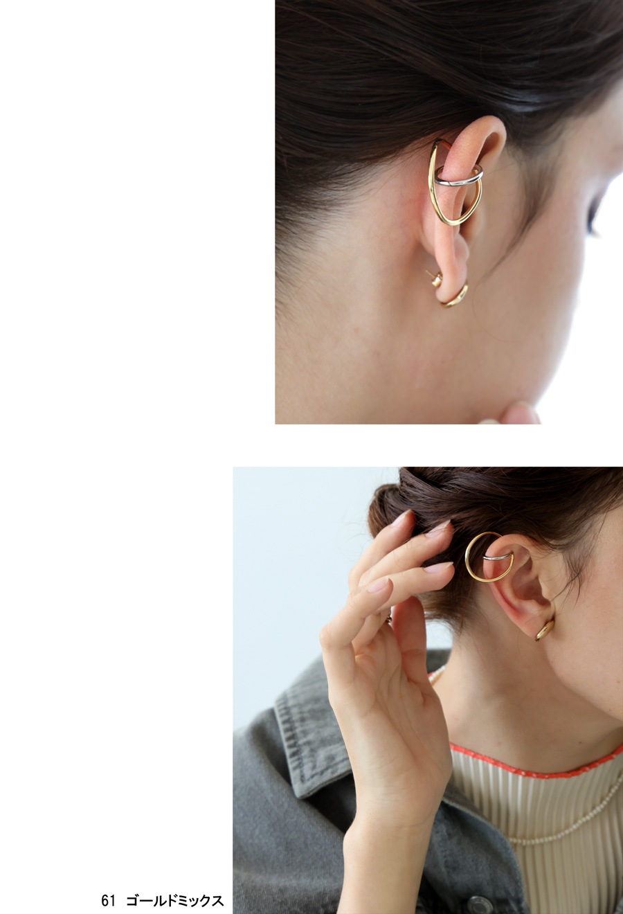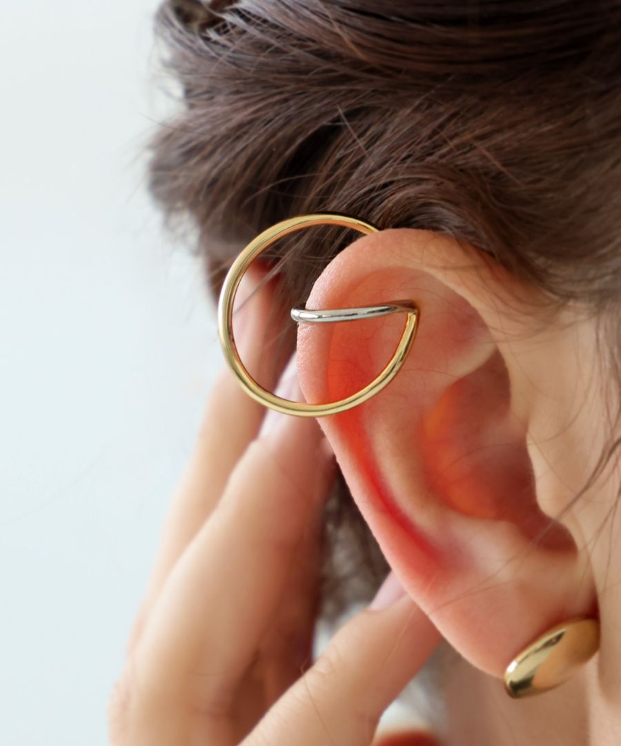 ゴールドとシルバーの配色が印象的なイヤカフは、シンプルながらも奥行きのある立体感で横顔を引き立てます。