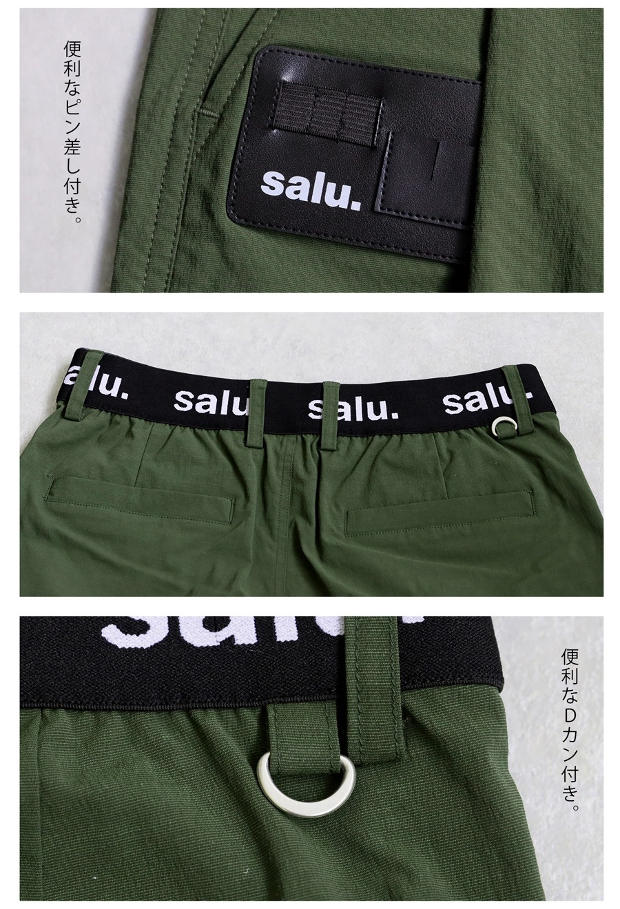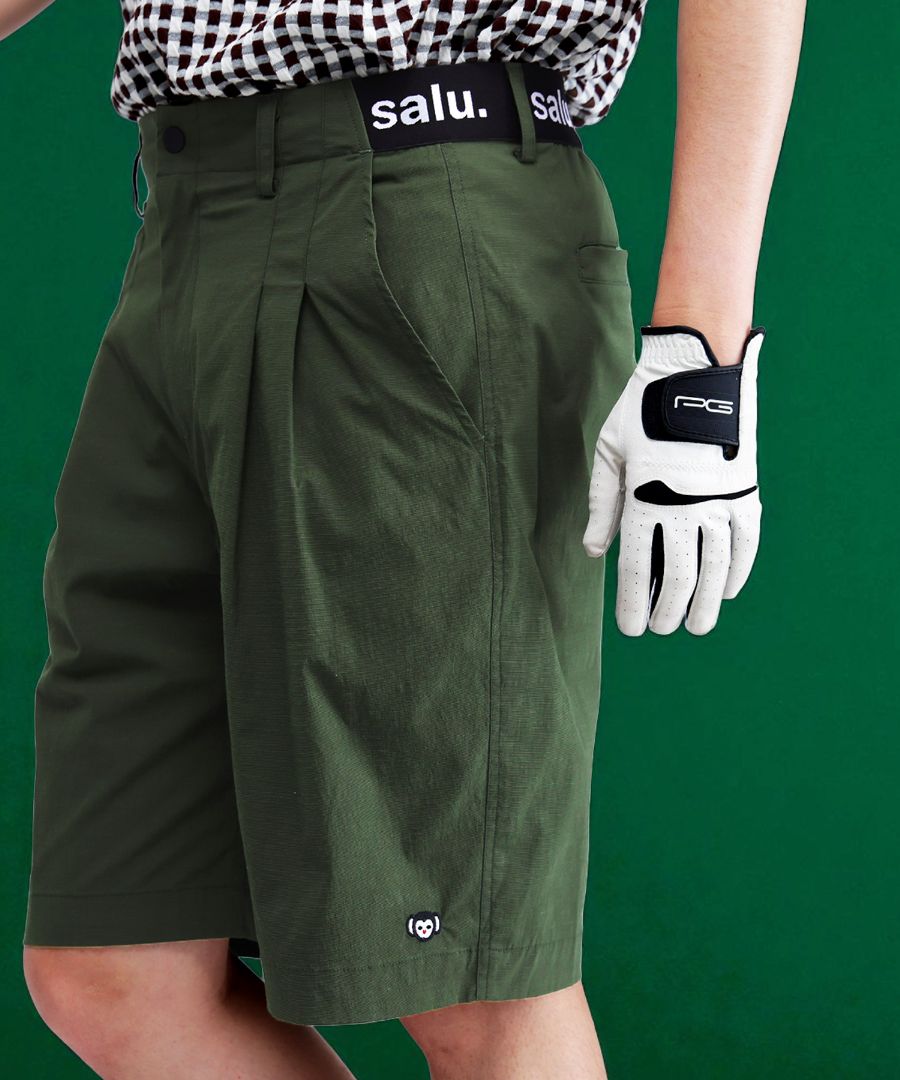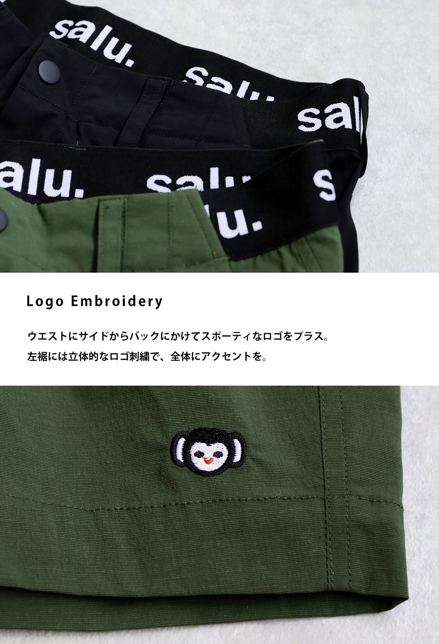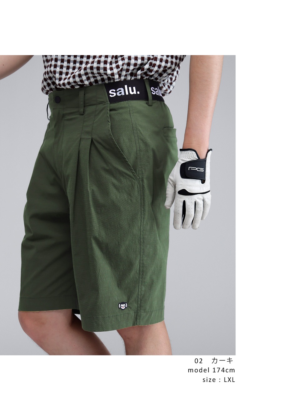 ゴルフやアウトドア、日常使いまで幅広く対応するsalu.のロゴ入り機能性ハーフパンツ。