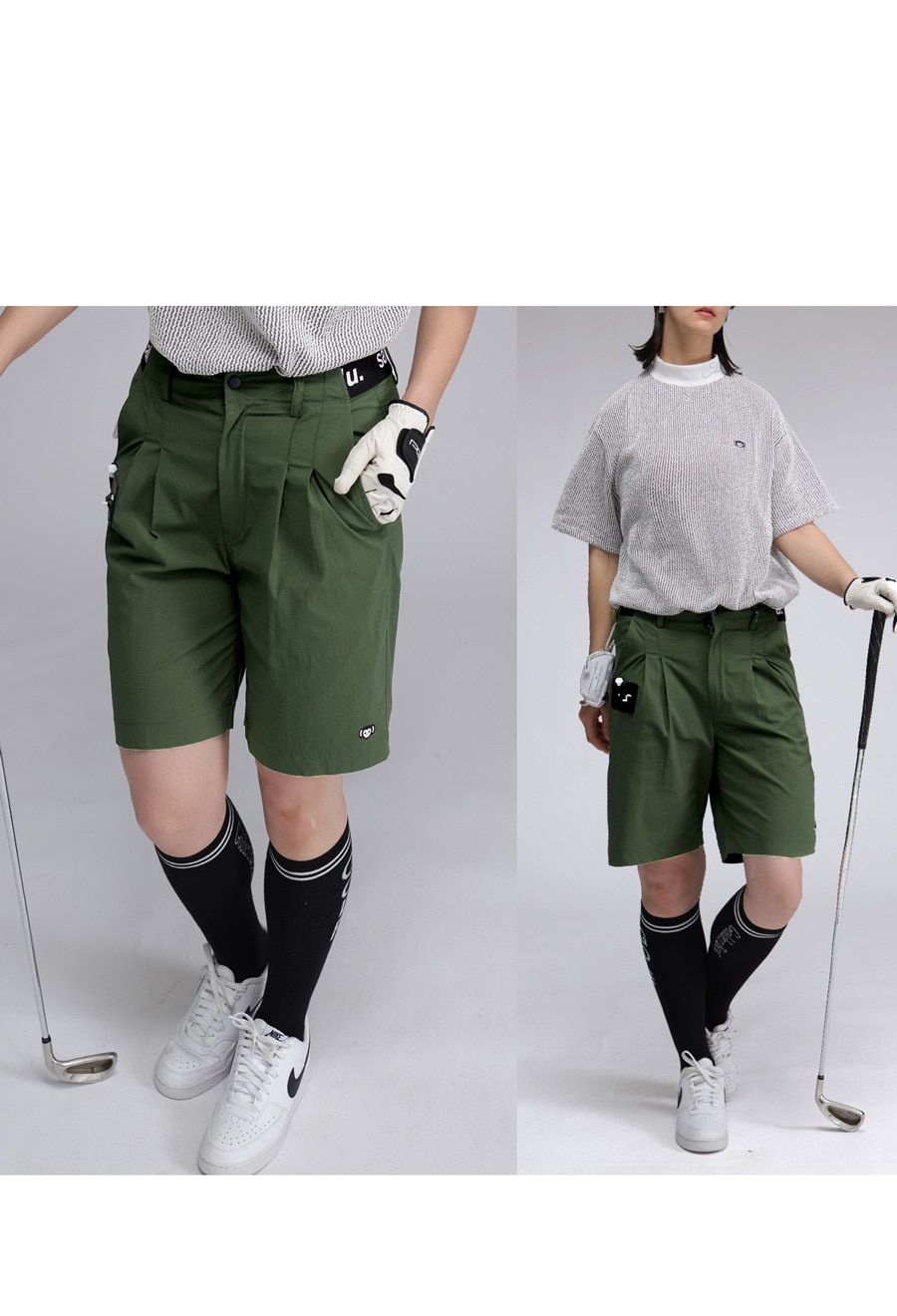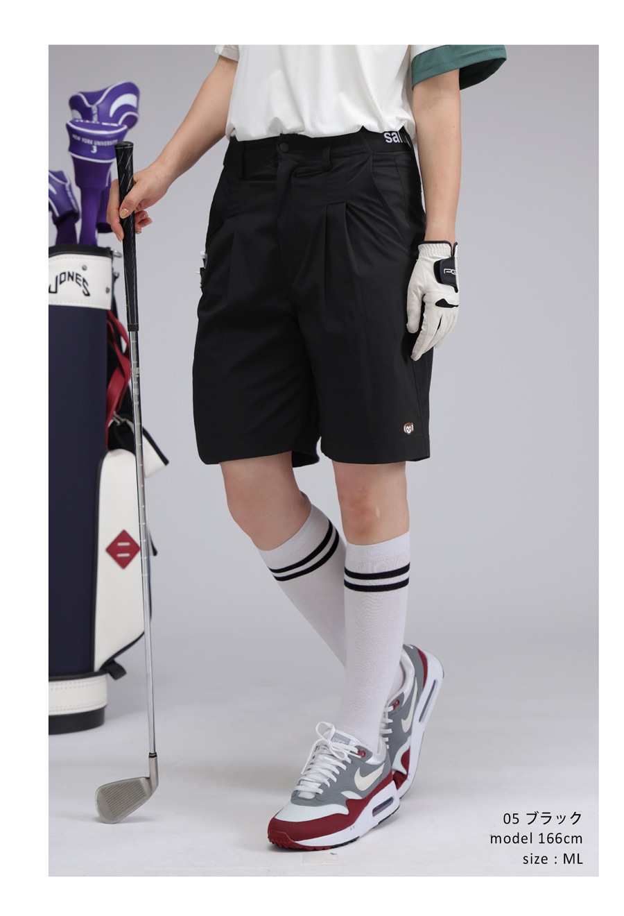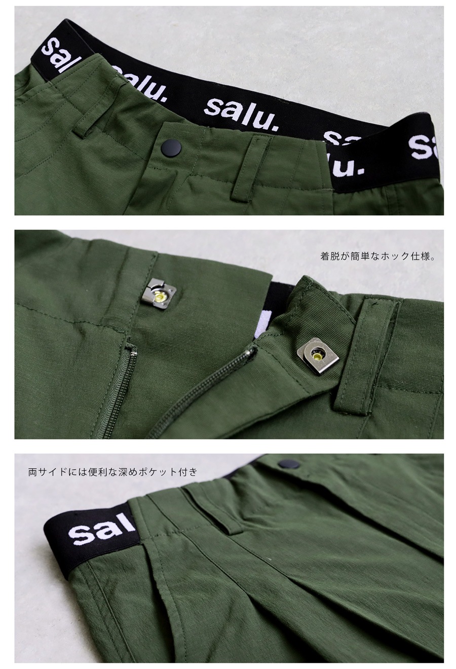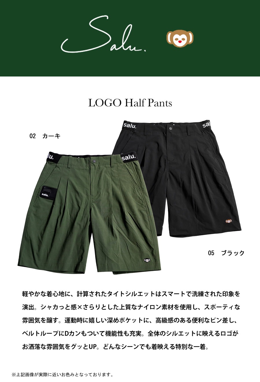 ゴルフやアウトドア、日常使いまで幅広く対応するsalu.のロゴ入り機能性ハーフパンツ。