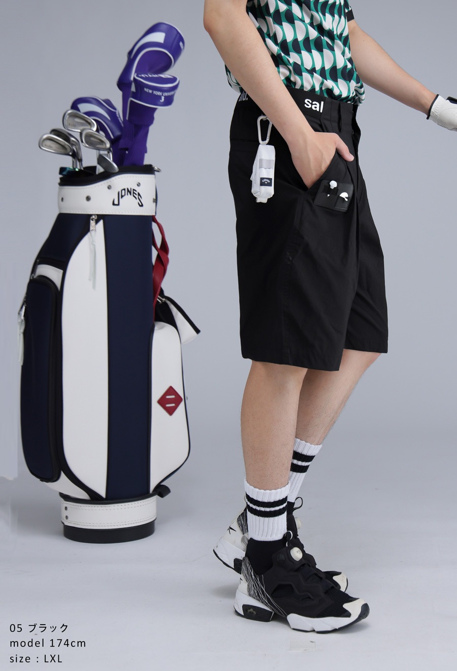 ポケットは前後4箇所に配され、スコアカードやスマホ、小物もすっきり収納。